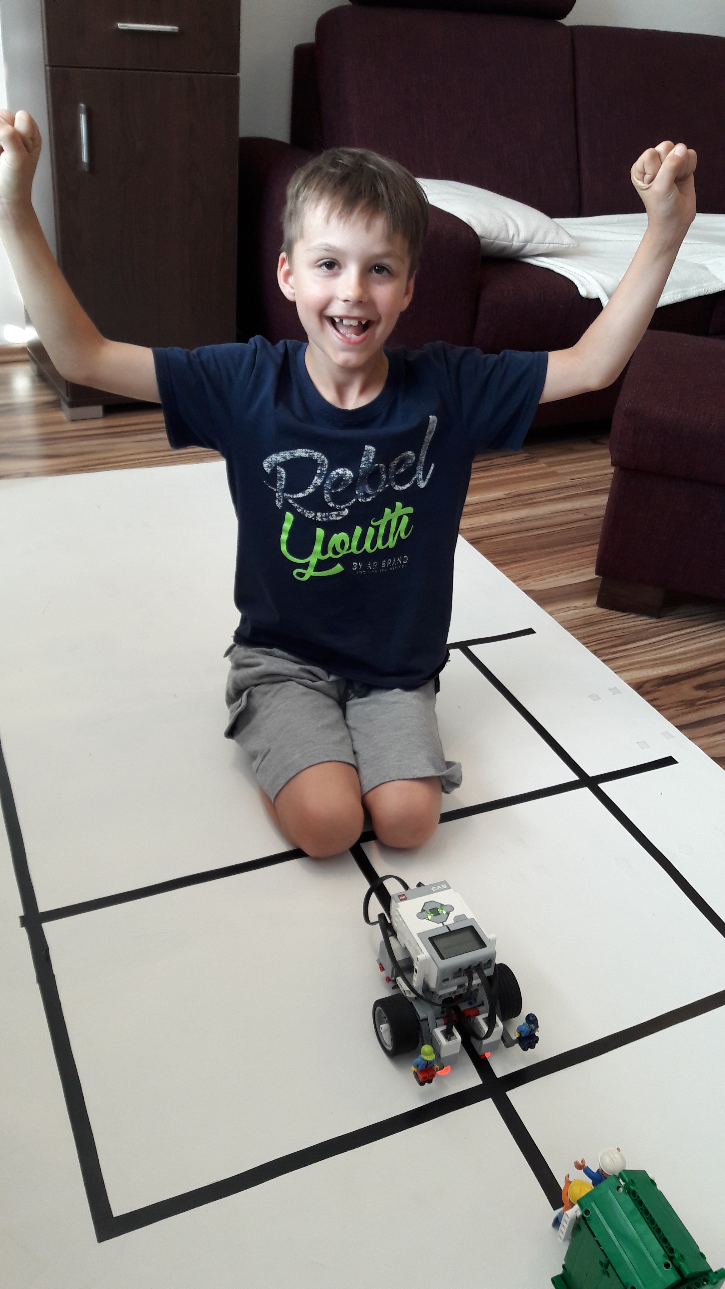 1. Pekne spravené, odporúčam pozrieť sa ako fungujú polia v ev3. Bolo povedané, pre ľubovoľný počet zákrut(resp. 1-10). 2. Za úlohu plán získavate 3b. Ukázali ste aj viaceré pokusy, čo veľmi oceňujem. 3. Je nevyhnutné, aby robot zastavil aj na zákrute, teda tam, kde vlastne žiadna križovatka nie je? Inak je to pekné riešenie aj pekne zdokumentované. 4. Hodil by sa trošku podrobnejší popis riešenia úlohy (mohol byť aj na videu). Z videa nie je úplne jasné, aké číslo reprezentuje aký smer a ako ho potom vyhodnocuje robot vzhľadom na rôzne križovatky (pretože robot prejde troma križovatkami, ale má zadané štyri smery kam sa má otočiť pri pohybe cez križovatku).