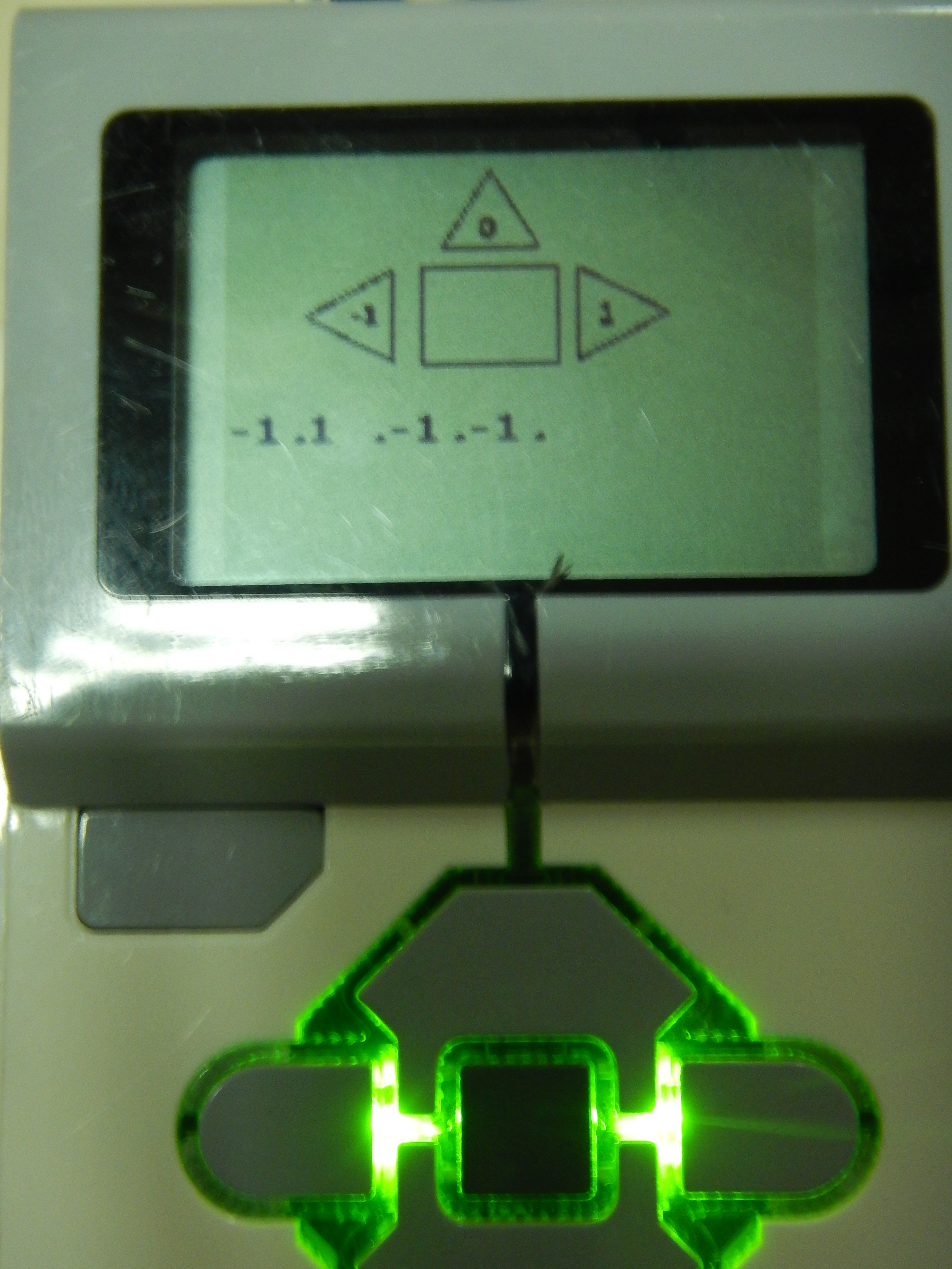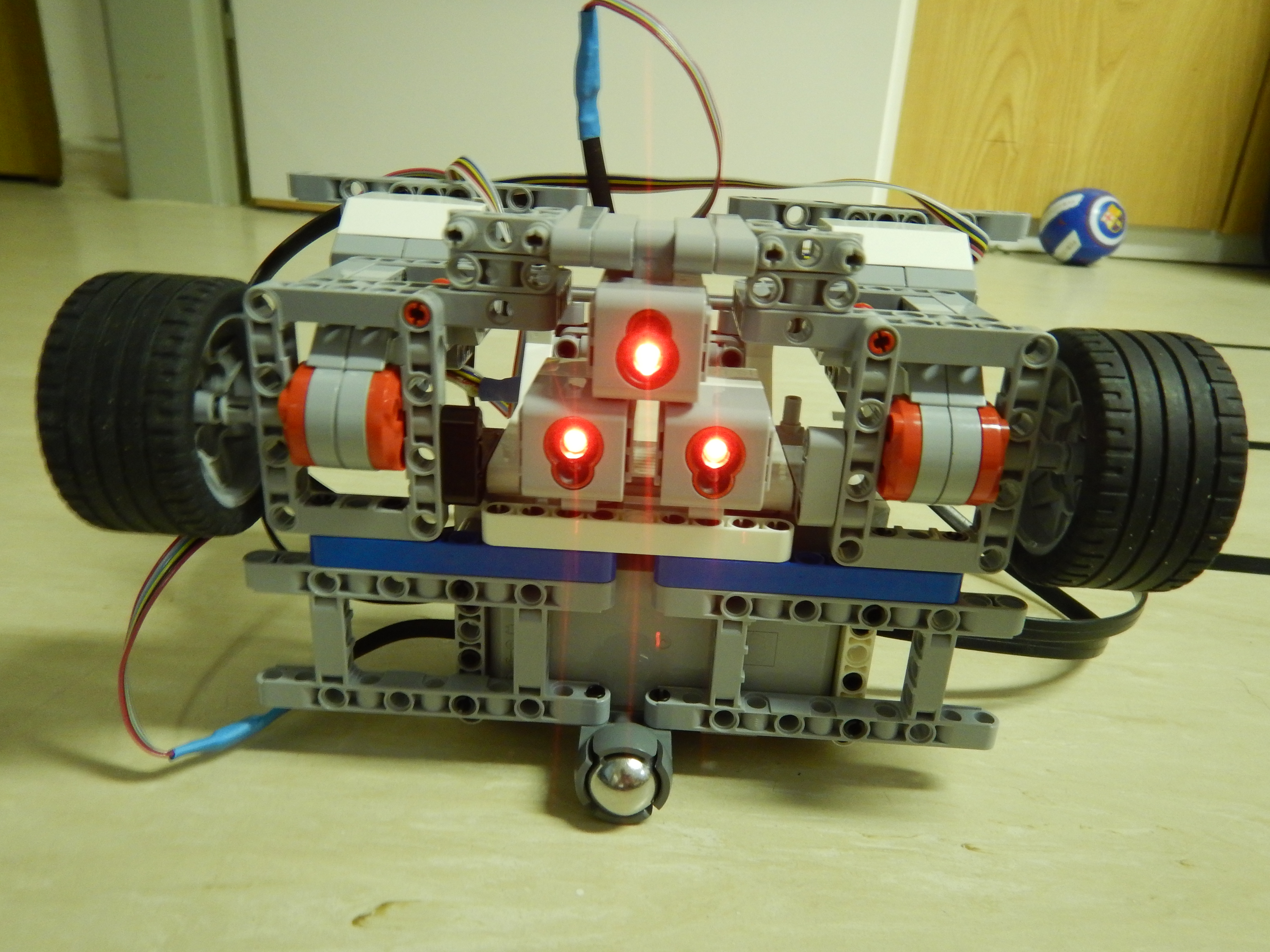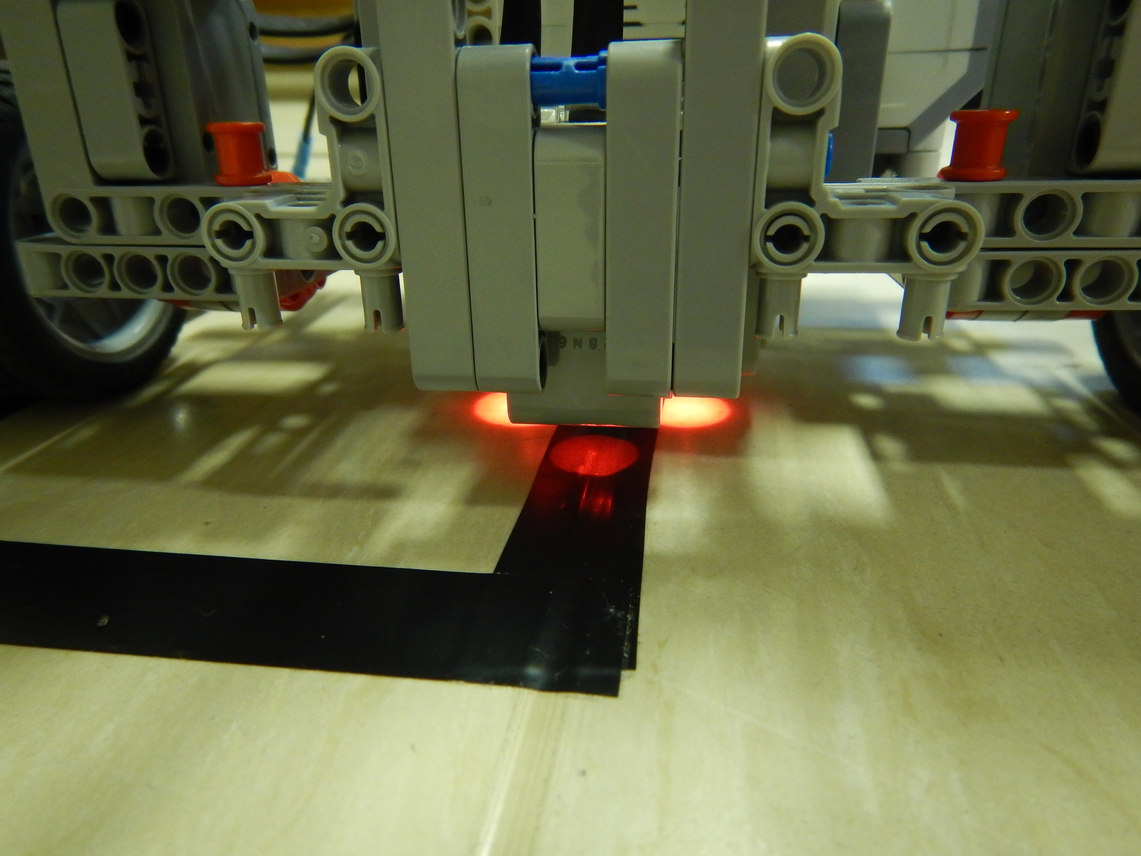 Robot sa v "bludisku" orientuje pomocou 3 senzorov. 2 zadne su na pohybovanie po ciare, predny vie pomocou 2 zadnych urcit, kde zastat a o aky typ zatacky alebo krizovatky sa jedna.