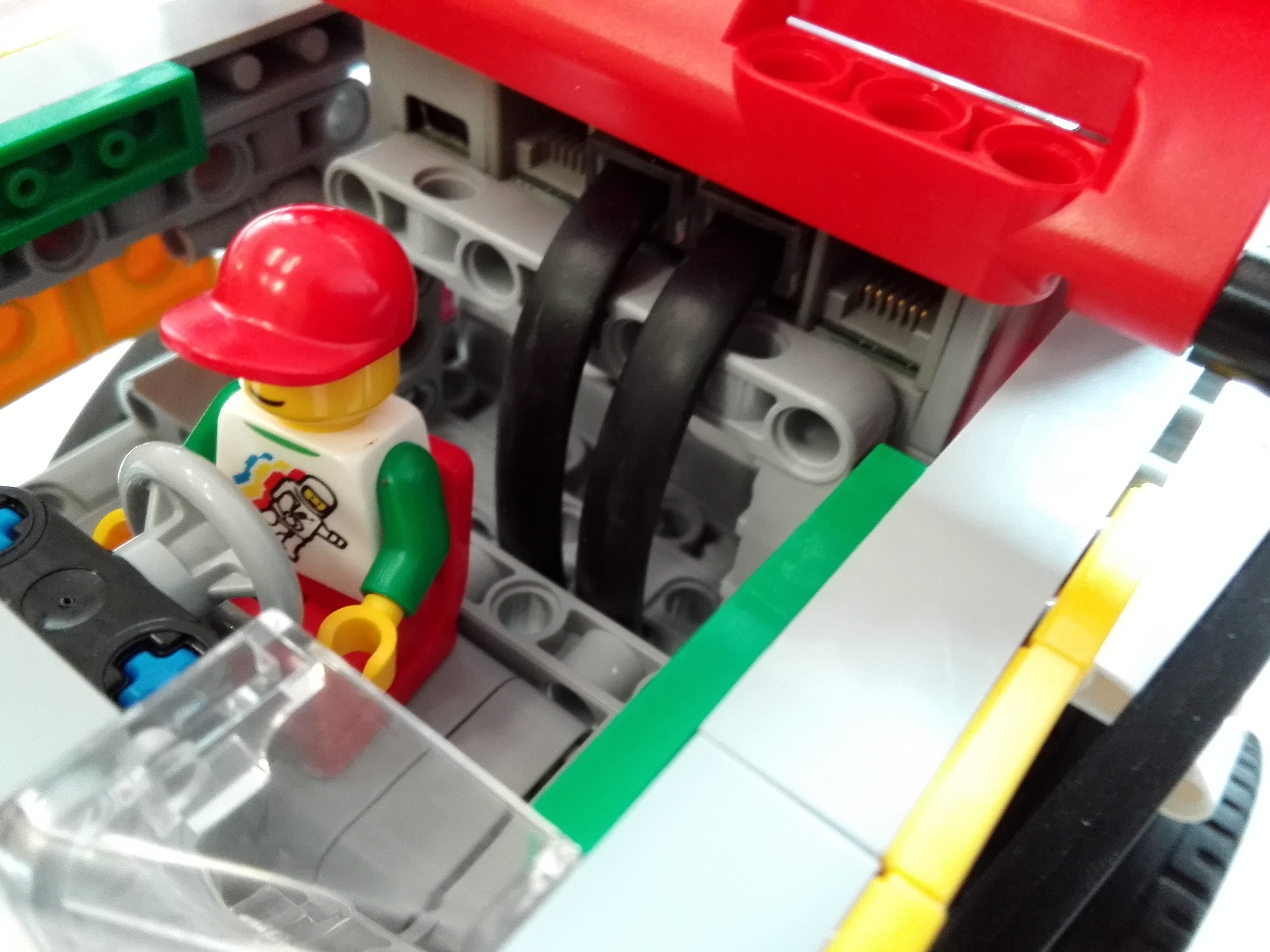 Popis riešenia: Na začiatku robota (MAZ3RUNNER) položíme na štart a spustíme program. Vtedy do EV3 bricku tlačidlami < (vľavo) a > (vpravo) naťukáme smery (tie nám nenápadne pošepkal LEGOvý panáčik umiestený na robotovi). Tými smermi má robot zabáčať pri križovatkách. Zapisujú sa do poľa logických hodnôt (plan), pričom true znamená vpravo a false znamená vľavo. Zadávanie tohoto "kódu" sa ukončí po stlačení stredového tlačidla na EV3 bricku. Dĺžku poľa si zapíšeme do premennej pocetkrizovatiek. Aby však došiel až do cieľa a nezastavil na poslednej križovatke, pripočíta 1. Následne sa robot pohne dopredu, pričom začnú dva vnútorné farebné senzory snímať čiernu pásku a robot bude sledovať čiaru. Pohybuje sa dovtedy, dokým jeden z vonkajších farebných senzorov nezachytí čiernu pásku (do premennej kam si uložíme, či to bol ten vpravo). Ak ju zachytí, začne sa otáčať (až po 360°) a zároveň sníma s farebným senzorom (port 4), koľkokrát zaznamenal čiernu farbu, teda čiaru. Ak ich zachytí 2, je to len zákruta a po tejto informácii sa otočí správnym smerom (premenná kam) a pokračuje v sledovaní čiernej pásky. Pokiaľ zachytí 3 čiary, vie, že ide o križovatku a otočí sa podľa zadaného smeru (aktuálny prvok poľa plan). Počas celého programu nezávisle beží loop, ktorý čaká, dokým robot uvidí červenú farbu – čiaru, čo je koniec trate.