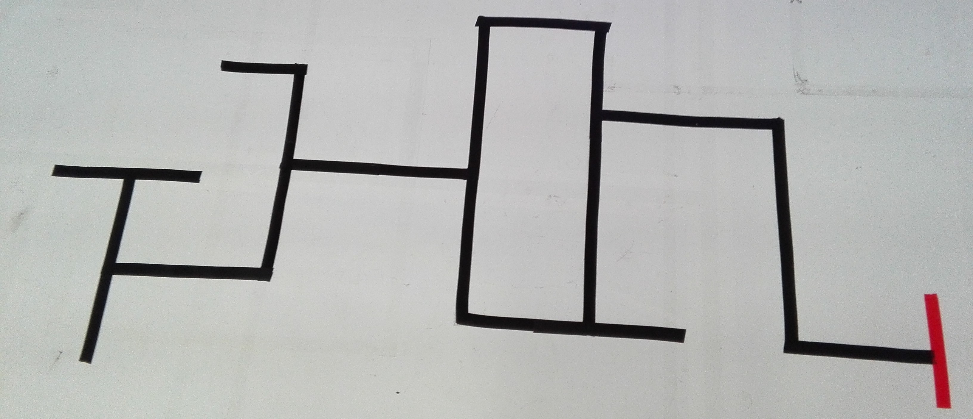 Bludisko: Naše bludisko z čiernej pásky má 5 štartov, 6 križovatiek (pri každom štarte prechádza cez iný počet križovatiek – 2 až 6), 7 zákrut a aj 1 obdĺžnikový objazd, pri ktorom má robot 2 možnosti prejazdu. Štart je na začiatku každej čiary, cieľ je označený červenou páskou. Všetky zákruty a križovatky sú pravouhlé. Križovatky sú navrhnuté tak, aby sa robot vedel na každej križovatke rozhodnúť, či má pokračovať vpravo alebo vľavo.