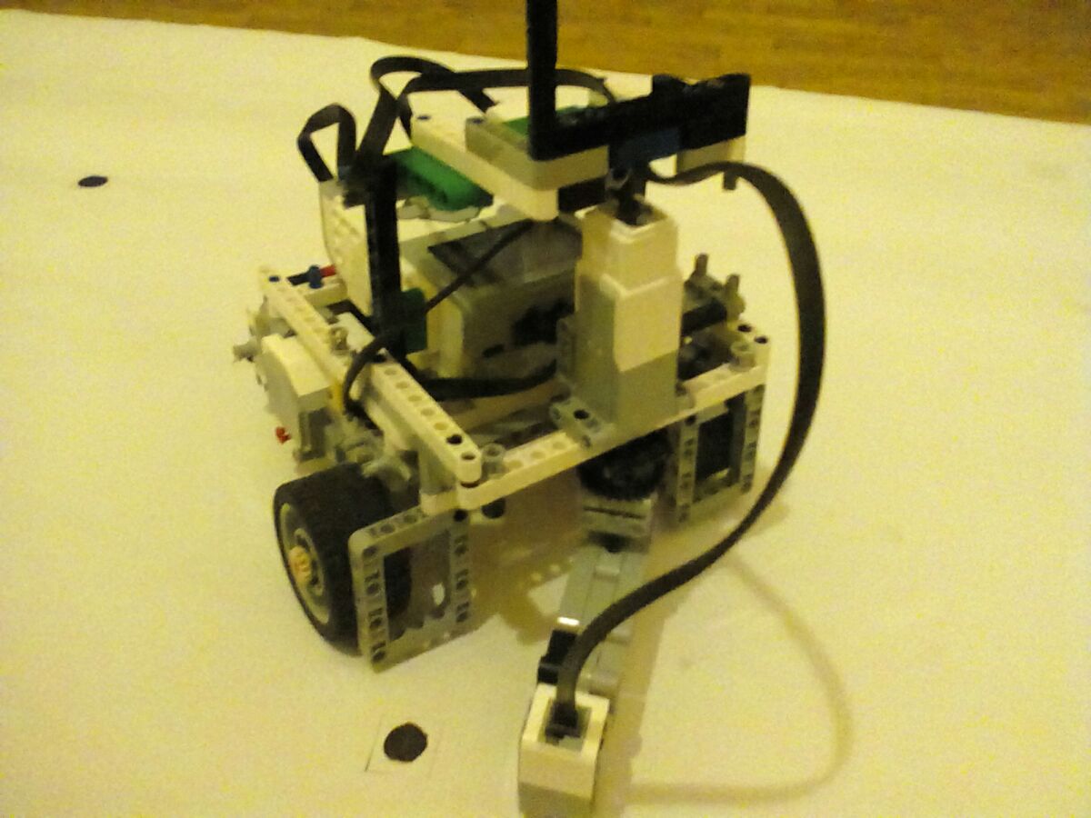 robot sa pohybuje smerom dopredu pomocou veľkých motorov, zatiaľčo na ramene ovládanom malým motorom má upnutý svetelný senzor a pohybuje ním stále zľava doprava a naspäť, až dokým nezaznamená čiernu. Vtedy zastaví slučka, robot zastane, aj rameno a zaznie zvukopvý signál (vybuchnutie míny) a potom sa znovu spustí pohyb vpred a otáčanie ramena so sentorom. Na konci mínového poľa je otočenie robota napjr o 90 stupňov, cúvnutie a otočenie o ďalších 90 stupňov - to pomocou gyra. Robot pokračuje ďalšiu cestu rovnakým spôsobom, až kým neprejde celú cestu.
