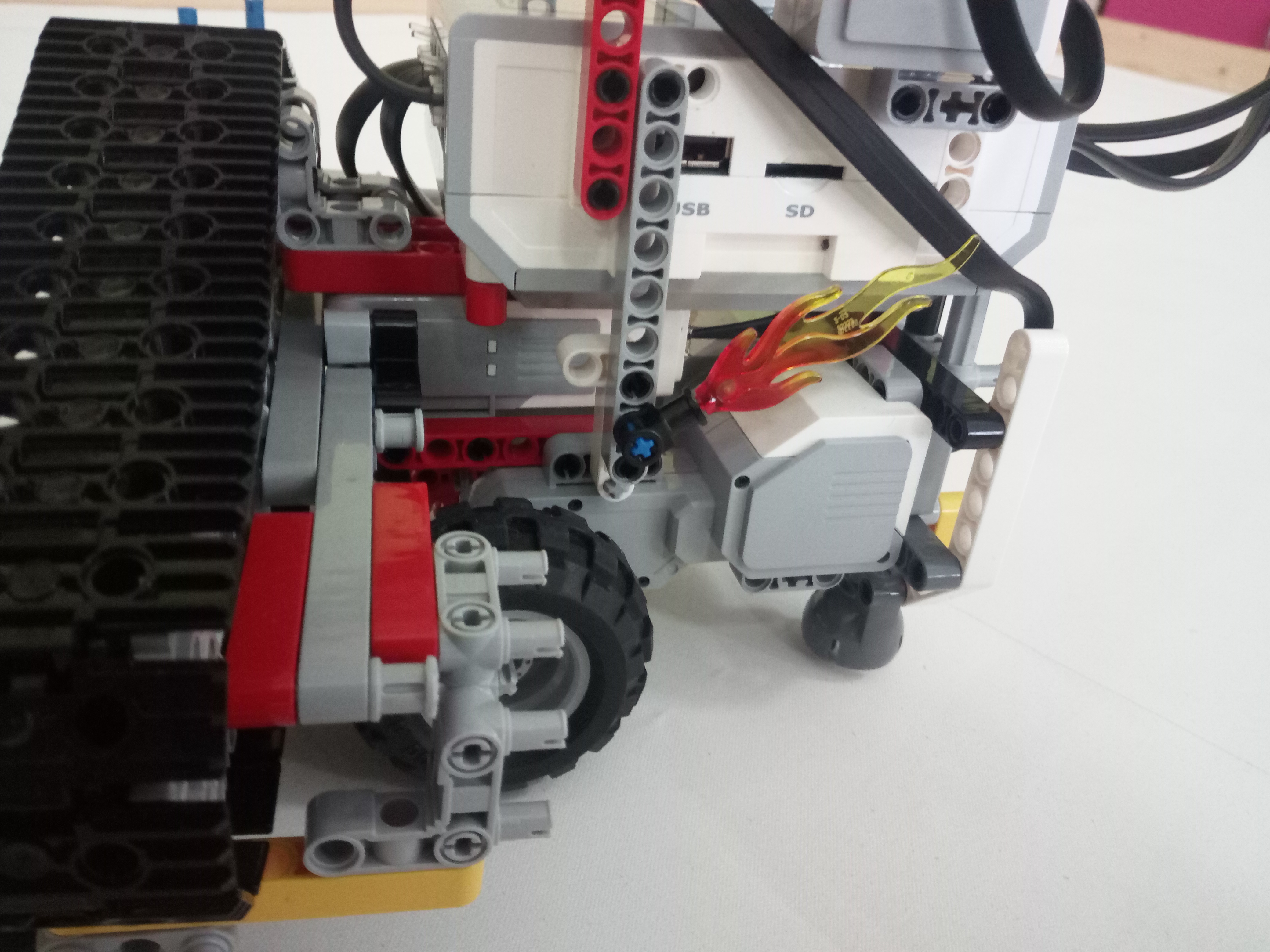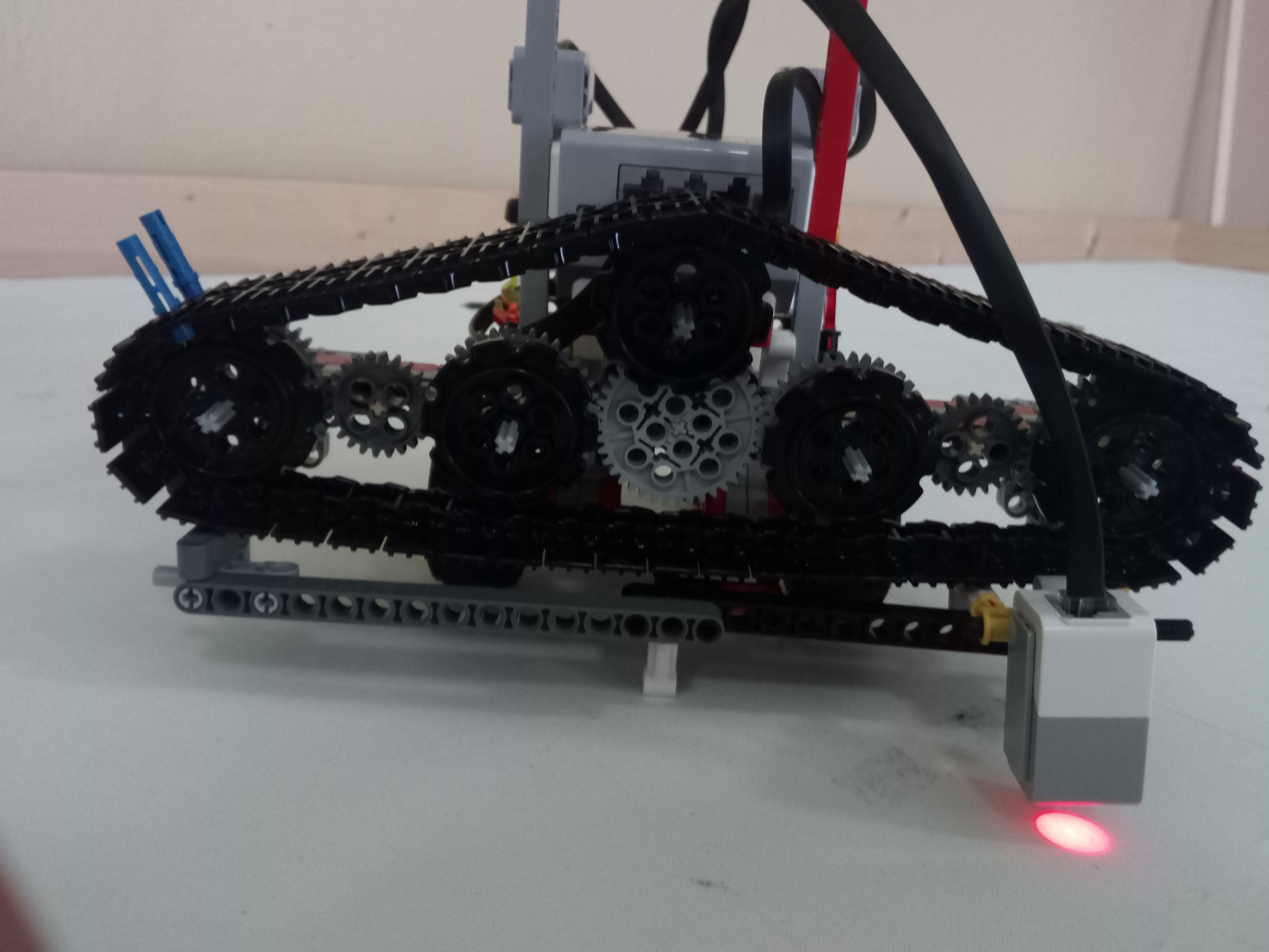 Náš robot sa skladá z podvozku, 2 gyroskopov, prednej posuvnej časti s color senzorom. Program funguje tak, že robot vždy ide vpred o šírku senzora. Potom prejde senzorom s jednej strany na druhú a keď uvidí čiernu tak vydá zvukový signál. Na presnejší pohyb vpred používame aritmetický priemer gyroskopov. Tak isto používame tento priemer aj na otáčanie o 90 stupňov. Na posúvanie senzora použivame lego pás ktorý poháňajú 4 sprevodované kolesá ktoré poháňa lego medium motor.