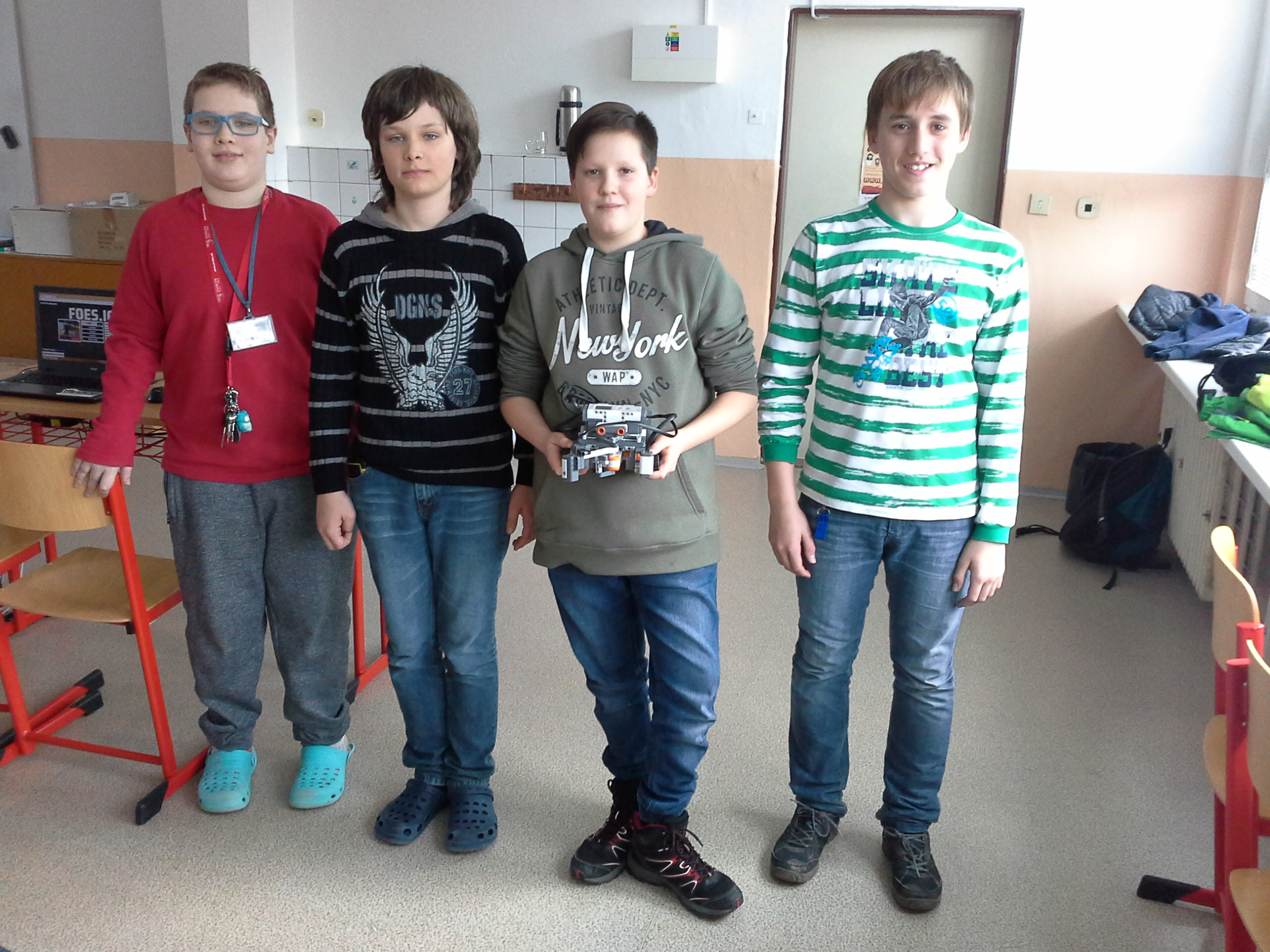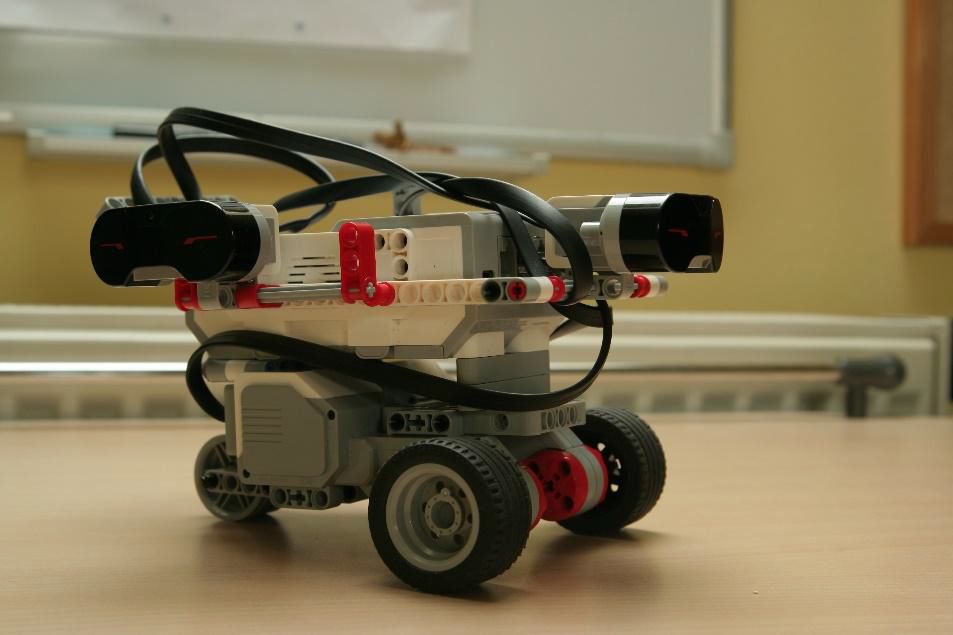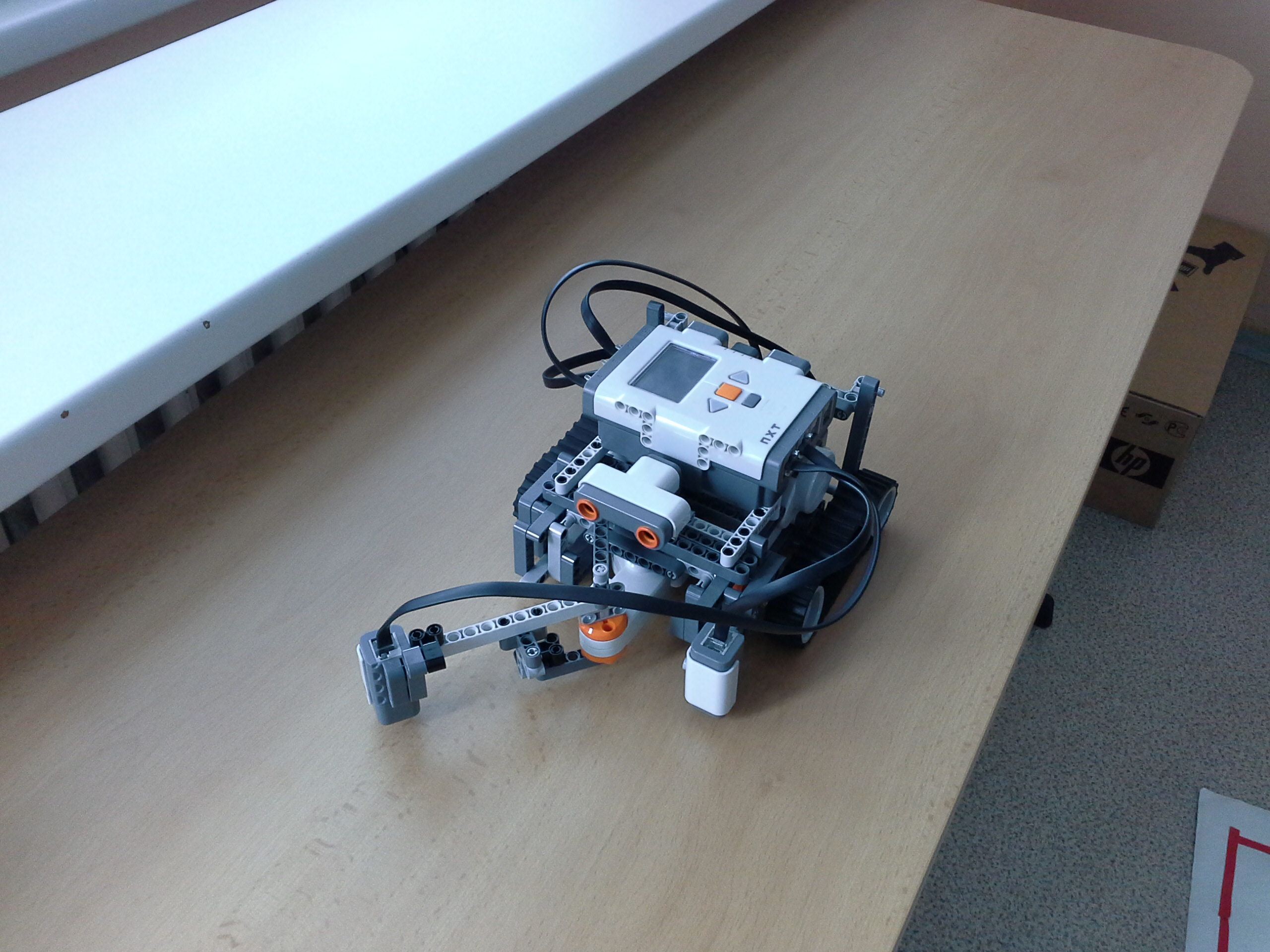 Popis konštrukcie robota:Konštrukcia robota je jednoduchá – obsahuje dva veľké motory, robot sa otáča ich protipohybom. Stojí na troch kolesách – dve predné sú poháňané motormi, v zadnej časti robota sa nachádza malé vyvažovacie koliesko, ktoré umožňuje priame otočenie robota na mieste. Robot obsahuje 3 senzory:2x infračervený senzor – sníma či sa vpravo od robota alebo pred ním nachádza stenaGyroskopický senzor – umožňuje presné otáčanie robota v bludisku o 90 stupňovStručný popis programu:Program obsahuje logickú podmienku, ktorá vyhodnocuje či sa vpravo alebo pred robotom nachádza stena. Ak v pravo stenu nezaznamená, automaticky sa otáča doprava a pokračuje bludiskom. Ak predný senzor zaregistruje stenu, robot sa otočí podľa toho či vpravo deteguje stenu alebo nie. Ak nie, otočí sa vpravo, ak áno, vľavo. Tento cyklus robot opakuje až kým ho na konci bludiska nezastavíme.V škole sme si vytvorili jednoduché bludisko z kartónových krabíc. Takýmto spôsobom by mal robot prejsť každé bludisko s pravidelnými rozmermi.