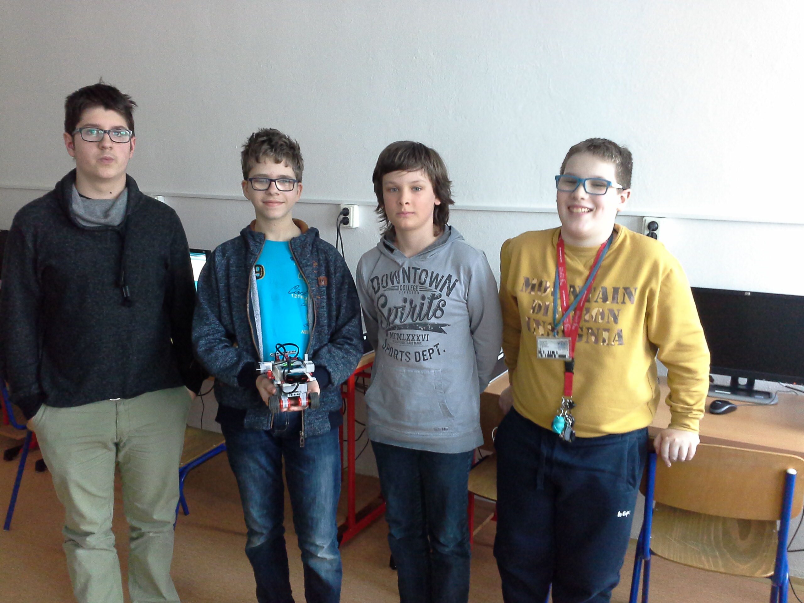 Spoločné poznámky pre všetkých: Niektorí si povedali, že robot je dvojrozmerný objekt a žije v rovine a steny vytvorili len obrazcom v rovine. Už ste videli takú jaskyňu? :-) Ako by tam vyzerali stalagnity, stalagtity a stalagnáty? :) No dobre, rozhodcovia to nebrali do úvahy, keďže ste si aj tak zadanie mohli vysvetliť, aj keď mne sa samozrejme viac páčia naozajstné jaskyne, nielen také nakreslené na papieri. :) V skutočnej jaskyni je totiž úloha náročnejšia, ako sa na prvý pohľad zdá - ultrazvukový senzor nevidí len jedným smerom podľa úsečky, ale zachytáva odrazy z celého kužela pred sebou, naviac meranie je ovplyvnené uhlom, pod ktorým je prekážka naklonená a tak jedno meranie senzorom hovorí len o približnej vzdialenosti k prekážke a skoro vôbec nič o tom, ako sme k nej natočení. Napriek tomu aj túto úlohu niektorí zvládli a nahrali nám skvelé riešenie! Ďakujeme! Šestka: dobré riešenie! Vidieť, že logika za rozhodovaním robota nie je až taká jednoduchá. Zaujalo ma ako sa ten robot otáča :-) Očakával by som, že zvislá os, okolo ktorej sa bude otáčať bude v strede medzi otáčajúcimi sa kolesami, ale tu je prakticky na zadnom opornom koliesku. To znamená, že na predných kolesách je priveľmi malá váha a ťažisko je príliš vzadu. V tejto úlohe to až tak nevadí, ale s takouto konštrukciou robota v súťaži, kde sú potrebné pomerne presné pohyby nepochodíte, lebo robot sa otáča šmykom - a tak rovnaká otočka dopadne väčšinou rôzne, keďže na konštantné trenie kolies a povrchu ihriska sa nedá spoľahnúť. Tešíme sa na ďalšie riešenia! Rozhodovia ohodnotili riešenie takto: 1. Za úlohu Prieskum jaskyne získavate 2.7 boda, máte pekný obrázok tímu, obrázok robota a robot prejde samostatne takmer celým bludiskom. Po otočení smerom k ľavej stene sa robot rozbehol smerom k nej a nabúral. Ultrazvukový senzor meria správne až od vzdialenosti asi 4 cm a mal by byť namontovaný tak, aby sa bližšie ku stene nemohol dostať. 2. Jaskyňu ste preskúmali pekne, škoda že robot nie je trocha rýchlejší, mohol by byť. A tiež by mohol chodiť trocha poriadnejšie okolo stien. Škoda, že sme na videu nevideli celú jazdu, nemuseli ste to na konci ustrihnúť. 3. Na videu nie je zaznamenaný východ z bludiska (video sa končí pár sekúnd pred vyjdením - robot však smeroval k východu, alebo skôr k stene veľa východu). Inak ok.