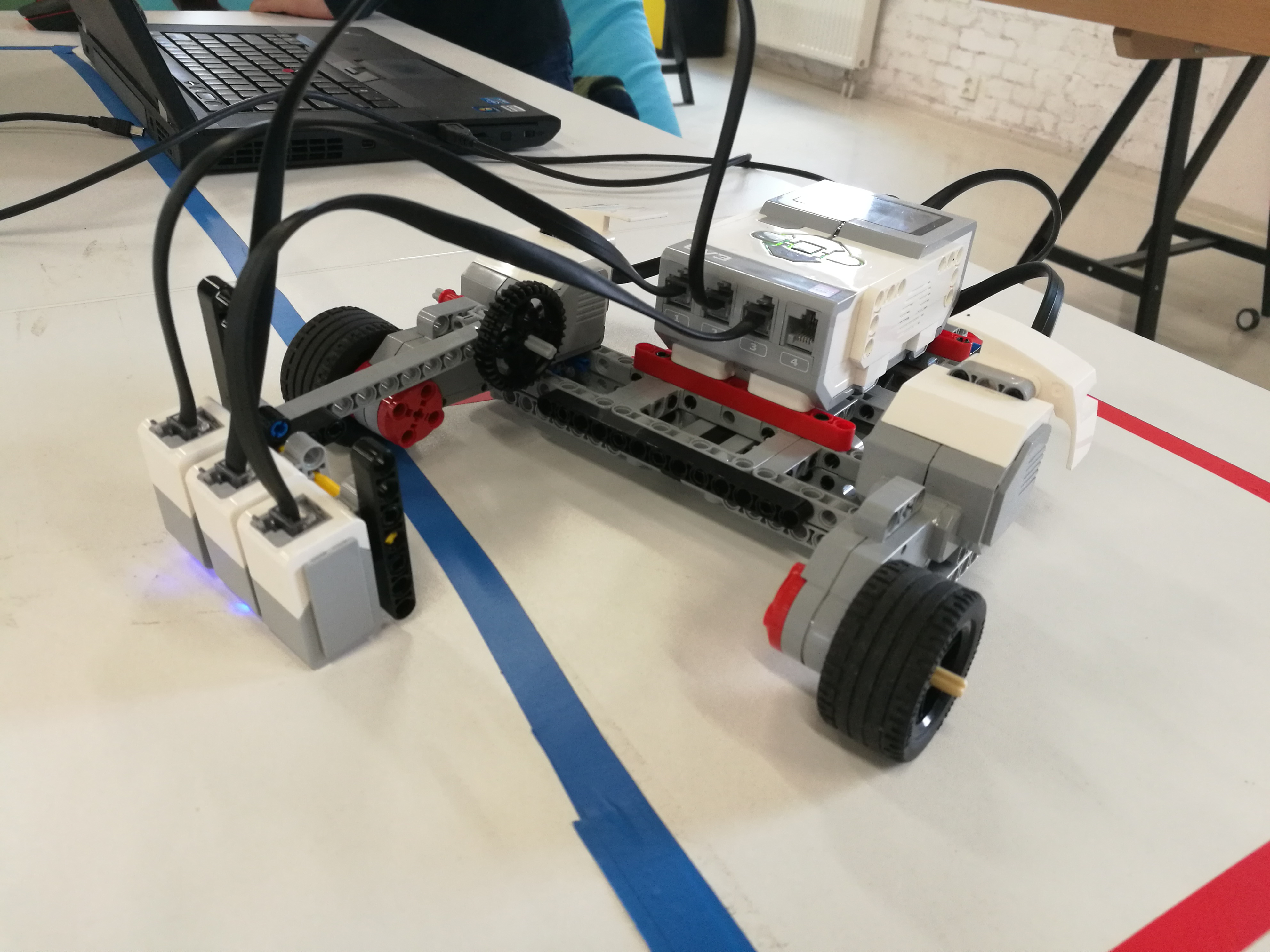 Náš robot je vybavený 3 farebnými senzormi. Pretože míny majú šírku 2 cm,vzdialenosť stredov svetelných senzorov má byť tiež najviac 2 cm, preto sme ich museli namontovať tesne vedľa seba. Takto zabezbečíme aby nám neunikla ani jedna mína.