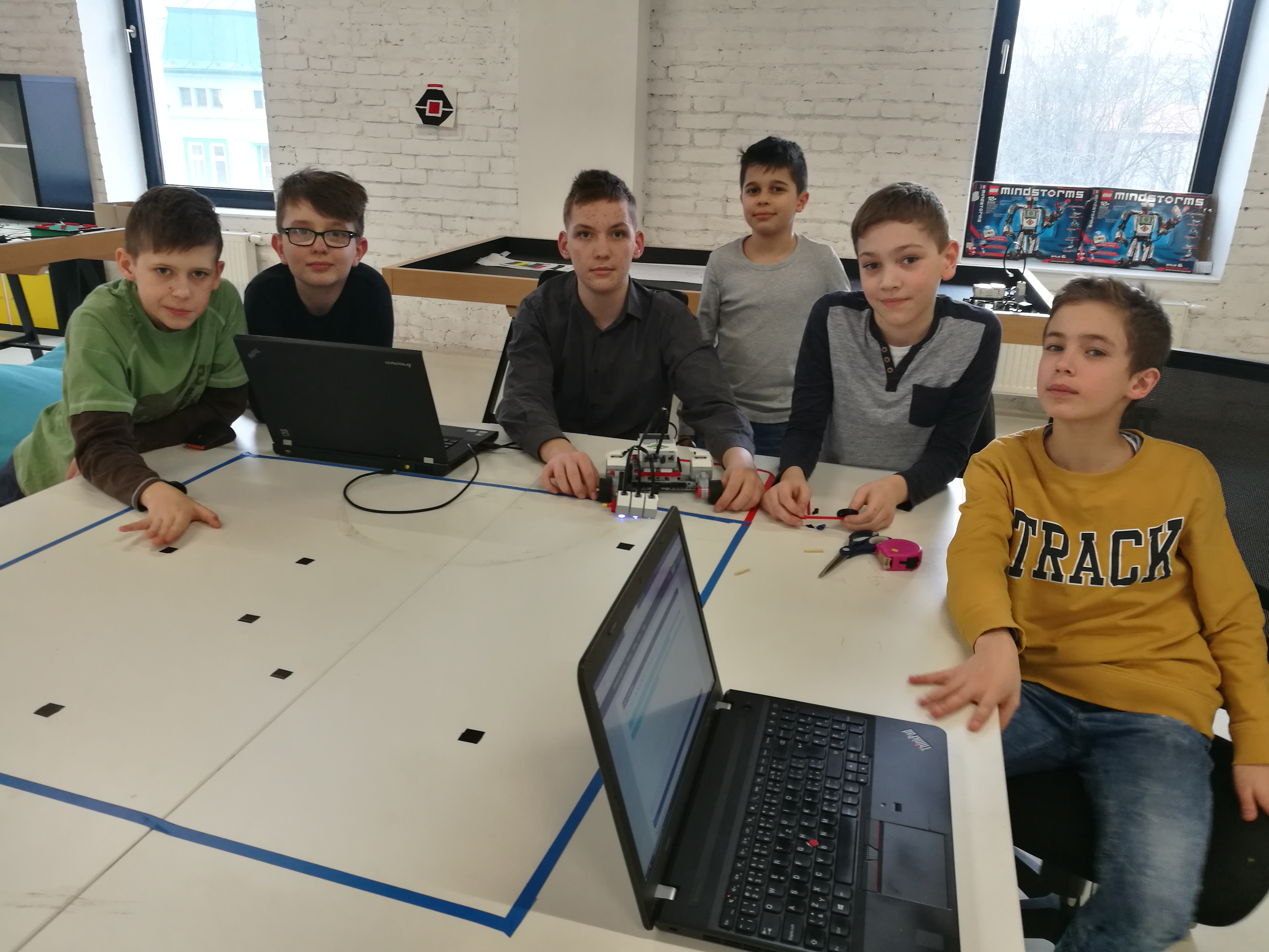 Spoločné poznámky pre všetkých: viacerí si neprečítali zadanie poriadne: robot mal vojsť do štvorca so stranou 25cm a ihrisko nemalo byť ohraničené čiernou ani inou čiarou - ak ste ju použili iba na znázornenie okrajov, tak fajn, ale nemala byť použitá na detekciu okraja. Áaa, biela plocha mala byť na podlahe, ale to nie je také podstatné. :-) LightLab: Vyzeráte ako skvelý tím vo výbornom prostredí. Hneď by som sa prihlásil do tímu, keby som bol vo vašom veku! A riešenie je pekné a názorné, aj keď ten podmieňovací spôsob v záverečnom titulku pobavil. :) Rozhodcovia Vaše riešenie ohodnotili takto: 1. Za úlohu Minesweeper získavate 3b. Veľmi pekne ste spísali popis riešenia. Robot pracuje podla zadania takže pri nájdení míny sa viditeľne zastaví a vydá zvukový signál. 2. Žiaľ, váš robot je trocha širší ako šírka bezpečného územia ktoré vie preskenovať. Hneď na začiatku je to vidno, že ak by bola mína 2cm od okraja, tak váš robot by to neprežil. Trocha by pomohlo, keby ste ho púšťali na začiatku z tej strany na ktorej má senzory. Škoda, že sme nevideli, či naozaj preskenuje celú plochu územia. Takto ťažko posúdiť, či je naozaj správne fungujúci. 3. Mohli ste natočiť a zrýchliť prehľadávanie celého pola, pri otočke to vyzeralo, že sa natočil dosť nepresne, takže je dosť možné, že by to pole vôbec neprešiel celé. Otázne je aj to, či by našiel mínu, ak by bola úplne na kraji poľa. Podľa umiestnenia senzorov, mám pocit, že aj nie.