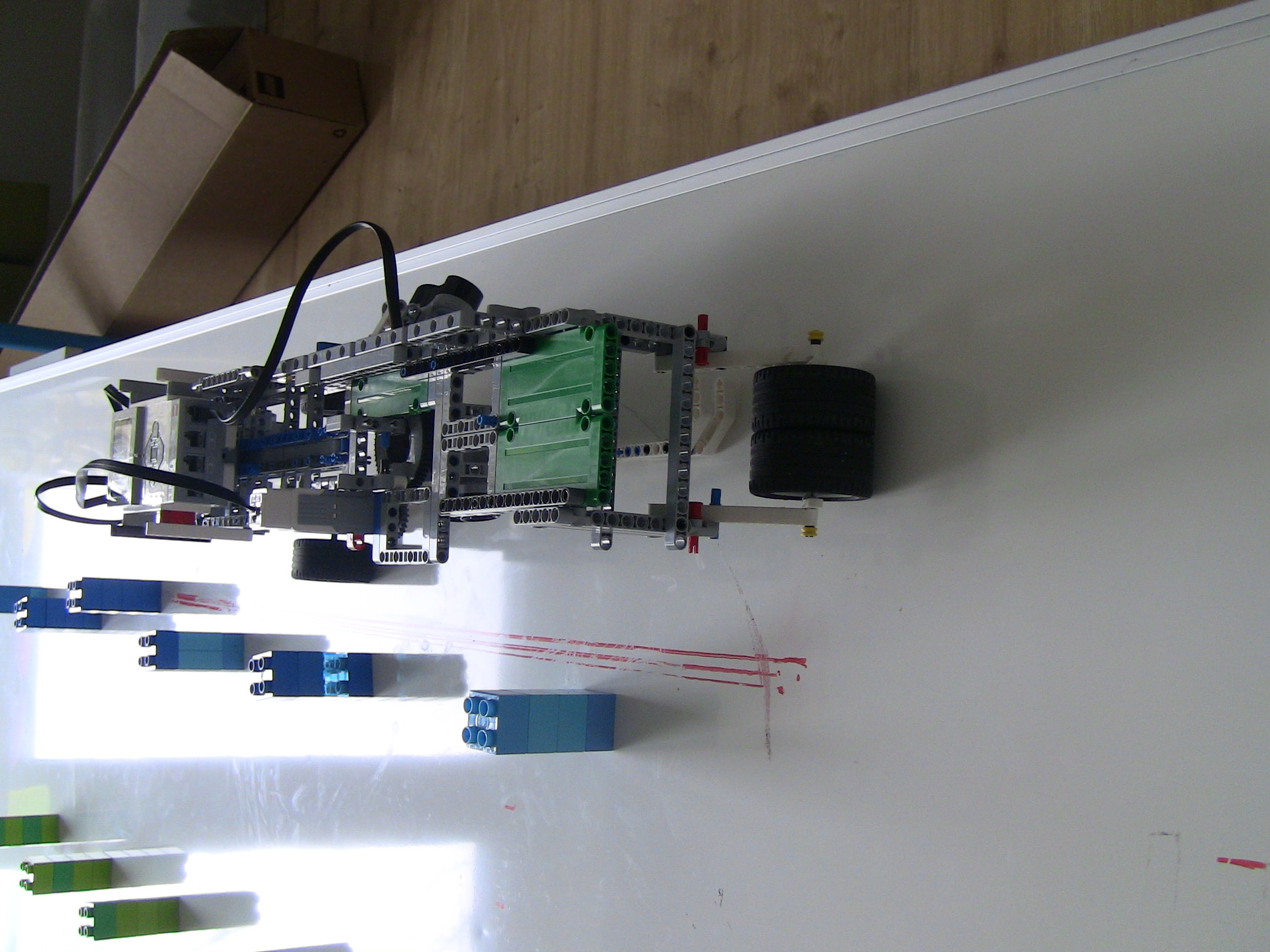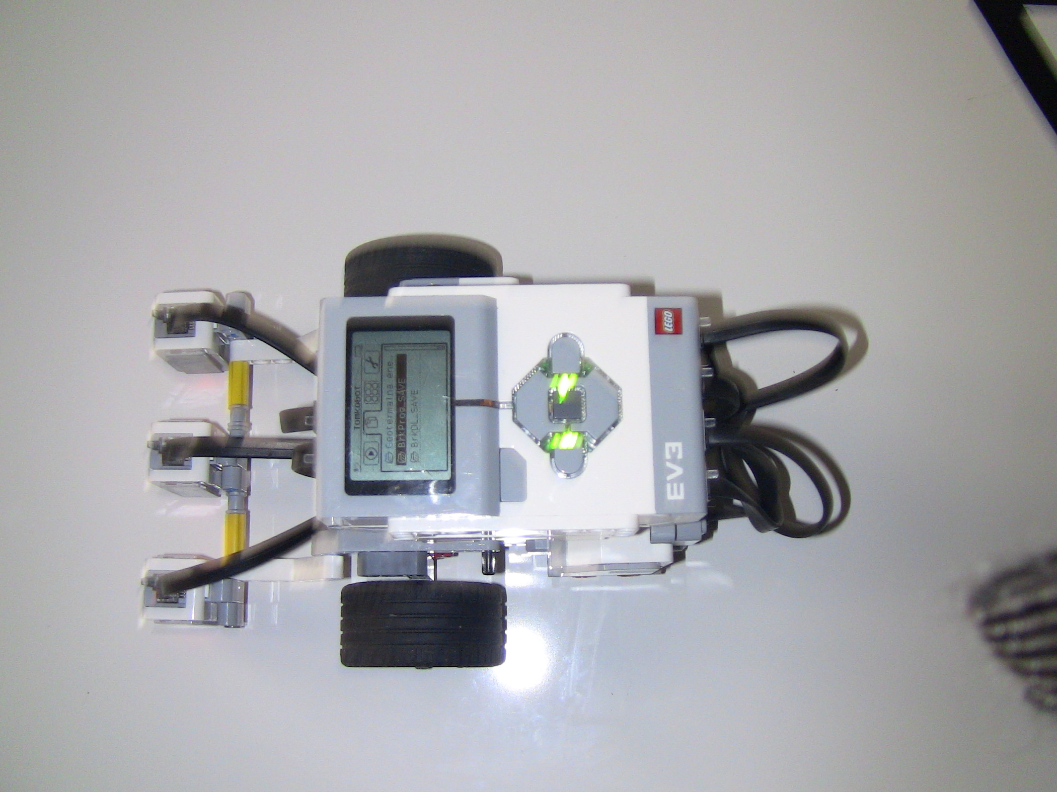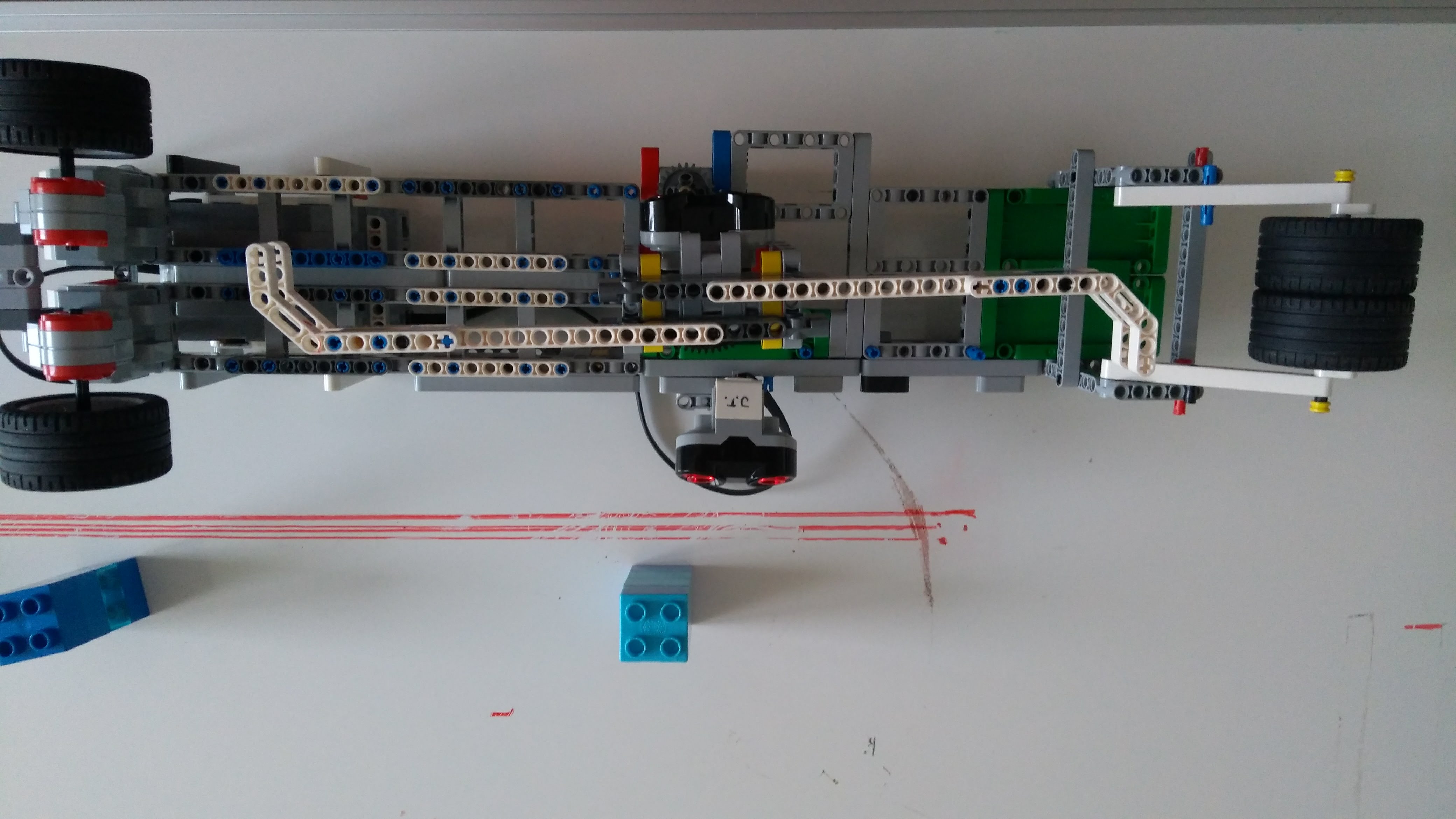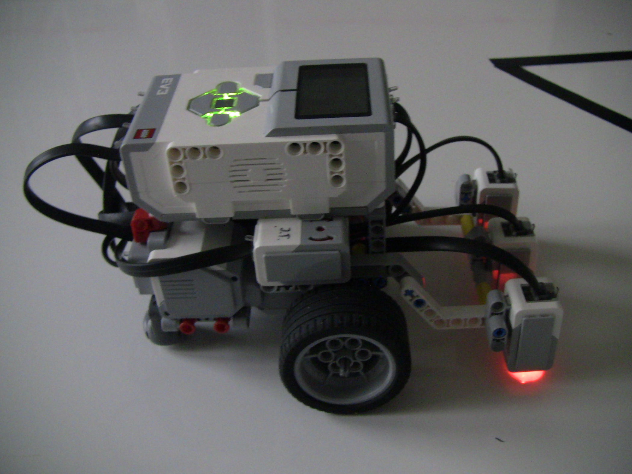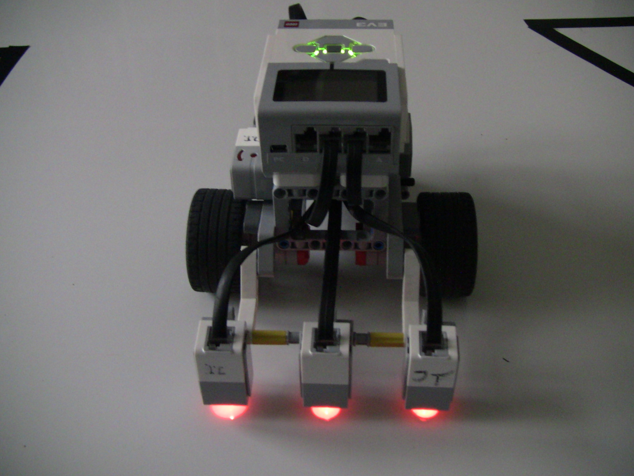 Vpredu má kolesá na pohyb, a farebné senzory, na detekciu čiary.