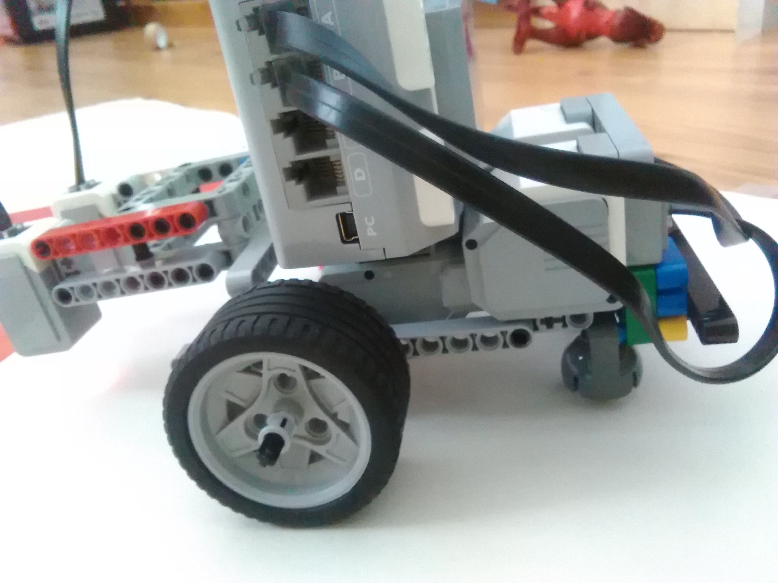 Postavili sme roboticke auticko (podobne ako v ulohe minovac) tak ze sme 2 large servo motory spojili s pomocou lego technic sivej obdlznikovej kocky a pod nich sme upevnili ako dve pomocne kolieska lego midstorms kovove gulicky. Na to sme umiestnili kocku a cast s 2 color senzorami kde sme lego technic sive obdlznikove kocky pouzili na upevnenie color senzorov.