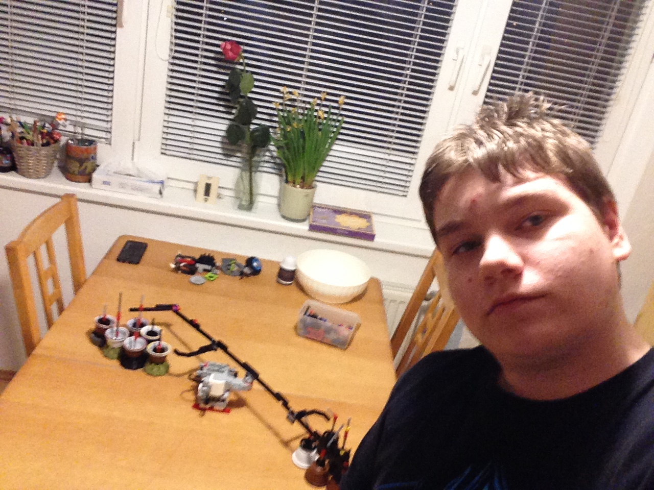 Ďakujem, toto sa na kvetináče naozaj verne podobá, skvelé! Skúsim Vám ešte pootáčať tie obrázky, len čo sa k nim na server dostanem. Rozhodcovia: 1. Za úlohu Dokonalý človek získavate 3b. Úlohu ste vyriešili efektívnym spôsobom. Riešenie by sa dalo vylepšiť tak, že by robot najpr. prišiel a nabral kvetináče až neskôr ich vymenil. 2. Škoda že sa robot nepokúsi kochlíky aj nejako vyhľadávať. 3. Bolo by dobré nabudúce fotky upraviť tak, aby neboli dole hlavou ;) Elegantné riešenie, možno by to chcelo ešte jemne upraviť rýchlo točenia motora na pomalšie.