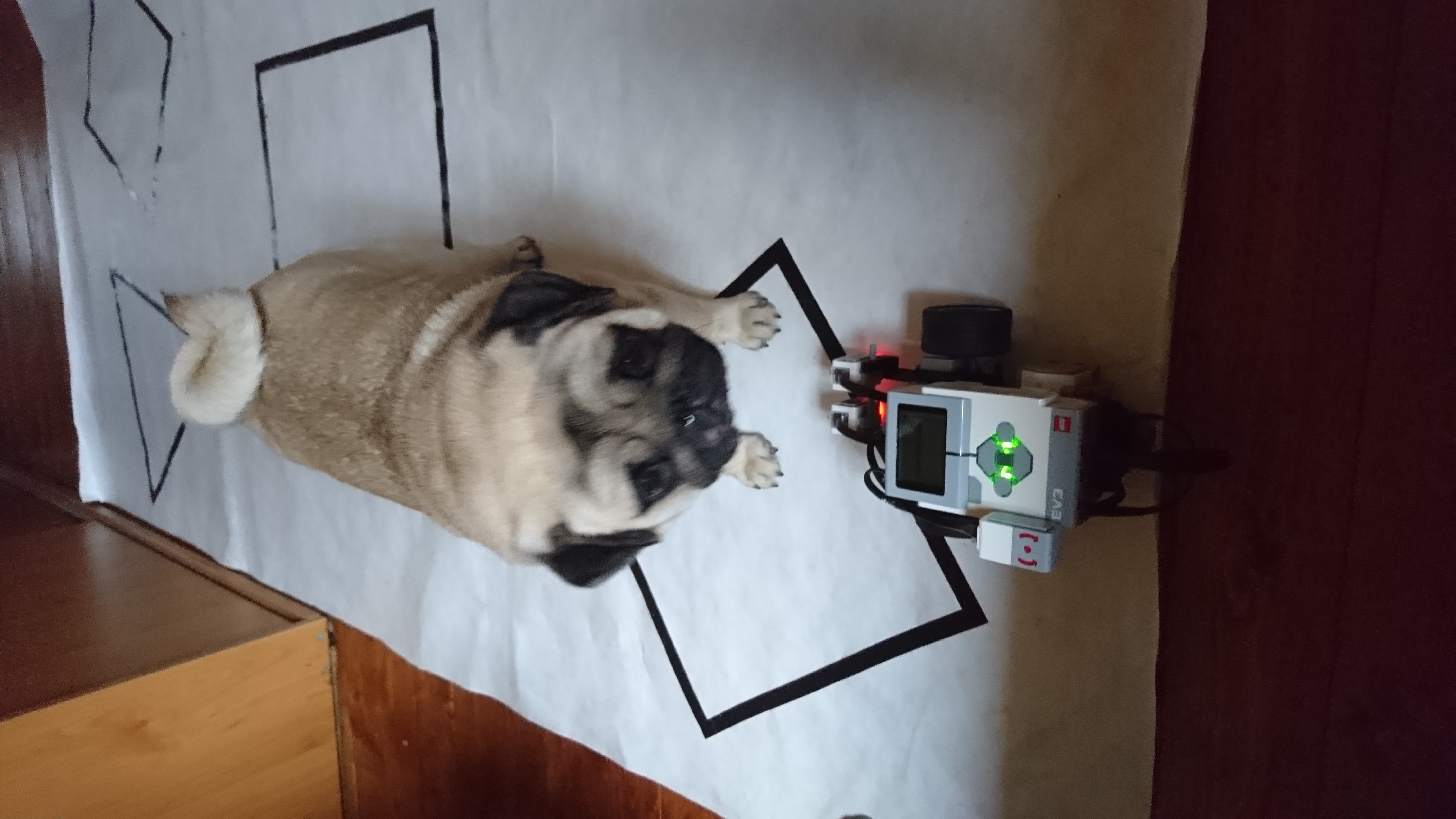 9. Robot prešiel cez dráhu bez žiadnych problémov. Jéééj! Ale chcelo by to pridať ešte niečo naviac. Čo napríklad aby východzia pozícia robota bola vo vnútri štvorca a robot by dokázal nájsť trojuholník. A hor sa do prepísania programu.