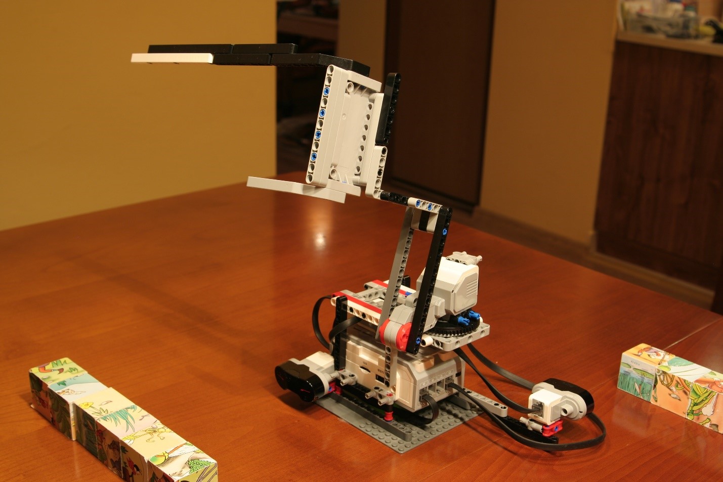 Robot je počas celého programu upevnený na doske. Má otočné rameno, ktorým okolo seba presúva kocky z jednej strany na druhú. Použili sme jeden stredný (medium) motor, ktorý prostredníctvom prevodovky otáča veľký (large) motor so sklopným ramenom.