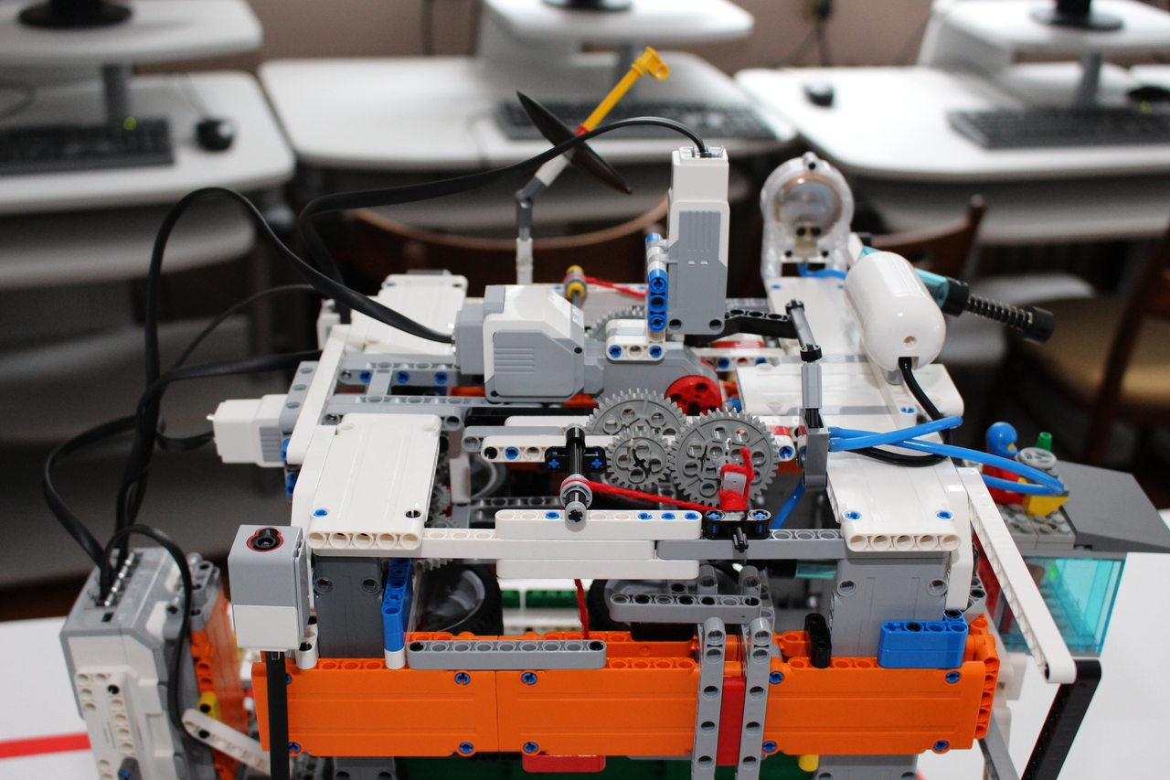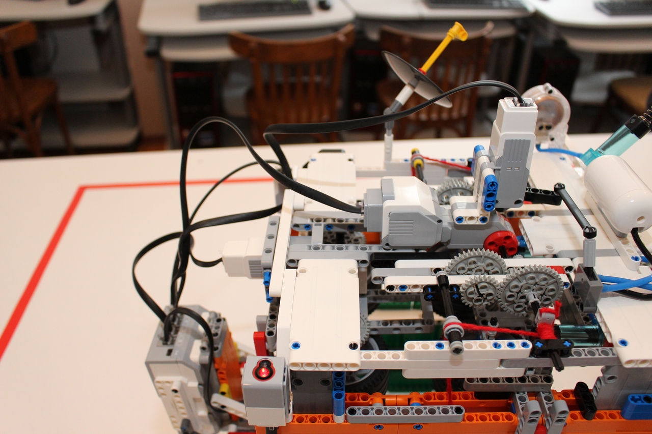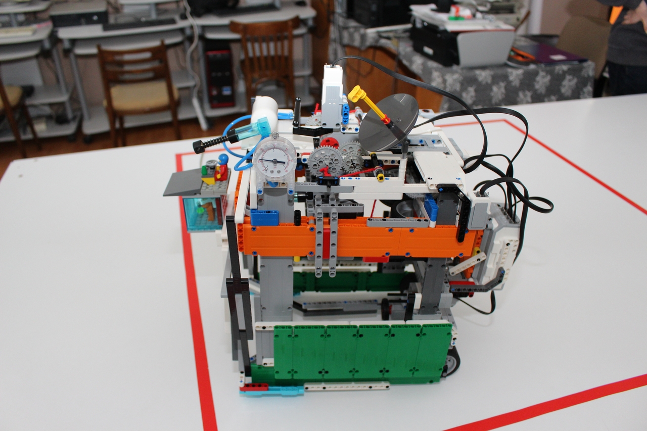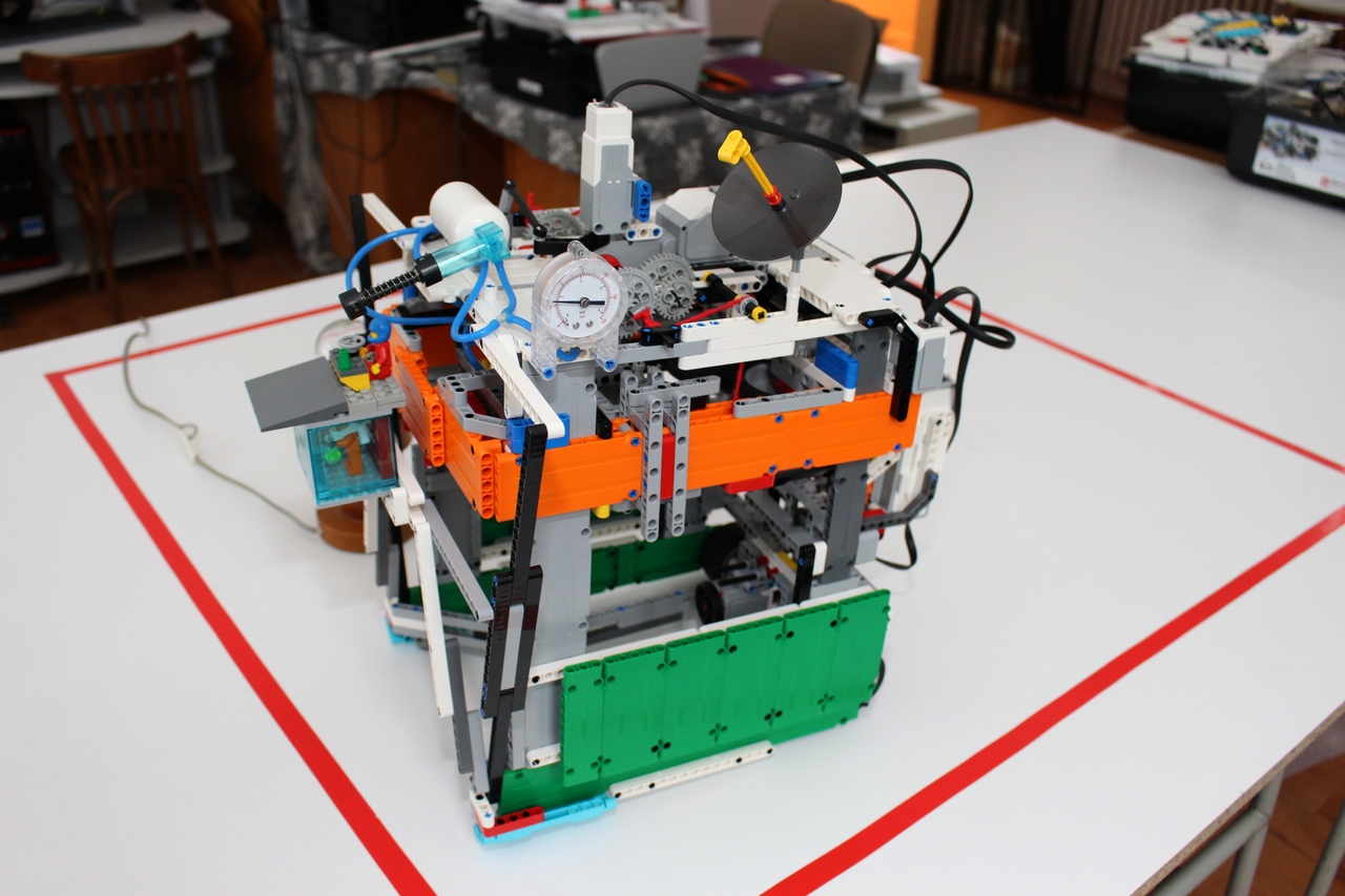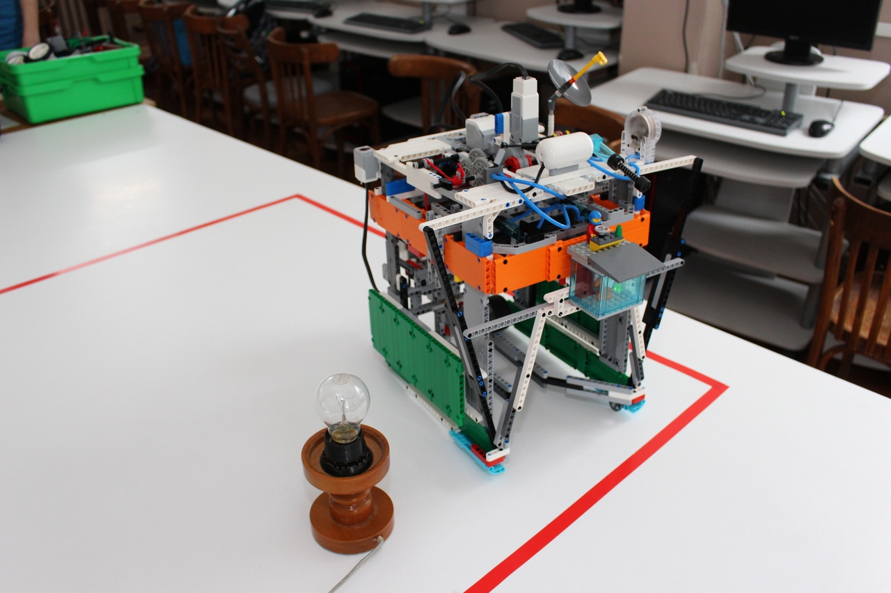 Využili sme 4 motory - jeden veľký motor slúži na pohyb robota, druhý veľký motor zdvíha menič žiarovky. Jeden stredný motor ovláda ventil piestov, ďalší stredný motor roztáča kolesá meniča žiarovky. Ďalej sme použili 3 snímače - 2 dotykové a jeden optický snímač. Pomocou optického snímača štartujeme jednotlivé kroky programu pri výmene žiarovky.