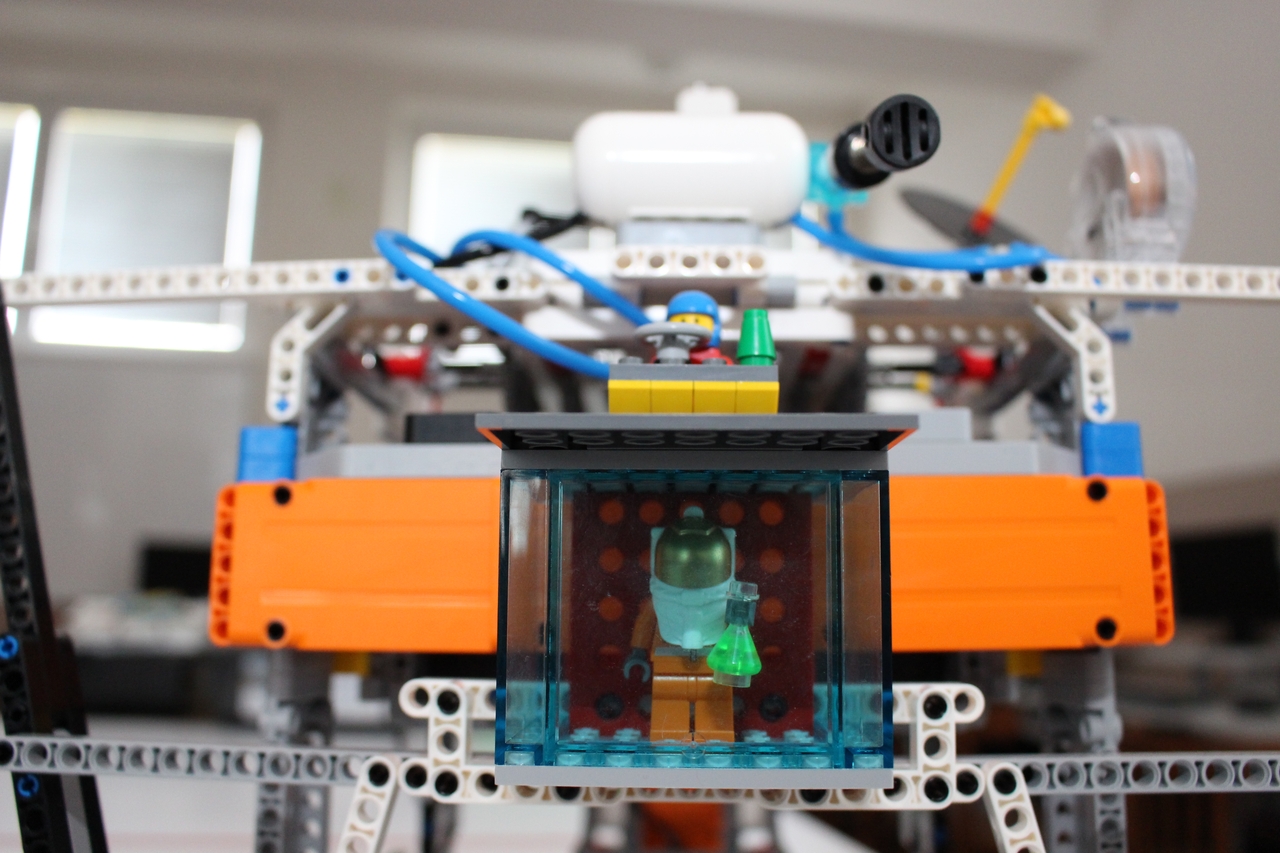 3. Robot zastaví, menič sa pomaly spúšťa dole. V správnom momente menič zastaví - v najnižšej polohe. Ventil sa otvorí a piesty pritlačia dvojicu kolies o žiarovku. Žiarovka je teraz stlačená medzi 4 kolesami. Dve kolesá sú roztočené motorom a žiarovka sa tak začne vytáčať. Naraz sa dvíha aj celý menič - musí, lebo žiarovka pri vytáčaní stúpa hore.