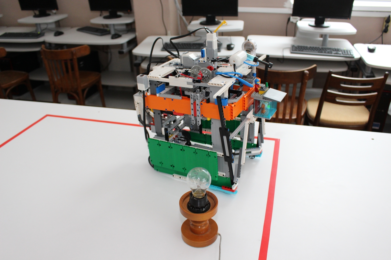 2. Robot sa rozbehne smerom k lampe. Spodná časť robota obsahuje "lievik" - robot sa preto presne nasmeruje na žiarovku. Dopredu sa pohybuje dovtedy, kým nie je stlačený dolný dotykový snímač o stojan lampy.