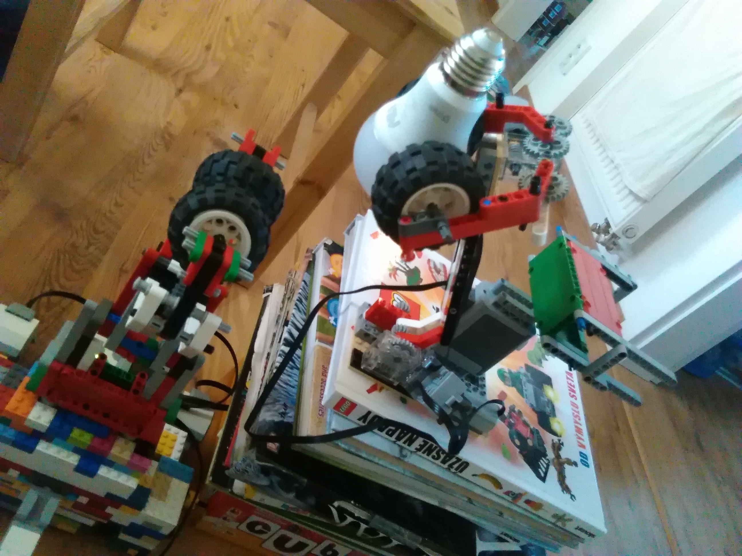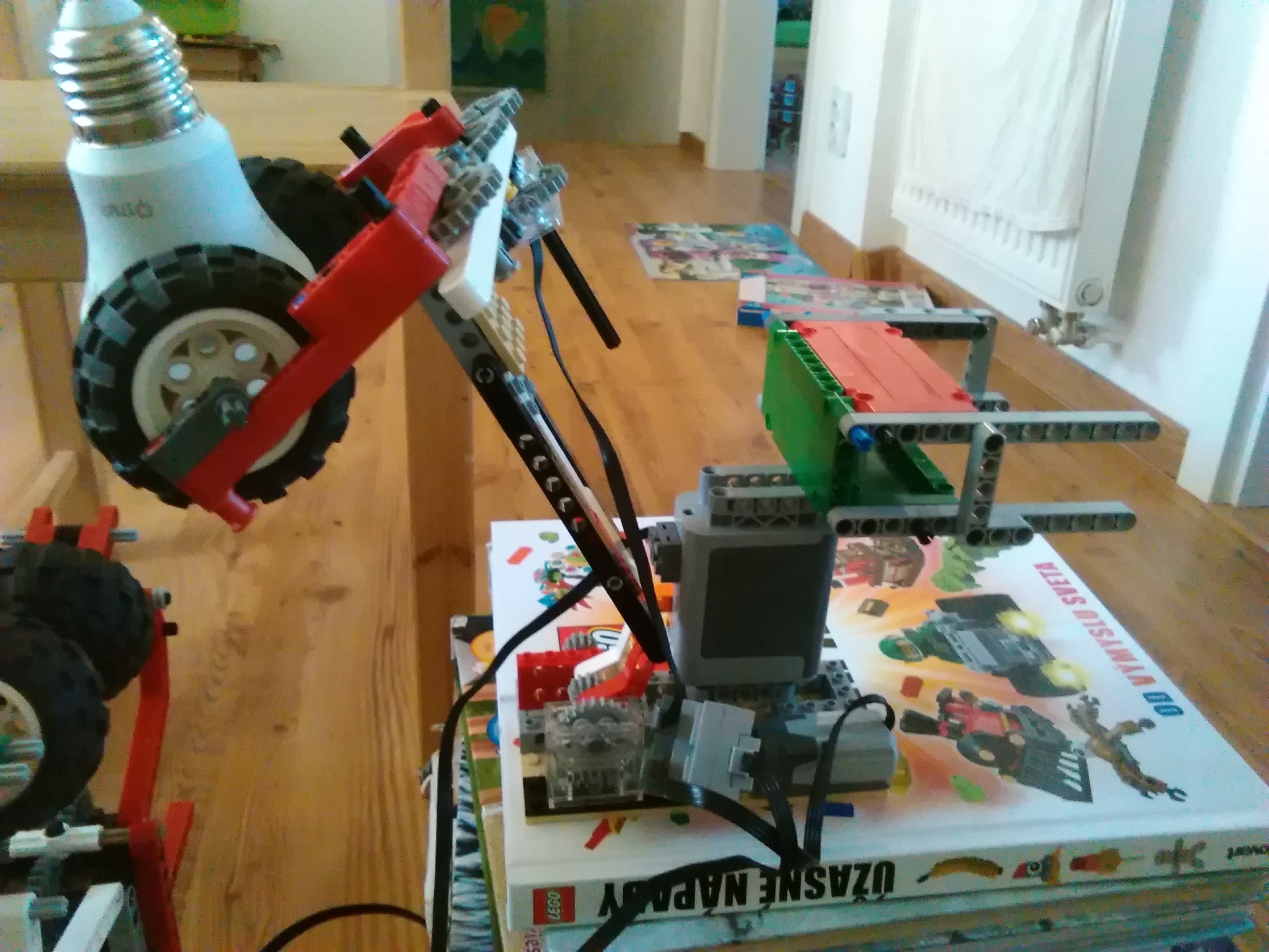 Spoločné poznámky: Viacerí sa tento raz chystali na Istrobot a tak mali časové obmedzenia ešte väčšie ako bežne. To nevadí, my sme iba liga a hodnotíme a máme radosť i z čiastočných riešení. :-) Úloha bola náročná, ale taká zo života. Myslím, že má veľký potenciál a dúfam, že sa k nej aspoň niektorí ešte vrátite, keď budete mať viac času. Ja určite áno, robot by mohol vedieť robiť rôzne veci - vymieňať žiarovky, skrutkovať, vŕtať, keď mu do ruky dáte vŕtačku, pečiatkovať a ktovie čo ešte. Už si predstavujem také jedno kolo FLL, ktoré by bolo celkom iné ako ostatné, kde by súťažiaci na svojho robota dávali nielen LEGO-vé doplnky, ale ešte by mu dali aj nejaký pracovný nástroj a robot by vyštartoval po stole a riešil by rozličné úlohy - tu niečo vyvŕtať, tu vymeniť skrutku, tam vymeniť žiarovku, prepnúť istič, ktorý vyletel, niekde prepojiť káble a podobne... To by bolo! :-) Trochu sa to podobá na kategóriu RoboCup@Work. 2sestry: Zaujímavé riešenie uchopiť žiarovku medzi 2 pneumatiky, zdá sa, že to funguje. Tuším sa Vám aj podarilo umiestniť rameno do stredu otáčania, takže pri otáčaní robota sa žiarovka nepresúva. Už ste ale videli nejakého človeka, aby krútil žiarovkou tak, že by sa celý točil? Hihi! :-) Rozhodcovia napísali toto: 1. Za úlohu Výmena žiarovky získavate 3b. Vaše riešenie je síce jednoduché, ale žiarovka sa vám podarila vymeniť. Odporúčala by som pripevniť žiarovku k pevnému povrchu (nemusí to byť len lampa :)) a zrýchliť spôsob uchopenia žiarovky. 2. Všetko najlepšie k narodeninám! Riešenie sa mi páči, hoci ste robotovi museli trocha pomáhať aby tú výmenu naozaj zvládol. Je to také poloautomatické riešenie. 3. Pekné riešenie, dobre vymyslené odňatie objímky. Dobre ste zvládli aj natočenie, že je všetko viditeľné, neprestrihnuté a dobre je zdokumentovaný aj model. Aj keď bolo treba ľudské pričinenie sa, nebolo to čisto o robotovi.