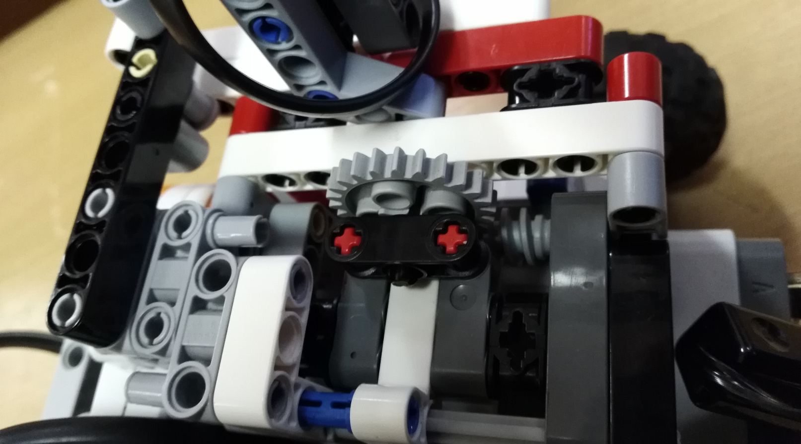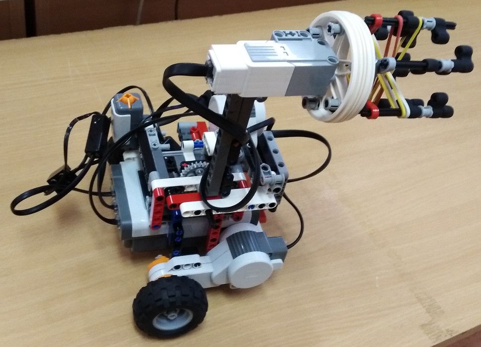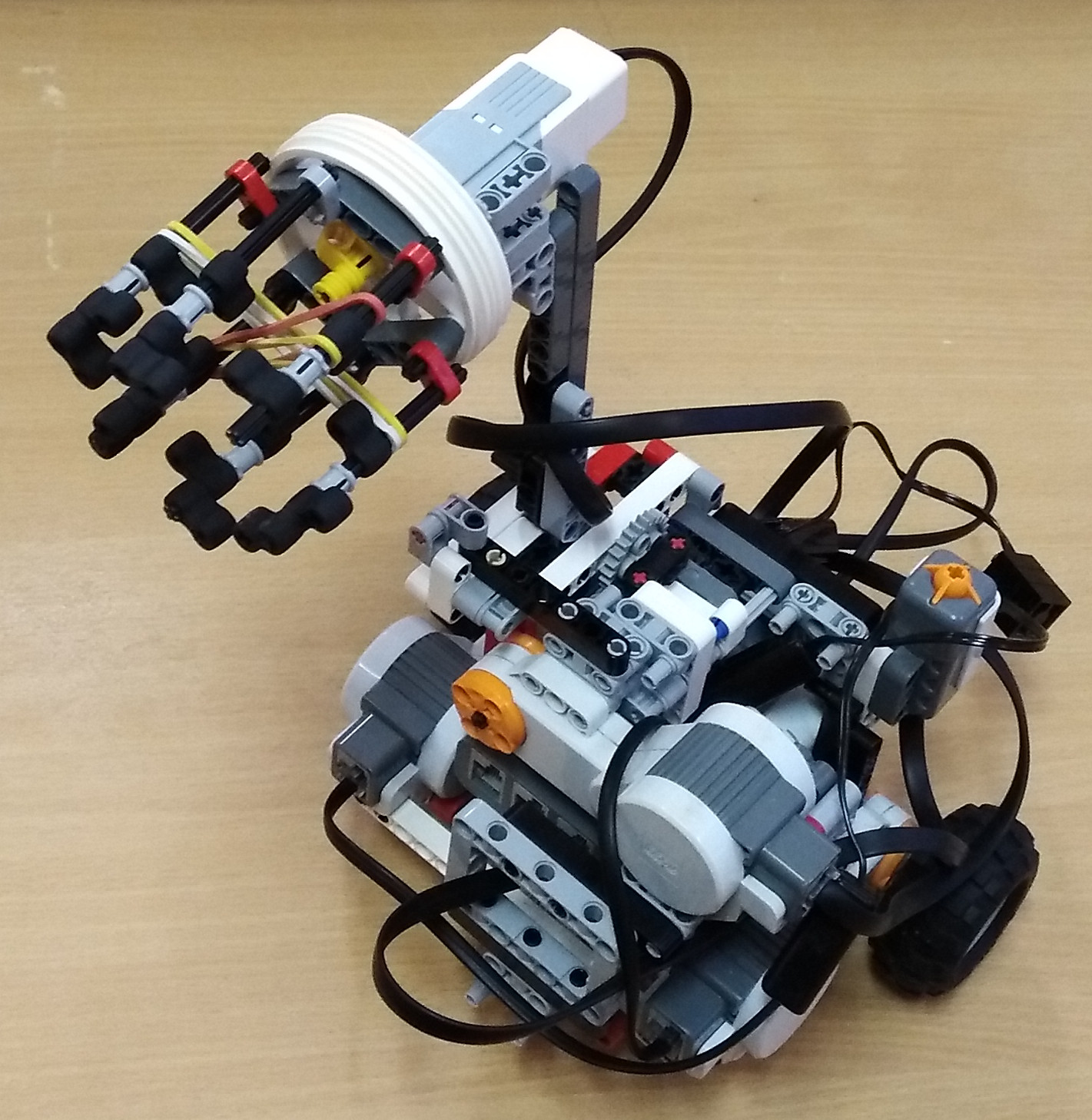 Robot sa pohybuje pomocou dvoch kolies, má jednu ruku na primontovanie a odmontovanie žiarovky.Na jemné ale pevné uchytenie žiarovky sú na chápadle namontované LEGO gumové mäkké čierne diely. Rukou so žiarovkou otáča medium motor. Štvrtý motor vie rameno sklopiť dozadu, kedy je možné ručne vymeniť vypálenú žiarovku za novú. Robot potom sám príde k lampe a rukou nasadí žiarovku, ktorú zakrúti. Na pohyb ruky hore-dole sme využili šnekový prevod, aby motor uniesol celú ruku a mal silu ju nasadiť na vypálenú žiarovku. To bolo zaujímavé a aj keď riešenie nie je dokonalé, niečo nové sme si pri riešení vyskúšali a naučili sa. Štyri motory sme na NXT s tromi portami napojili pomocou konverzných NXT káblov - na porte C sú oba motory poháňajúce kolesá. Konštrukciu základu robota sme dobre spevnili, aby bol stabilný.