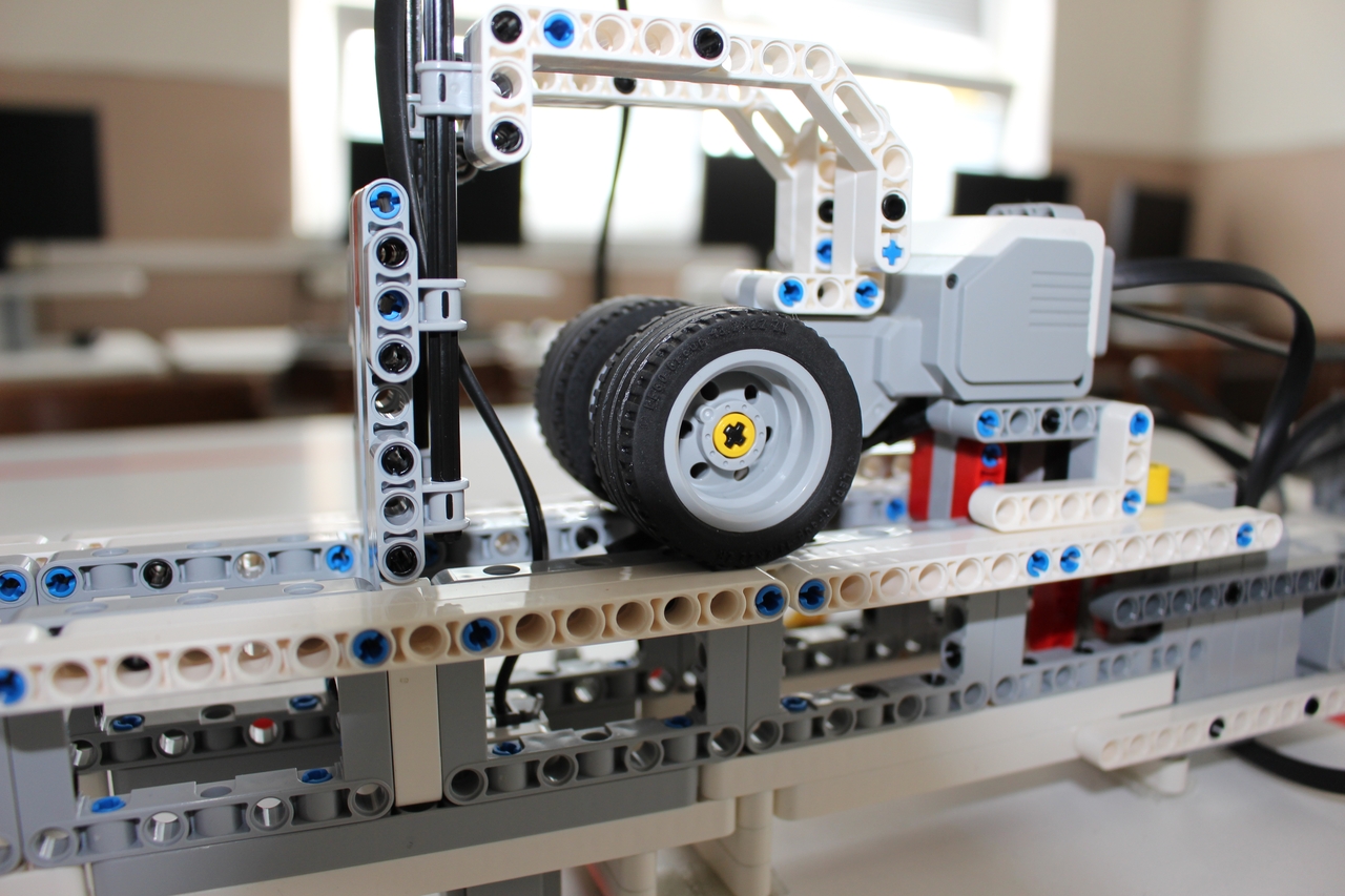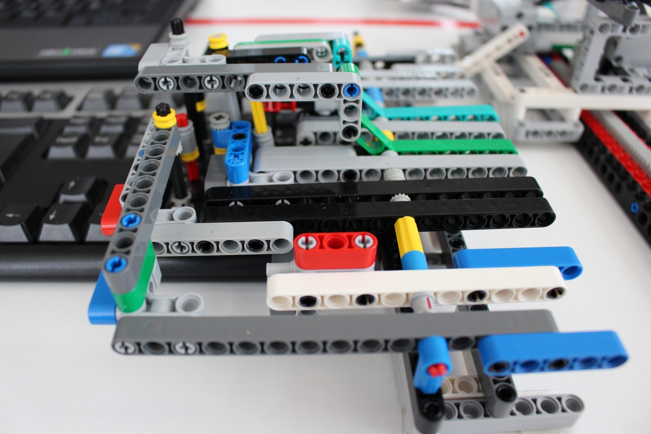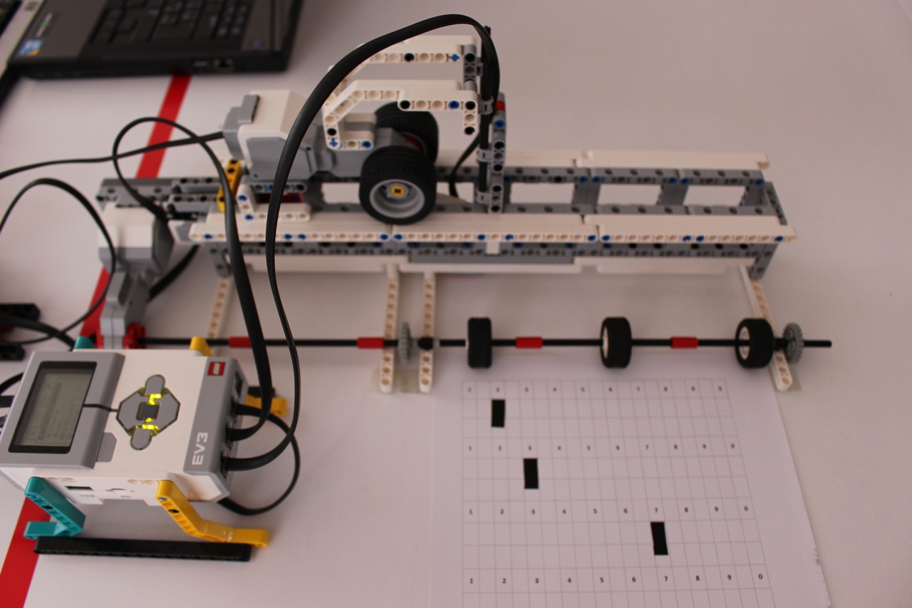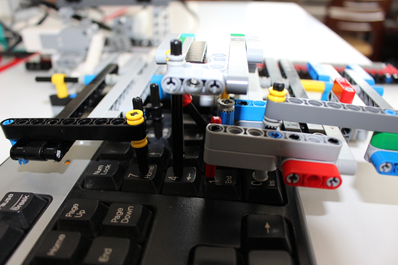 3. Teraz už máme tri premenné, v každej je zapísaná jedna číslica z trojciferného čísla. Už ich len treba zapísať. So zápisom sme si najprv nevedeli rady. Chceli sme zapisovať pomocou zvislých tyčiek, ktoré by sa vysúvali smerom dole - vtedy keď by na nich zvrchu zatlačila vačka na osi, ktorú otáča motor. Lenže to nešlo - bolo to príliš komplikované a potrebovali by sme piaty motor. Nakoniec sme to teda spravili pomocou kladívok. Zapisovač je vlastne 11 tyčiek, ktoré sa otáčajú okolo vodorovnej osi. Každé kladivko je tak vytvarované, aby končilo na inej klávese. Jedenáste kladivko stláča klávesu Enter - aby sme po zapísaní čísla do tabuľky v Exceli mohli pomocou Enteru preskočiť na nový riadok. Zápis vyzerá takto: Vyberieme číslicu z premennej cislo_1. Zapisovač sa pomocou ozubeného kolieska a ozubeného hrebeňa posúva dopredu - kým nezastaví pri správnom kladívku. Počet stupňov otočenia motora, ktorý posúva zapisovač sme si zasa ručne pomerali - hýbali sme čítačom a odčítavali hodnotu stupňov otočenia motora, kým nebol čítač na správnom mieste. Vtedy druhý stredný motor malým ramenom podvihne kladivko a jeho koniec na krátku chvíľku stlačí správnu klávesu. Musí to urobiť veľmi rýchlo - ináč by nezapísal napr. 2 ale 22222..... Po stlačení sa zapisovač vráti na štart - cúva až po dotykový senzor. Zastaví, zresetuje sa počet stupňov otočenia motora a vybere sa číslica z premennej cislo_2. Znova sa čítač rozbehne, zastaví na správnom mieste a podvihne kladivko. Vráti sa a celé sa to opakuje pre tretiu číslicu. Po zapísaní tretej číslice ešte zapisovač vybehne posledný raz - aby stlačil Enter a tým preskočíme do druhého riadku v tabuľke. Vráti na na štart. Hotovo. Program je pripravený na čítanie a zapisovanie ďalšieho čísla.