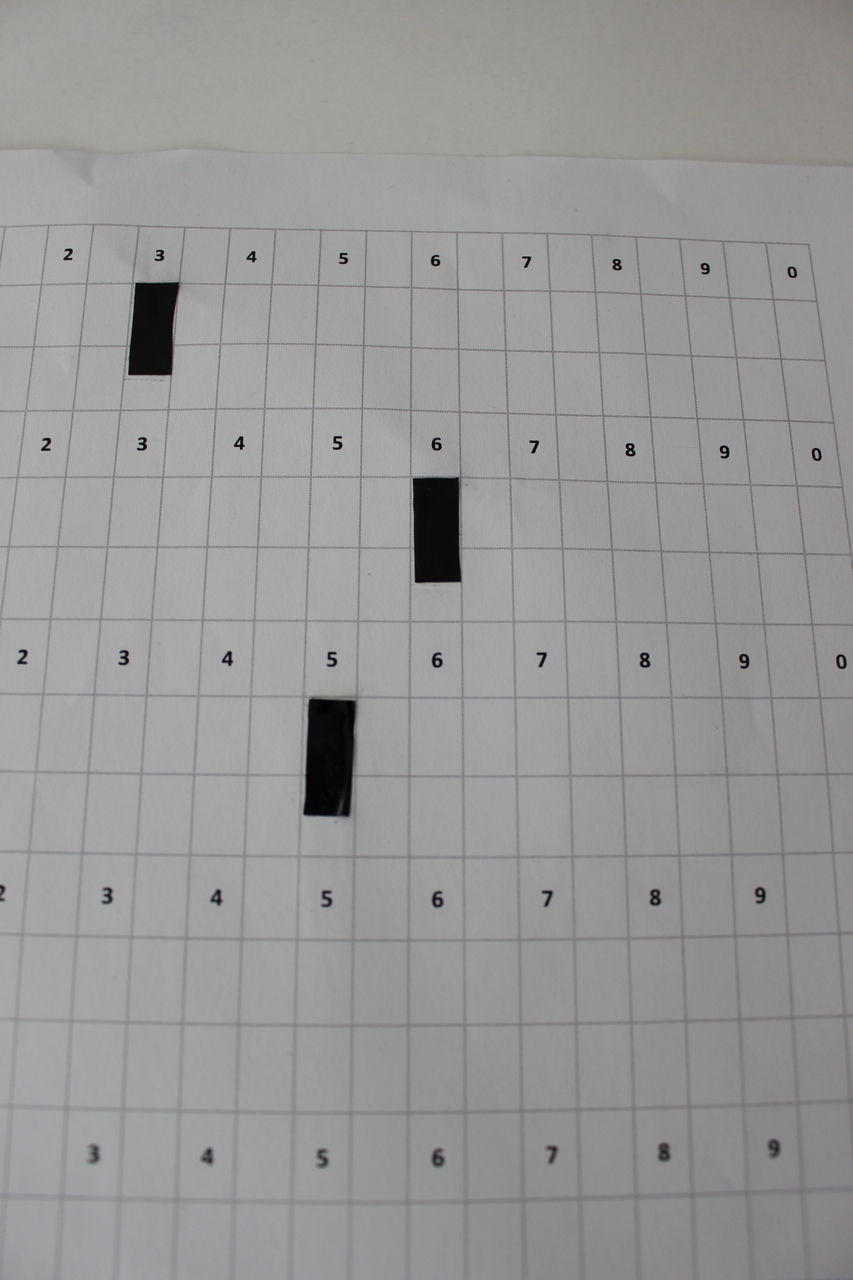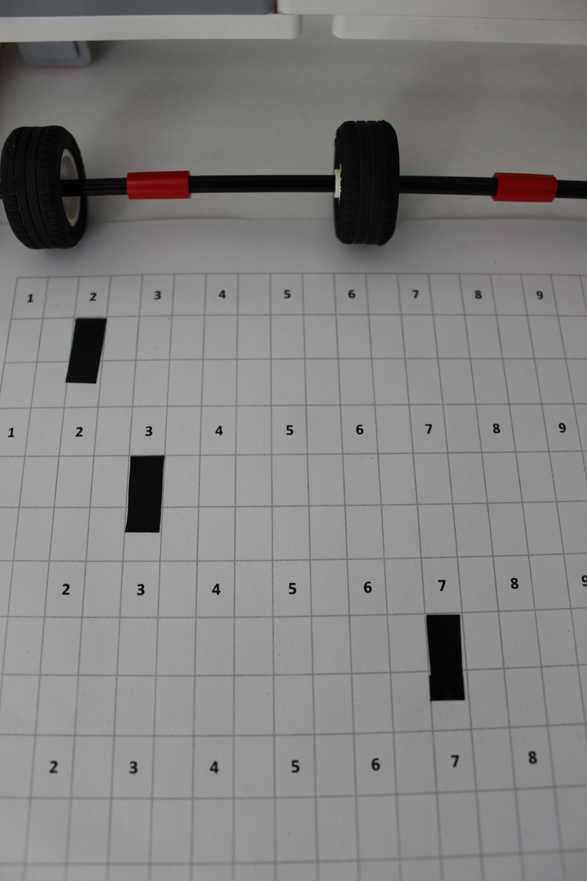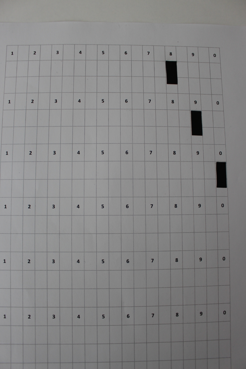 2. Veľký motor poháňa čítač. Počet stupňov otočenia motora je resetovaný. Čísla na papieri sú zapísané pomocou čiernych značiek v správnom políčku. Jedna číslica z čísla sa nachádza v jednom riadku. Čítanie funguje tak, že farebný senzor hľadá čiernu značku - kúsok čiernej pásky nalepený na papieri. Najprv sme chceli robiť značky čiernou fixkou alebo vytlačiť na tlačiarni - lenže to nechcelo fungovať - senzor namiesto čiernej ukazoval modrú, zelenú, ale nie čiernu. Keď snímač nájde čiernu značku, tak sa odčíta počet stupňov otočenia motora. Teraz robot určí to, že akú číslicu našiel. Robí to tak, že namerané stupne otočenia porovnáva s desiatimi rozsahami. Správne hodnoty stupňov pre každú číslicu sme zistili tak, že sme pohybovali čítačom a merali počet stupňov, pri ktorých bola nájdená čierna značka. To hľadanie sme zopakovali 10-krát - pre každú číslicu v riadku. Teda ak napríklad nameria počet stupňov otočenia motora od 1 do 22,5 - tak to znamená, že našiel číslicu 1. Do premennej cislo_1 sa tak zapíše číslica 1. Pri hľadaní čiernej farby musí byť použitý rozsah - lebo čierna značka má istú šírku. Takisto medzi značkami pre číslice musia byť medzery - ináč sa robot mýlim pri určovaní susedných číslic - napr. 1 a 2, 3 a 4 atď. Podobne fungujú ostatné číslice - 2,3,4,5,6,7,8,9,0. Čítač sa hneď vráti na začiatok. Posúvač posunie papier tak, aby sa načítal druhý riadok. Znova sa čítač rozbehne, keď je nájdená druhá čierna značka, tak znova zisťuje, že do akého rozsahu sadne nameraná hodnota. Zistenú číslicu teraz zapíše do premennej cislo_2. Čítač sa znova vracia na začiatok. Posúvač posunie papier tak, aby sa načítal tretí riadok. Zasa sa nájde čierna značka, správna číslica sa zapíše do premennej cislo_3. Posúvač vysunie celý paier.