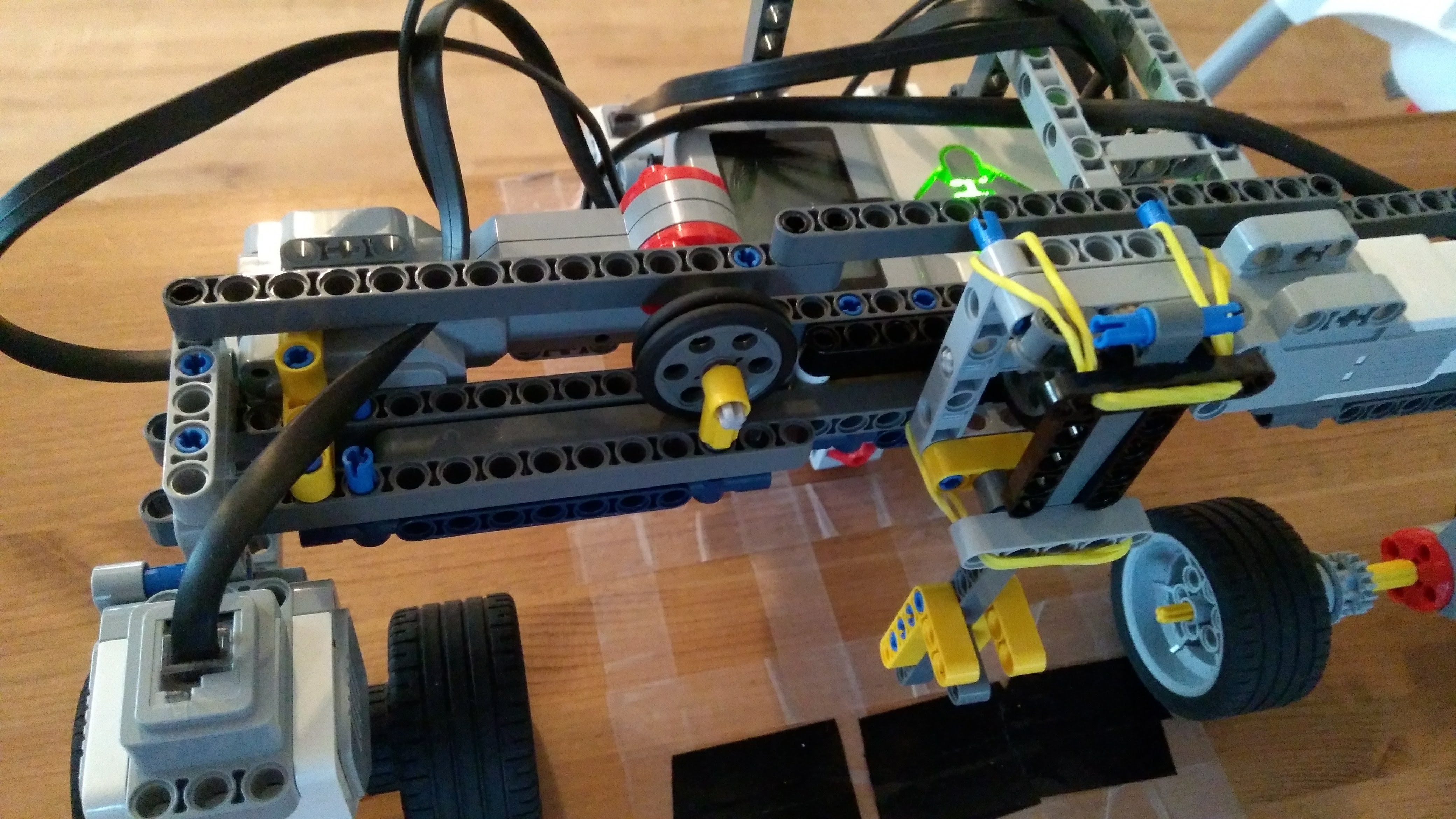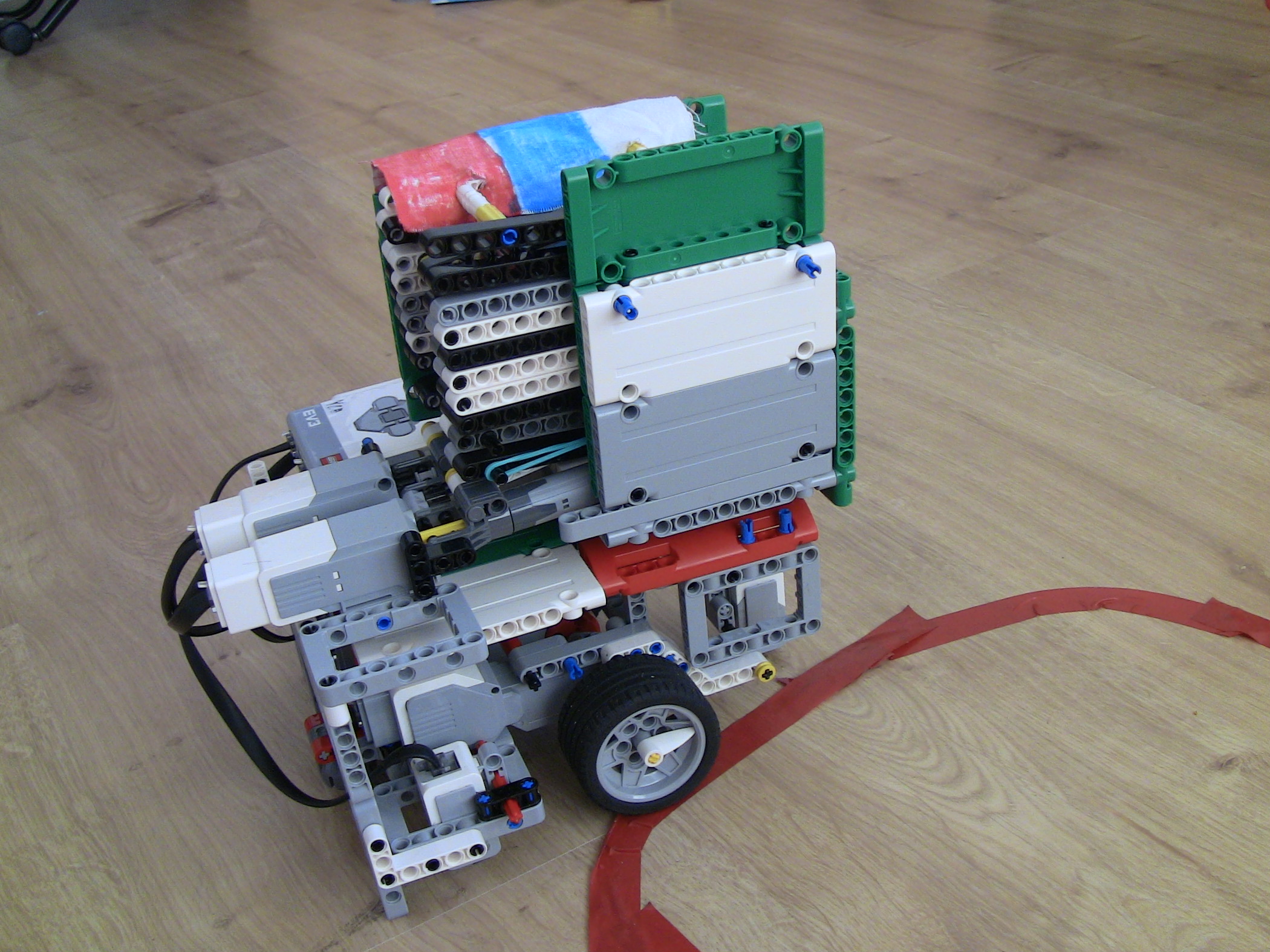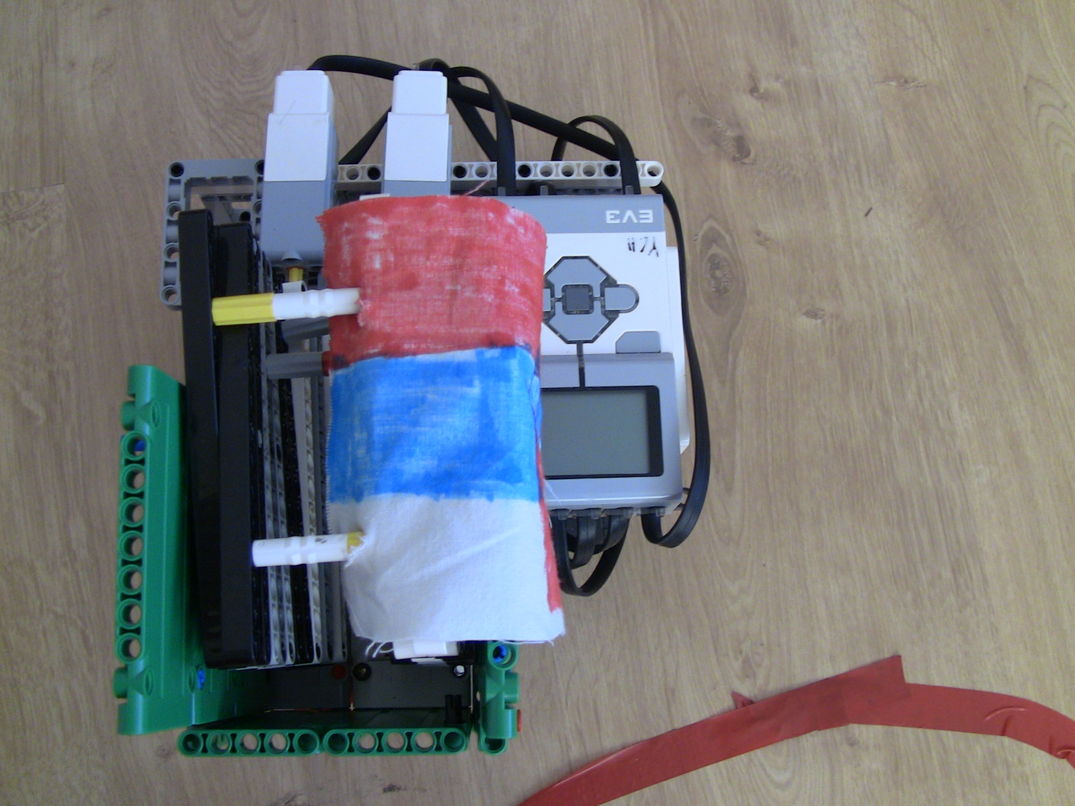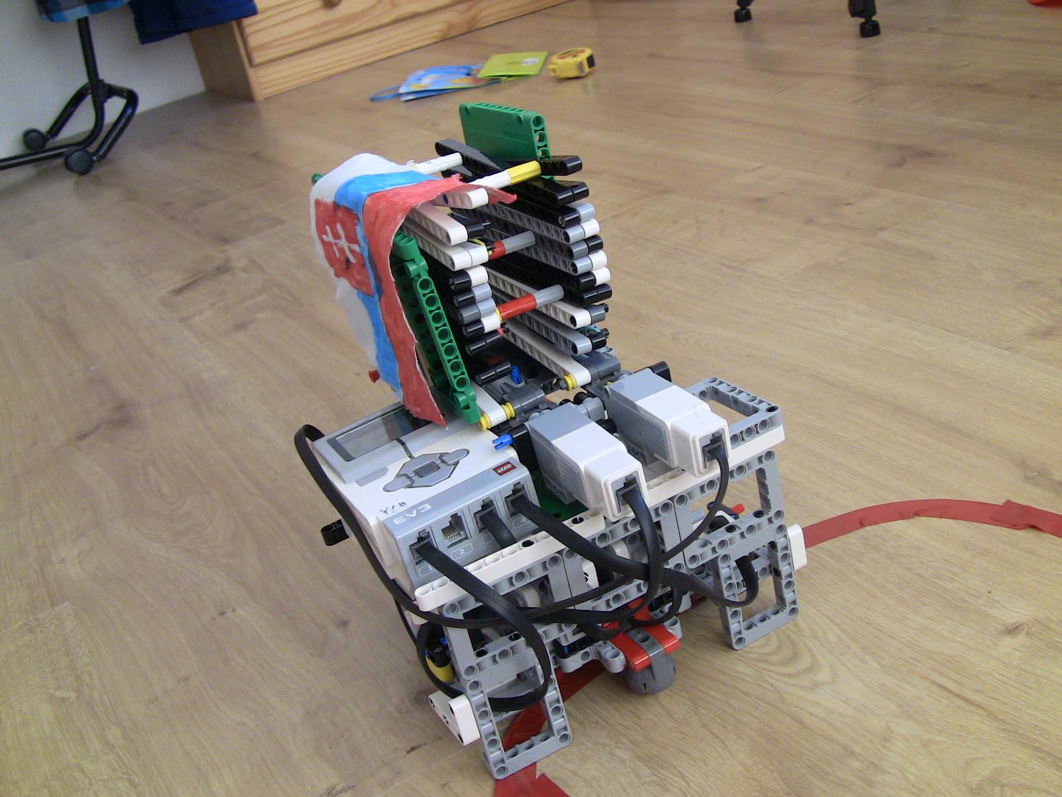 Ahojte,náš robot:1. zaparkuje na obeznej drahe marsu (zarovná sa na cetvenej čiare, pomocou dvoch zadných senzorov),na tento manever sme si pripravili vlastný blok ZA2.2. Premeria si planétu a zostupi do atmosféry (ide dopredu kym cervenu nenajde aj predný senzor)3. Prevedie samotný pristavaci manéver, ( vrati sa o polovicu dľžky planety), 4. Vysunie vlajku.Výsuvný mechaniynus prešiel niekoľkými verziami, od jednoducheho nožnicoveho sytemu, neskor vzlepšený gumičkami abz sa mu ulahčilo vysúvanie, až po zdvojenie výsuvu, koli stabilite. Veríme že v nižšej gravitácii by to išlo pekne hore.
