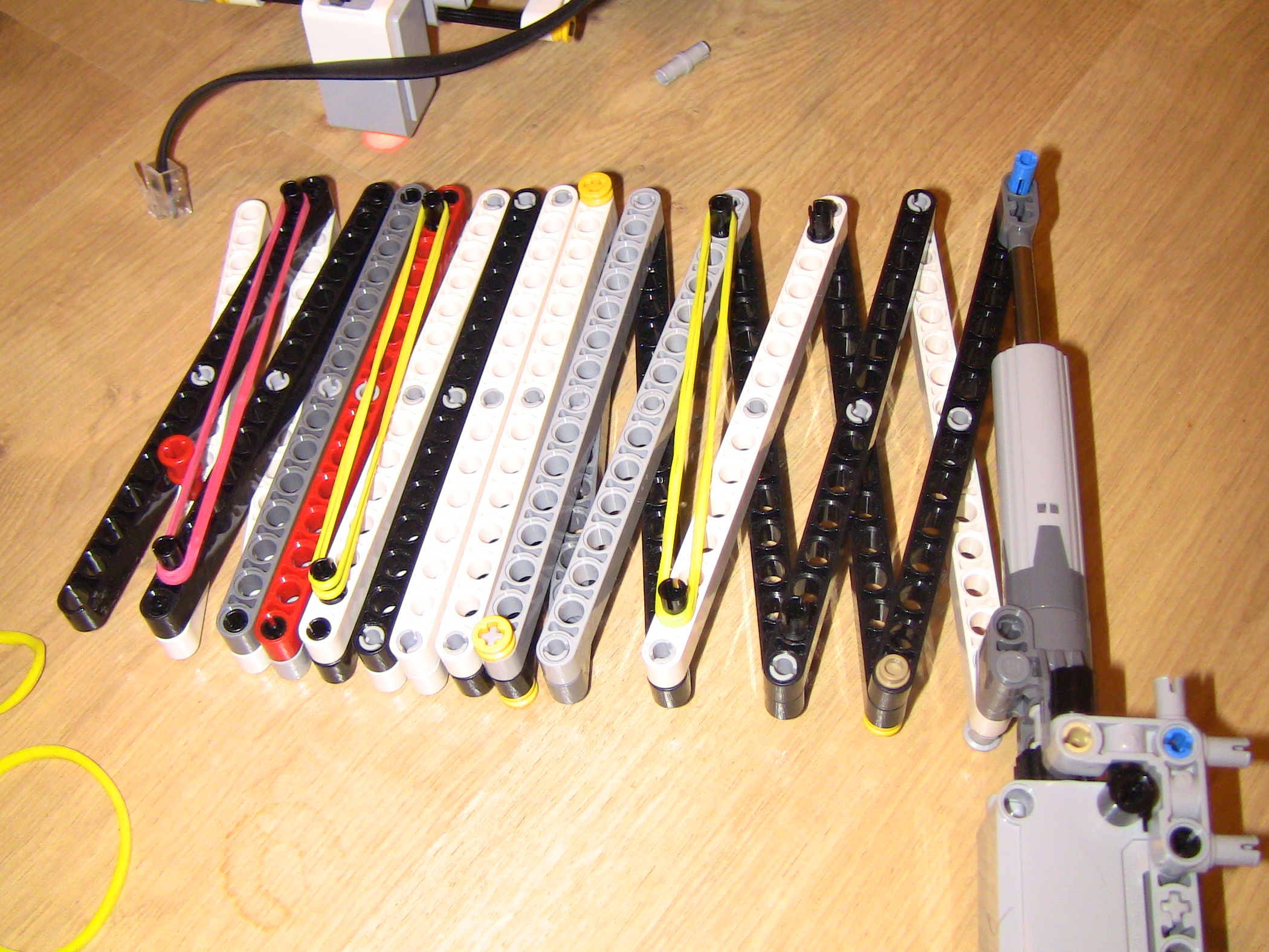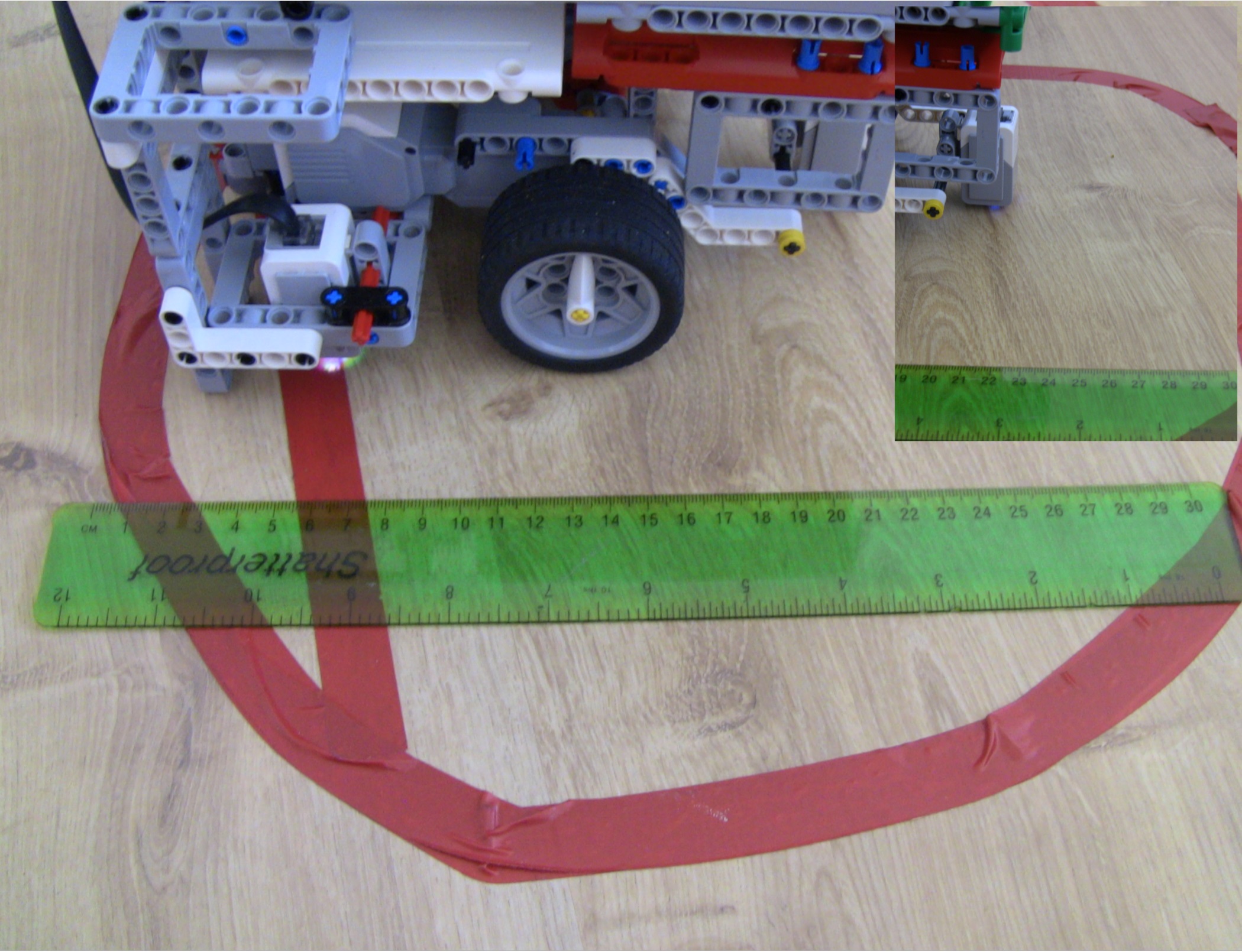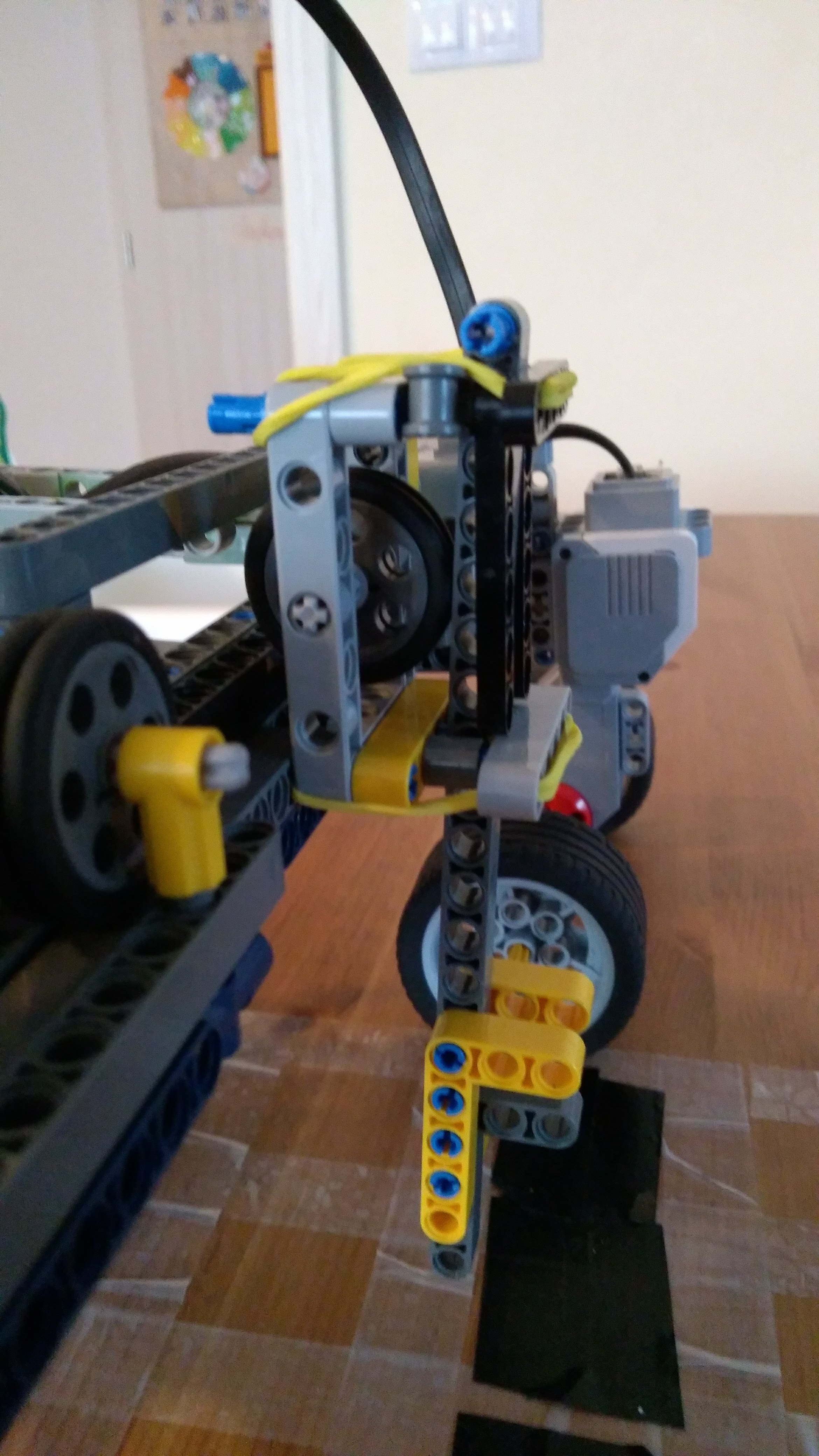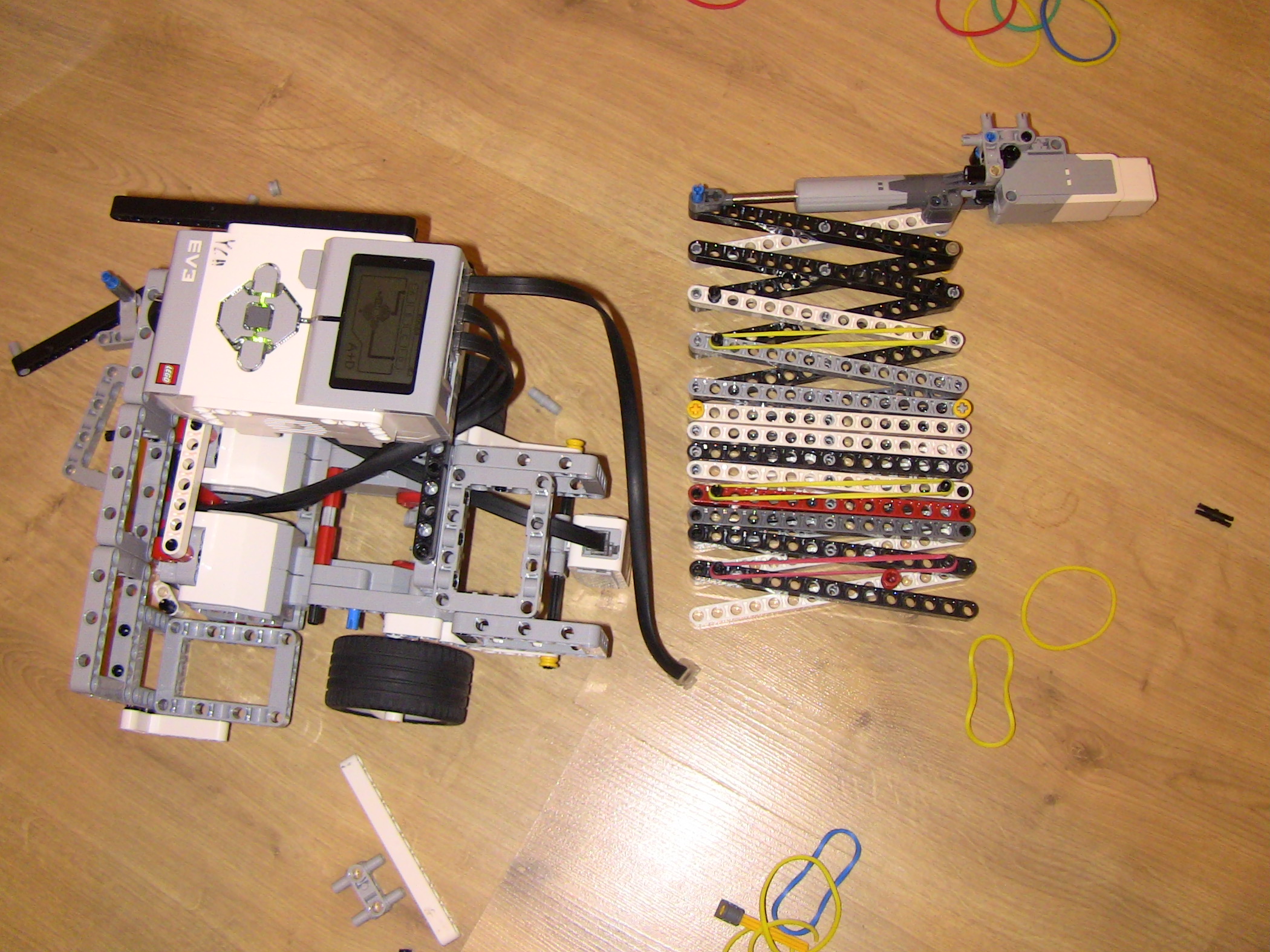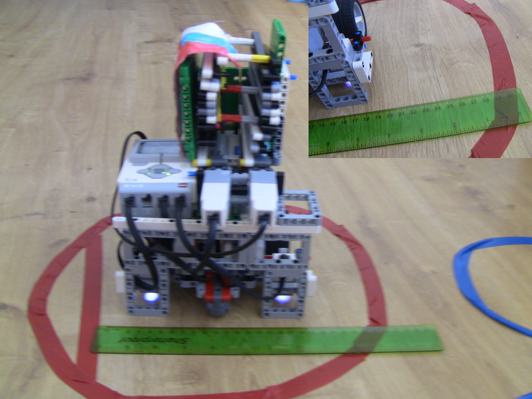 Ahojte,náš robot:1. zaparkuje na obeznej drahe marsu (zarovná sa na cetvenej čiare, pomocou dvoch zadných senzorov),na tento manever sme si pripravili vlastný blok ZA2.2. Premeria si planétu a zostupi do atmosféry (ide dopredu kym cervenu nenajde aj predný senzor)3. Prevedie samotný pristavaci manéver, ( vrati sa o polovicu dľžky planety), 4. Vysunie vlajku.Výsuvný mechaniynus prešiel niekoľkými verziami, od jednoducheho nožnicoveho sytemu, neskor vzlepšený gumičkami abz sa mu ulahčilo vysúvanie, až po zdvojenie výsuvu, koli stabilite. Veríme že v nižšej gravitácii by to išlo pekne hore.