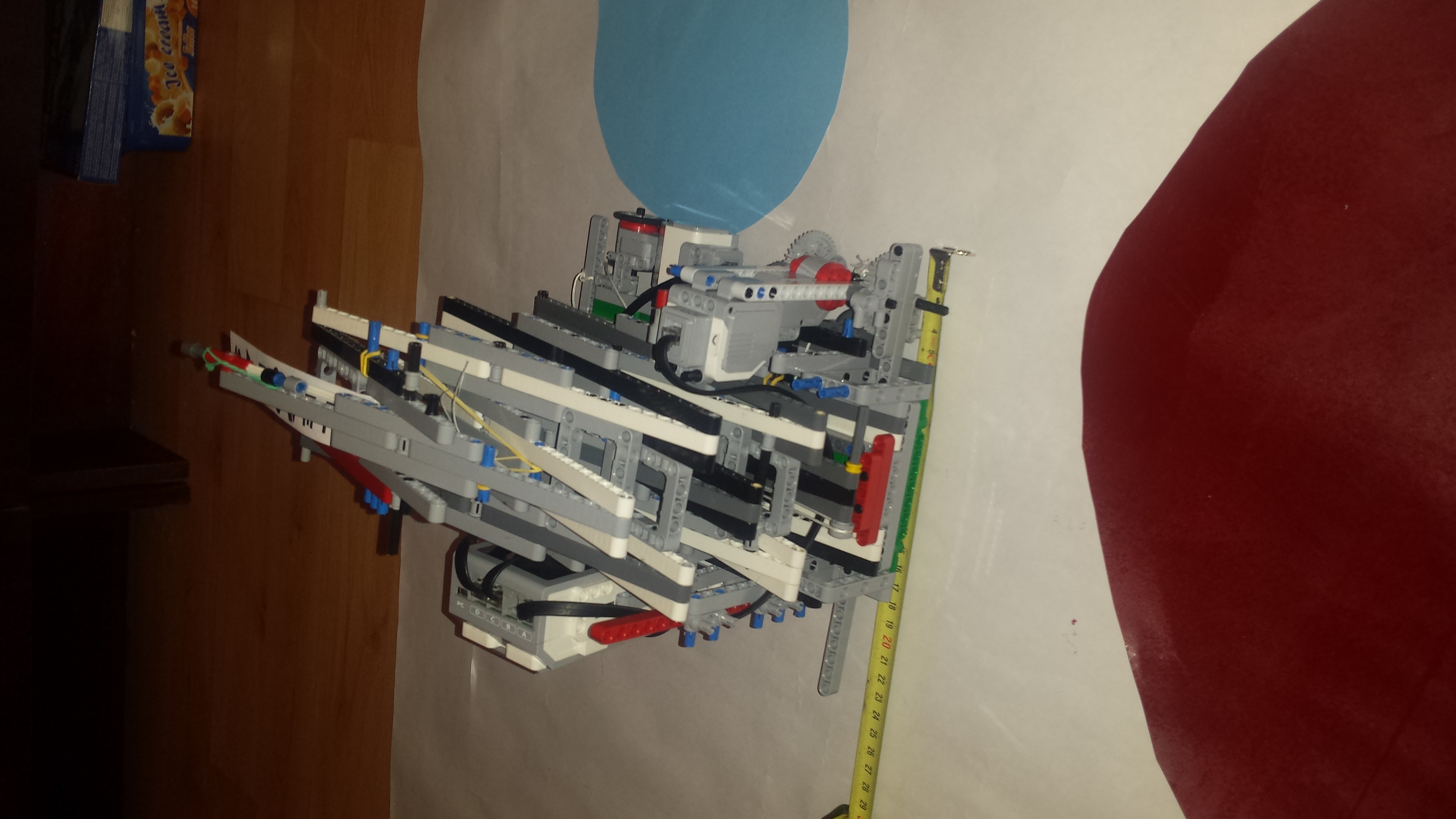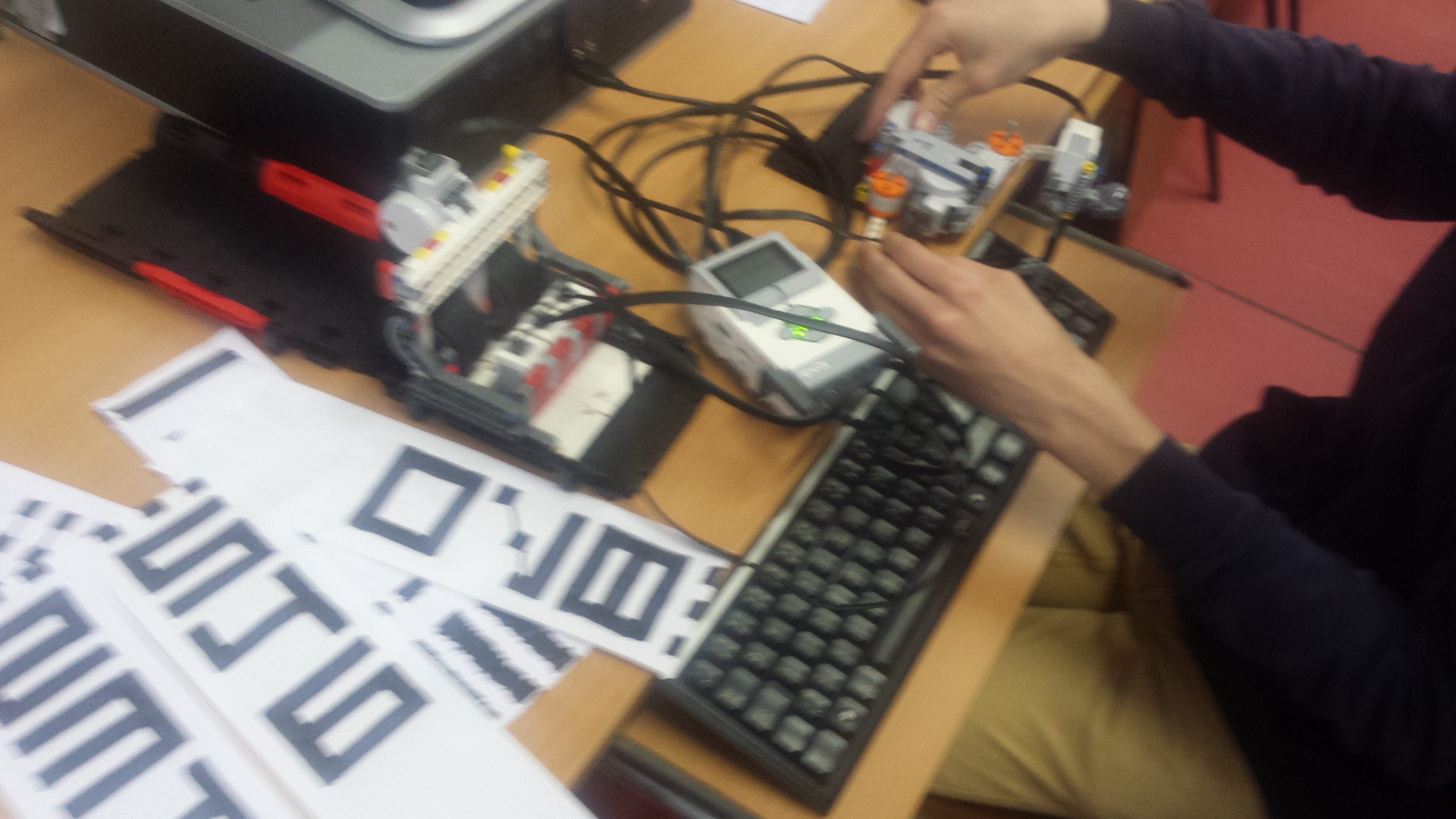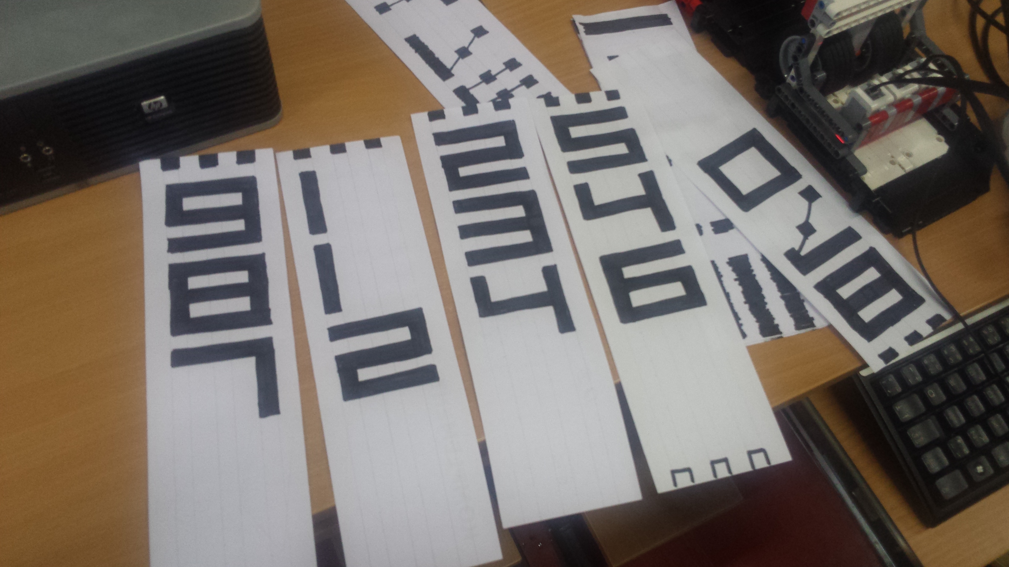 Popis riešenia:Robot:-Riadiaca jednotka EV3-3x EV3 color senzor na čítanie čísel-1x NXT motor na posúvanie papiera s číslami-2x NXT motor a 1x EV3 malý motor na písanie čísel na klávesnici-Robot číta pásiky papiera široké 8,5cm ,čísla sú vysoké 5cm a roztiahnuté do troch stĺpcovširokých 1cmRiešenie:1/Robot nájde začiatok papiera2/Postupne číslo za číslom číta čísla3/Píše ich na klávesnici4/A zobrazí ich na obrazovkeSW:1/zapne motor A na rýchlosť 102/v loope čaká kým nebudú všetky senzory vidieť čiernu3/resetne motor A aby mohol prečítať čísla4/počká kým prejde 2cm(1cm=20,334°) teda na prvý riadok prvého čísla5/v 1.“myblocku“znak čísla v dvojkovej sústave(čierna-biela)zmení do desiatkovej a v 2.zistíaké je to číslo6/po prečítaní prvého čísla ich začne čísla písať na klávesnici7/zatiaľ číta ostatné dve8/ukáže ich na obrazovku