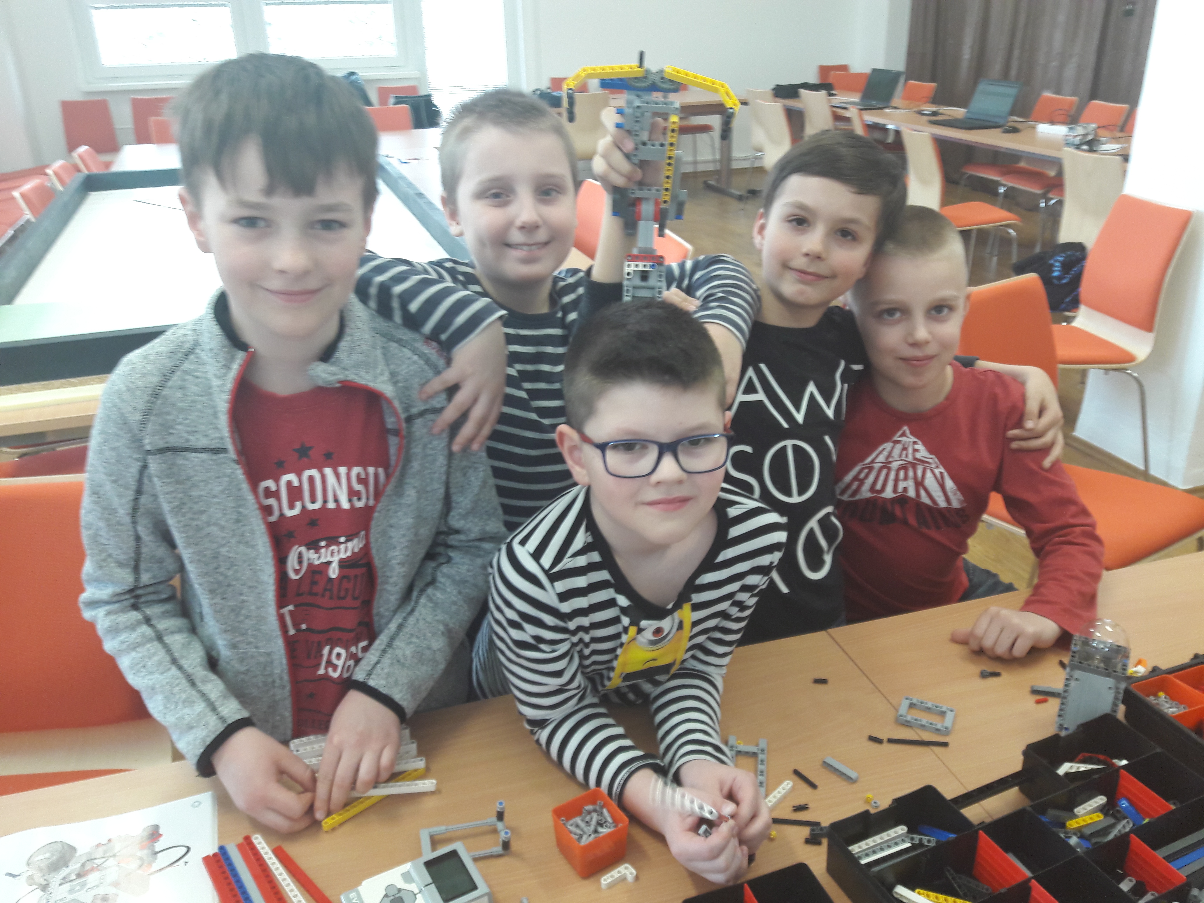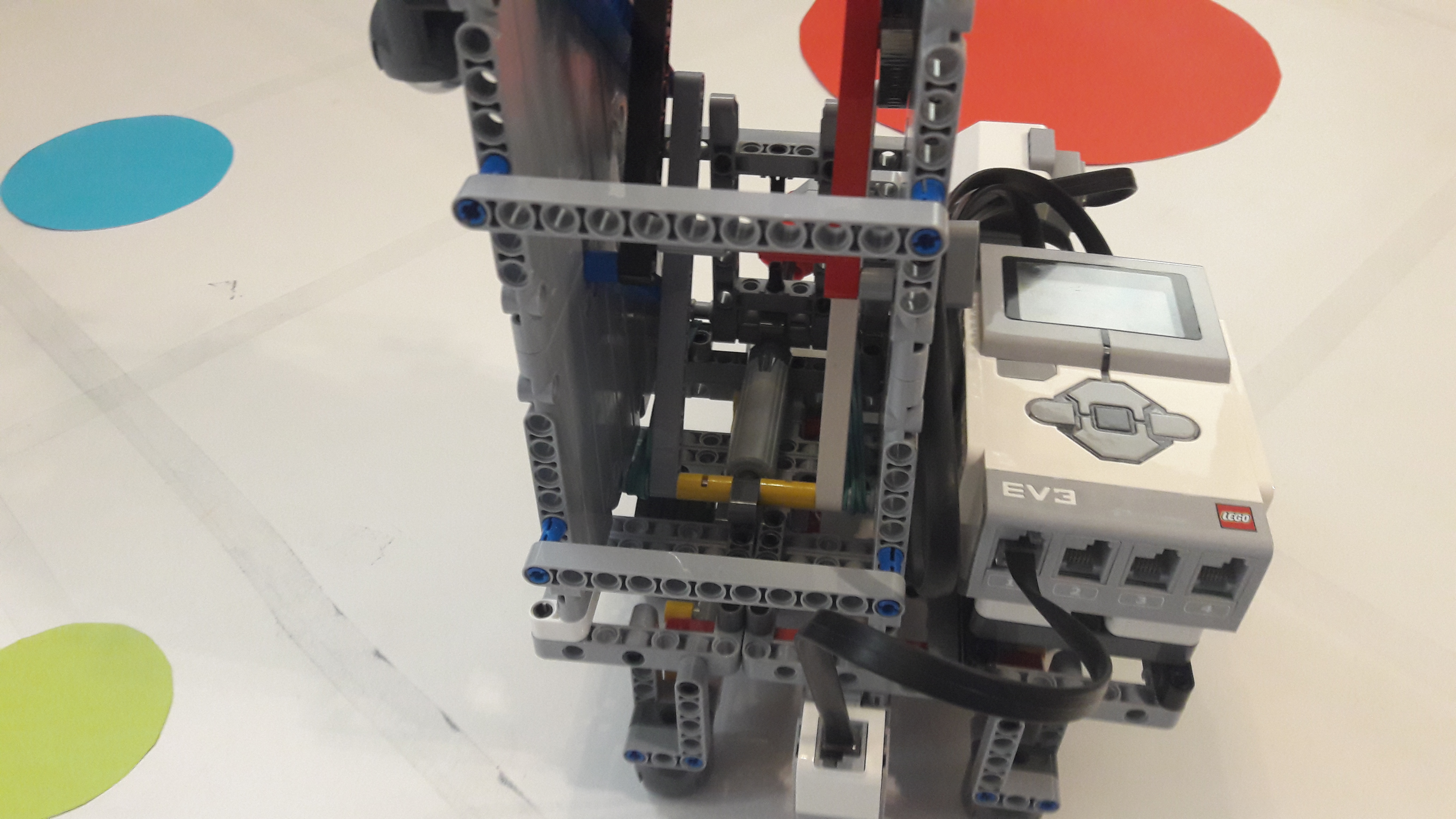 POPIS ROBOTA: náš robot má klasický podvozok na dvoch kolesách poháňaných dvoma large motormi. V predu má dve guličky ako podloženie ťažkej nadstavby, vzadu je tiež jedna gulička. Najdôležitejšia časť je box na uloženie zdvíhacieho ramena.