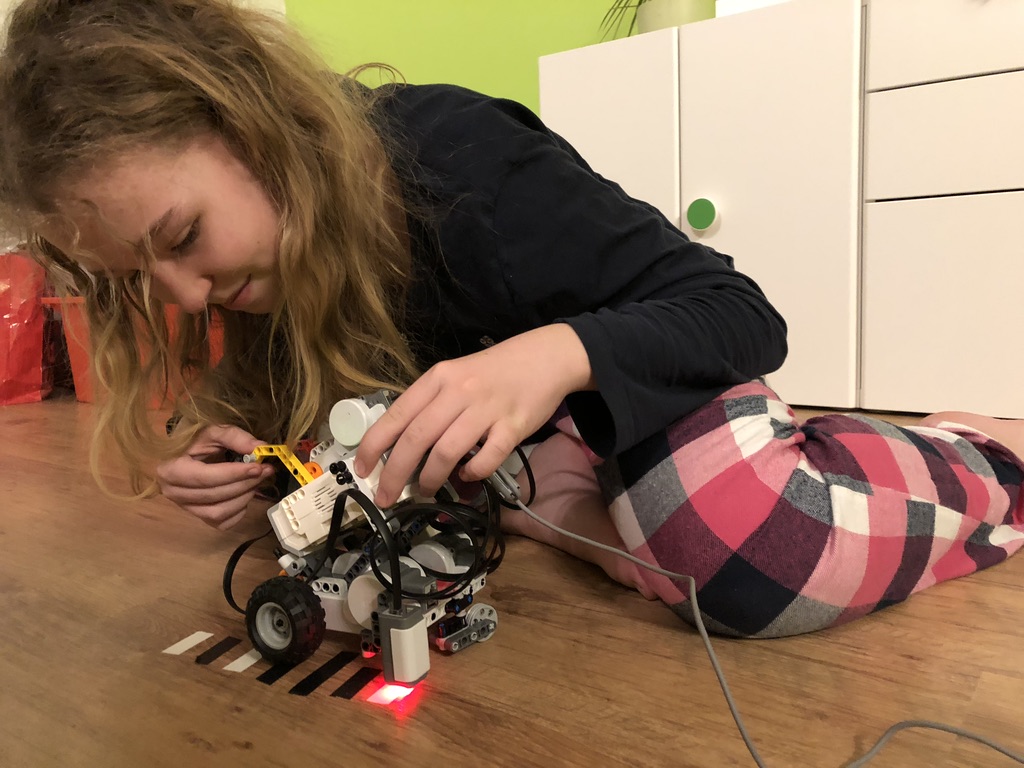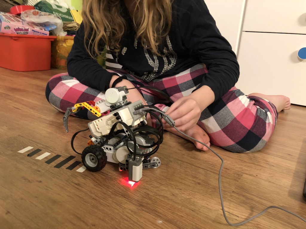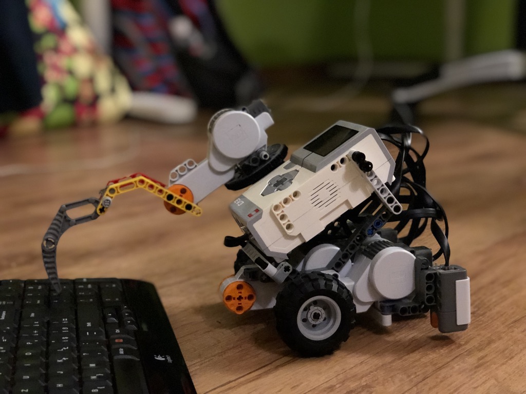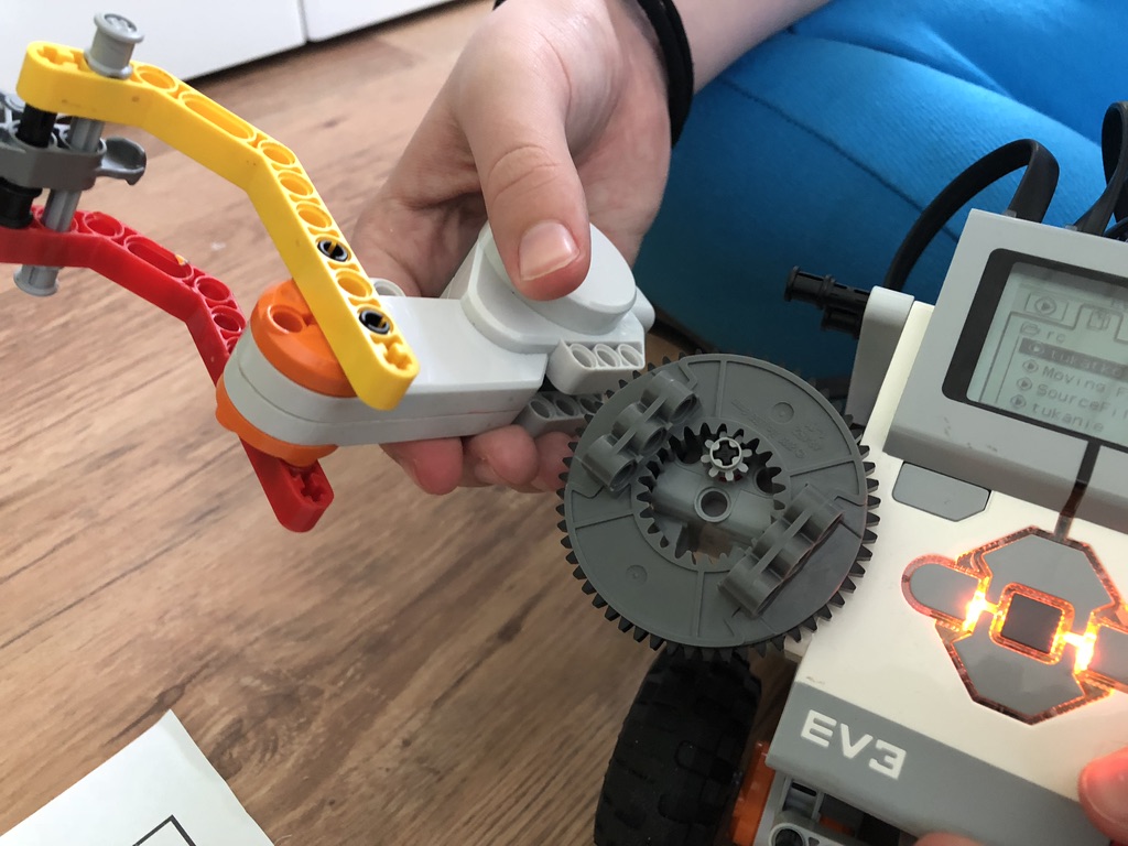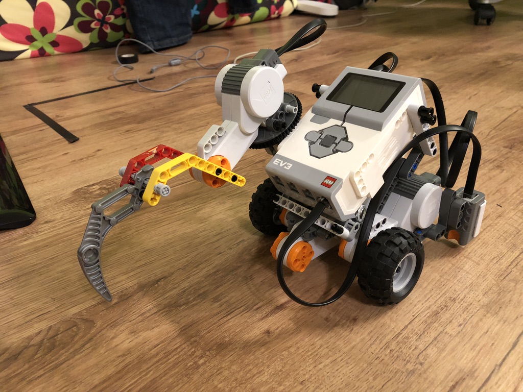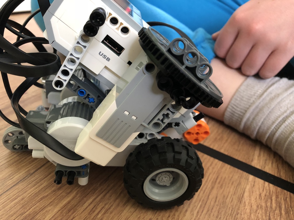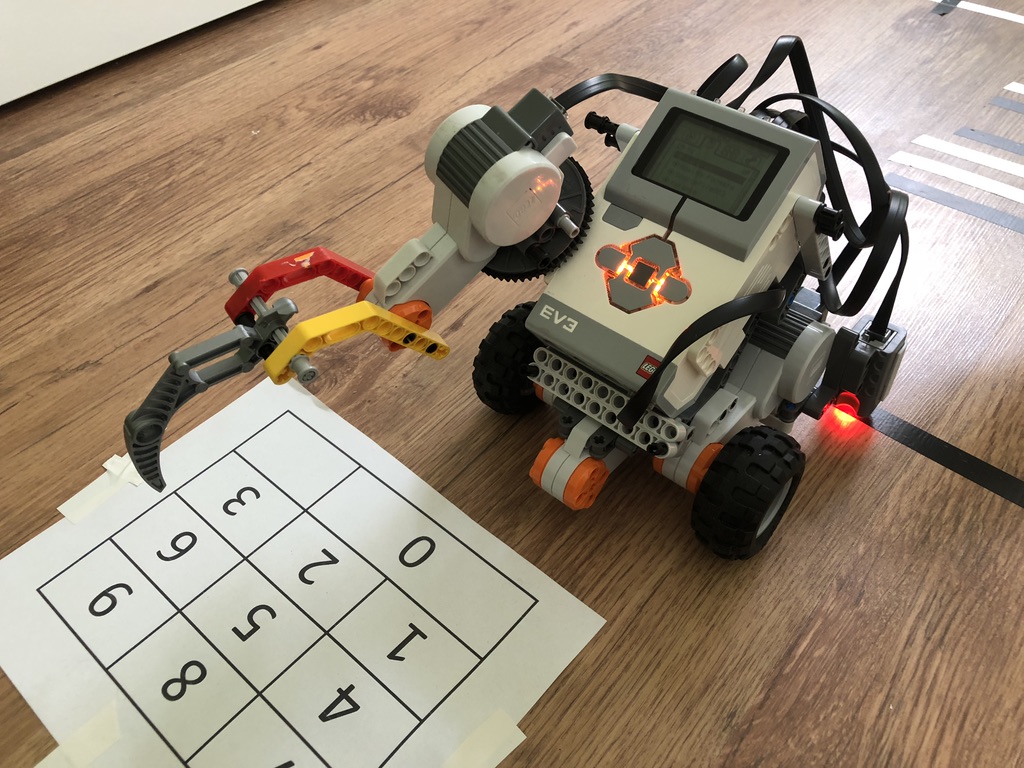 Robot je základnou verziou NXT ale vzhľadom na to ze sme potrebovali 4 motory vymenili sme kocku na EV3. S výmenou bola spojena aj výmena programovacieho prostredia z BricxCC na RobotC. Zostali sme vsak verní C a veľmi sa nam páči. Robot ma 2 motory na pohyb, 1 svetelny senzor,ktory sníma binárne číslo (vo videu - lepiace pásky , biela-1, čierna-0) a 2 motory na pohyb „paznechtu“ ktory používame na vyťukávanie čísel na klávenici.