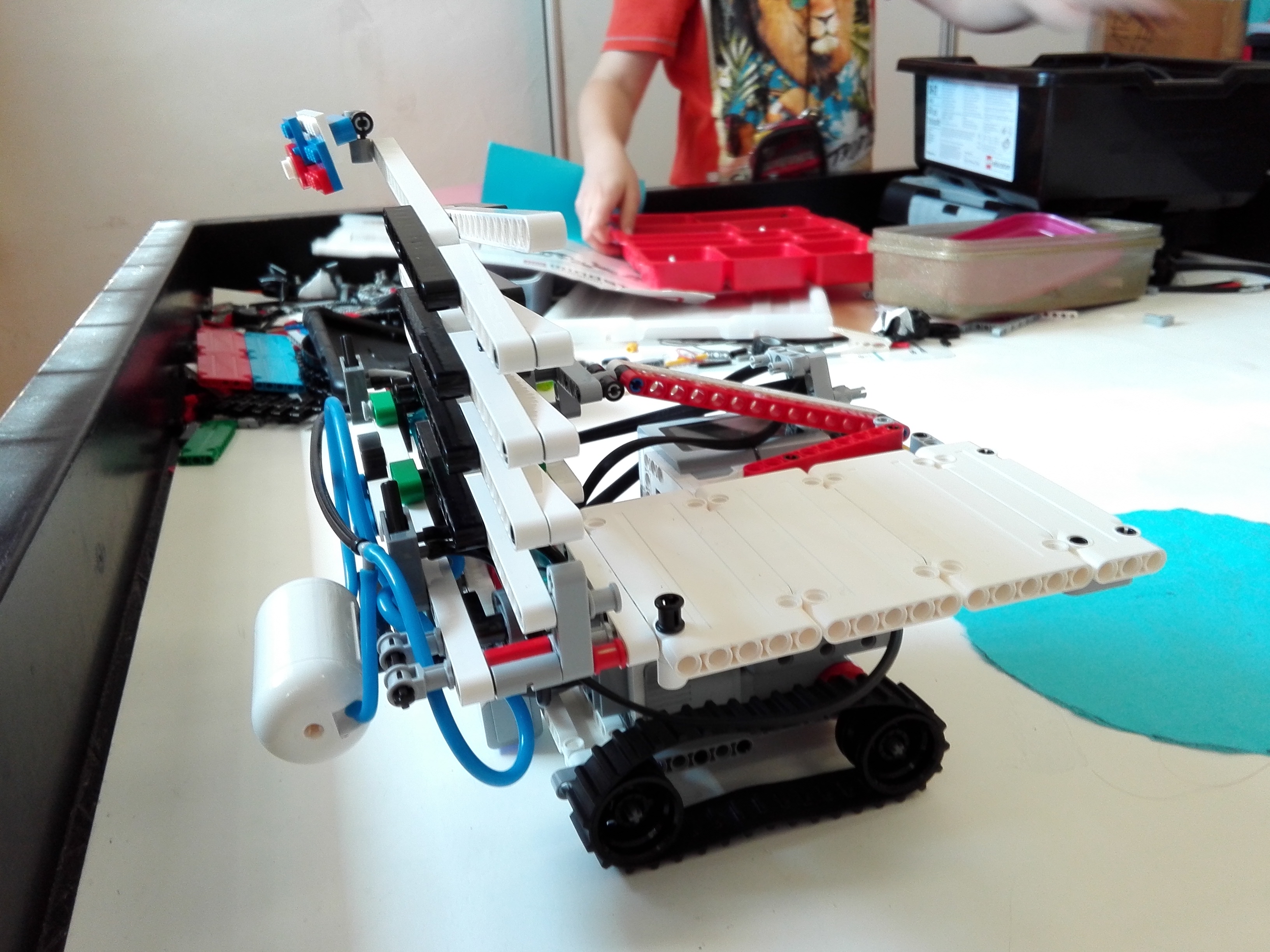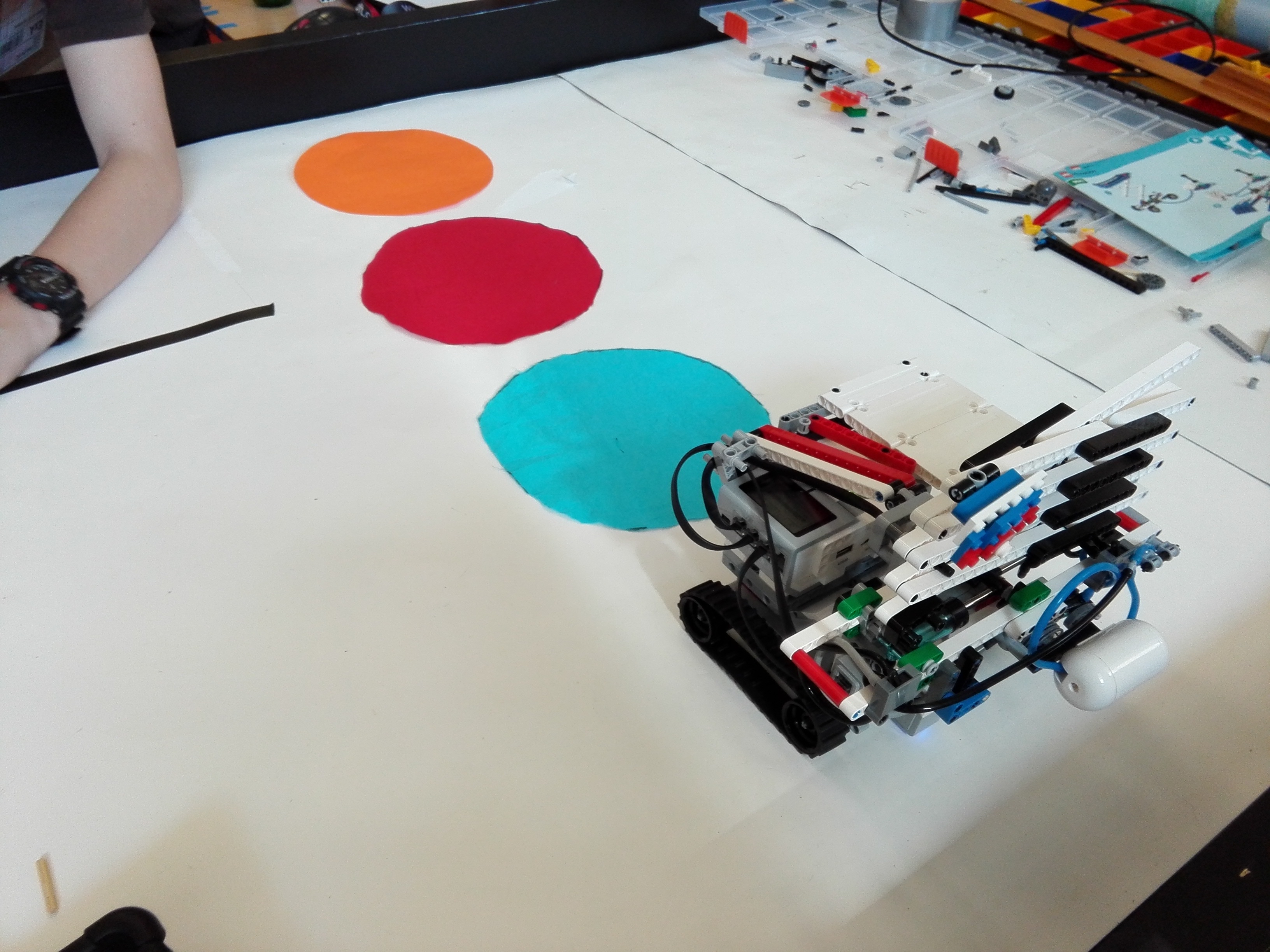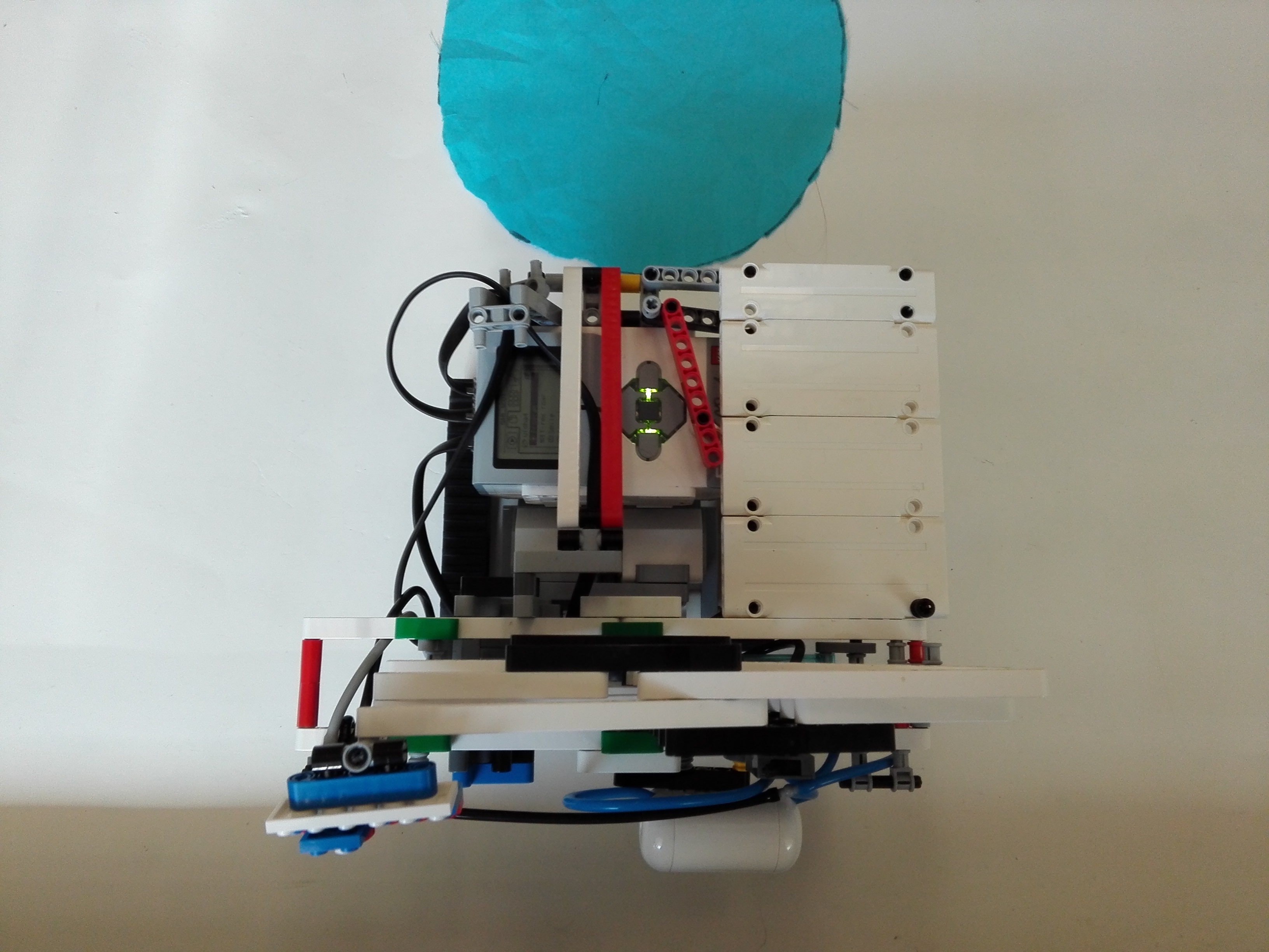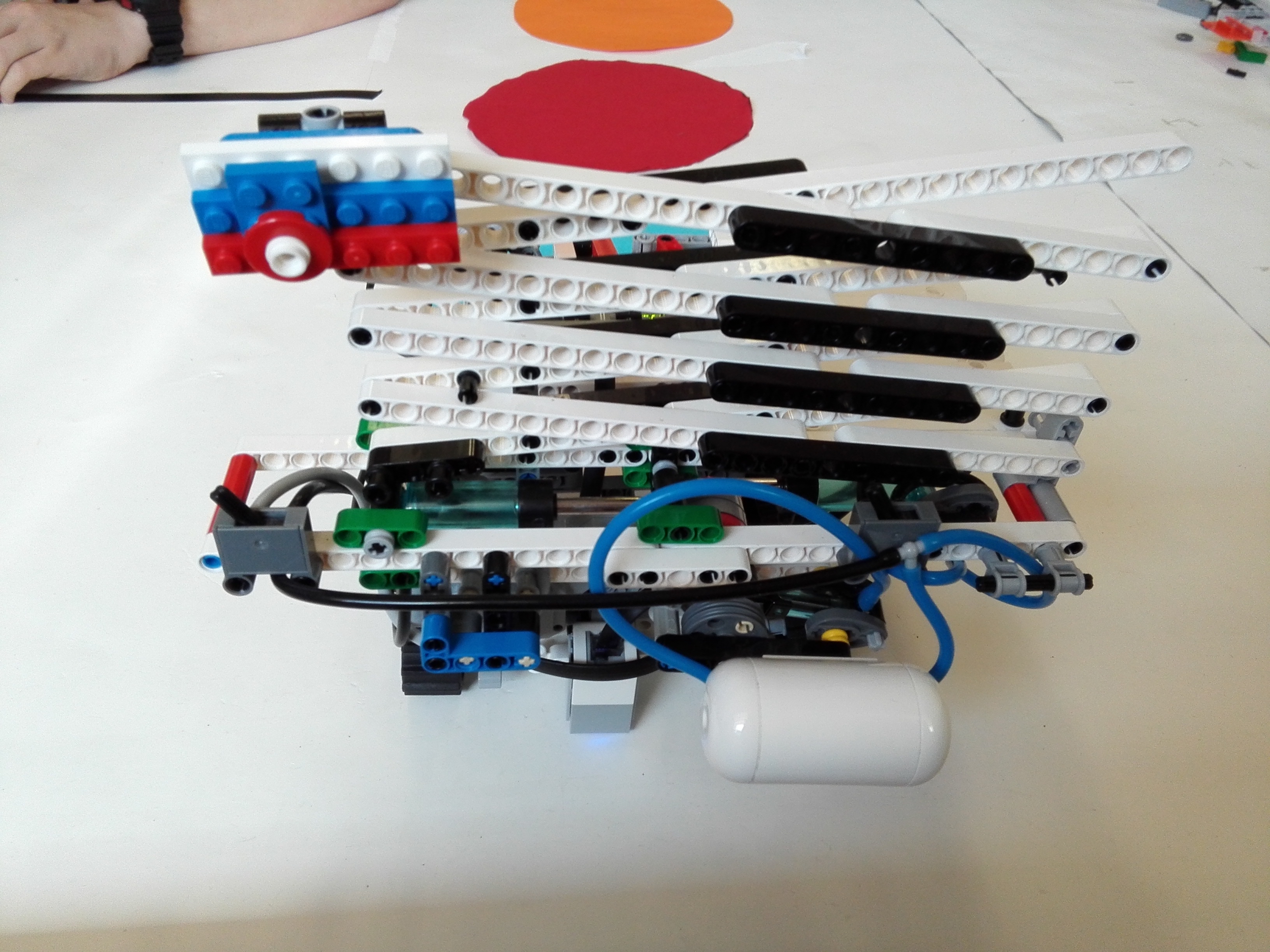 Konštrukcia ihriska Na ihrisku sú za sebou páskou prilepené 3 kruhy (modrý, oranžový, červený) o rozlohe podvozku robota. Konštrukcia robota Náš robot FLAGRAIS3R má 3 motory a 1 senzor. 2 veľké motory mu slúžia ako pohon 2 pásov. 1 veľký motor je napojený na hydraulický piest, ktorý pumpuje vzduch do 2 veľkých piestov (LEGO®, samozrejme). Tie posúvajú x-ovité tyče, čím sa vlastne zdvíhajú do viac ako 2-násobnej výšky robota spolu s vlajkou školy a Slovenska. 1 farebný senzor je umiestnený na zadnej časti robota. Ten sníma povrch po ktorom ide robot a vyhľadáva červenú farbu (Mars). Za kabínou robota sedí samozrejme náš legendárny Joey.