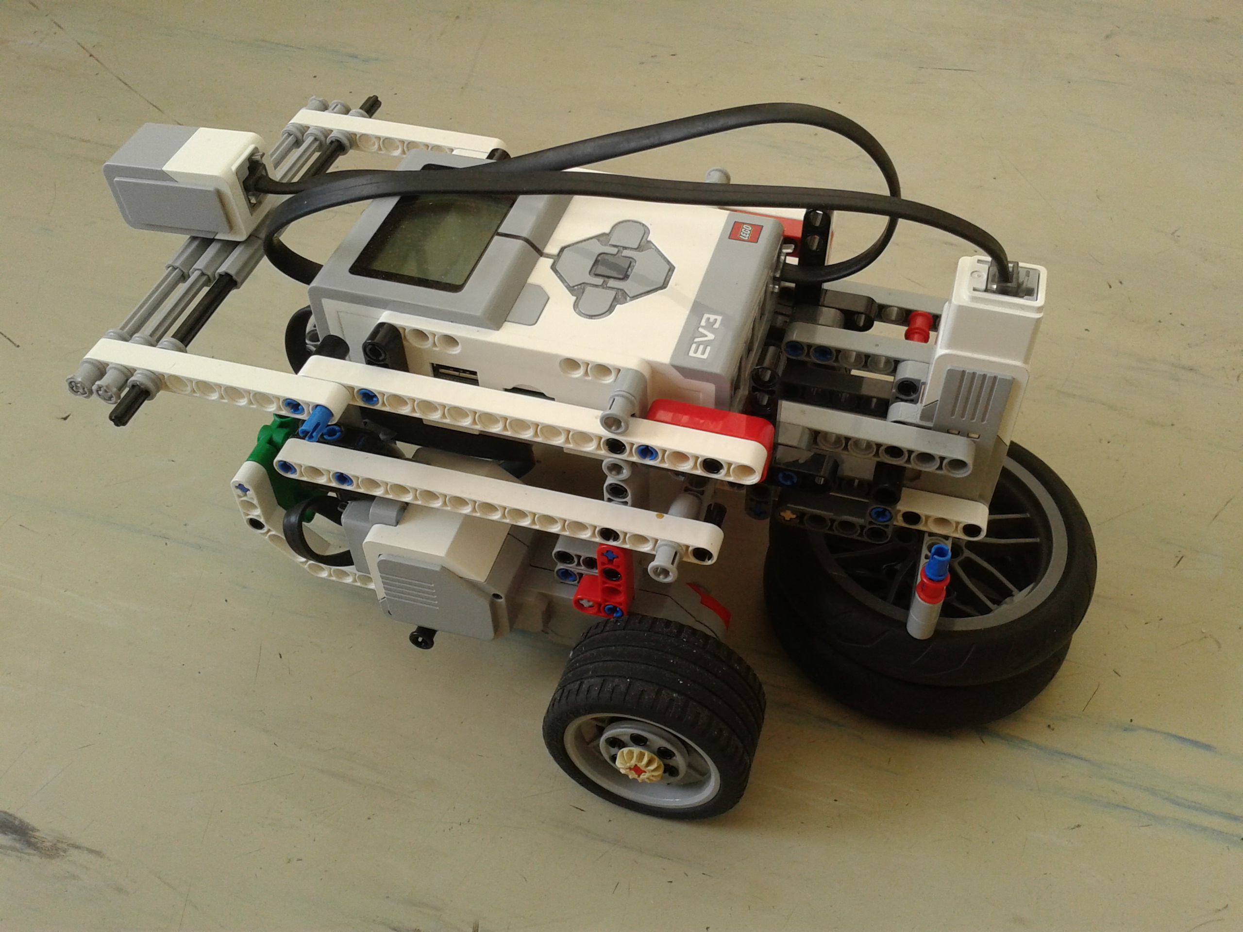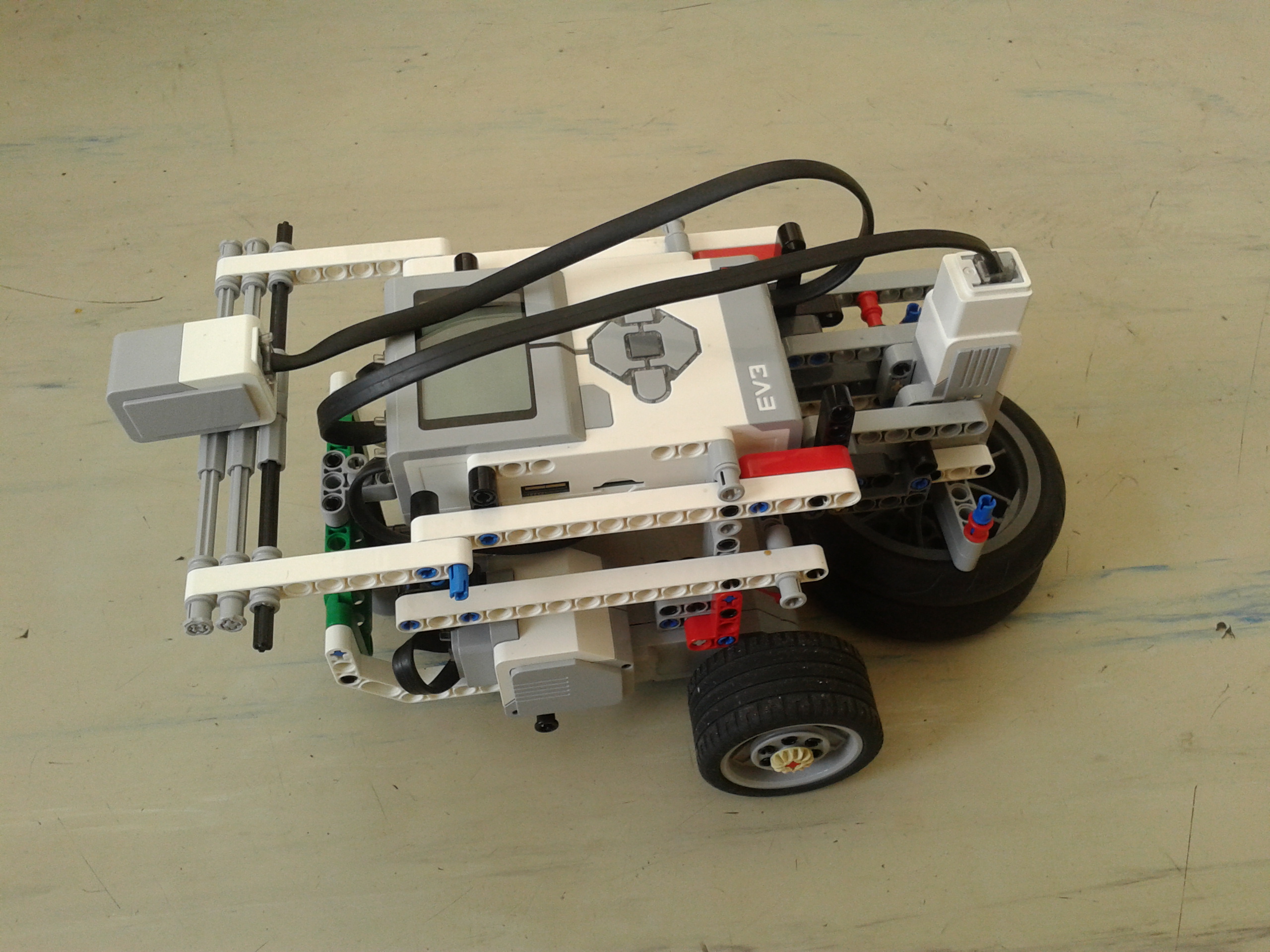 náš robot je vybavený svetelným senzorom. Ak uvidí čiernu, tak sa pohne jedným smerom, ak zelenú tak opačným smerom.