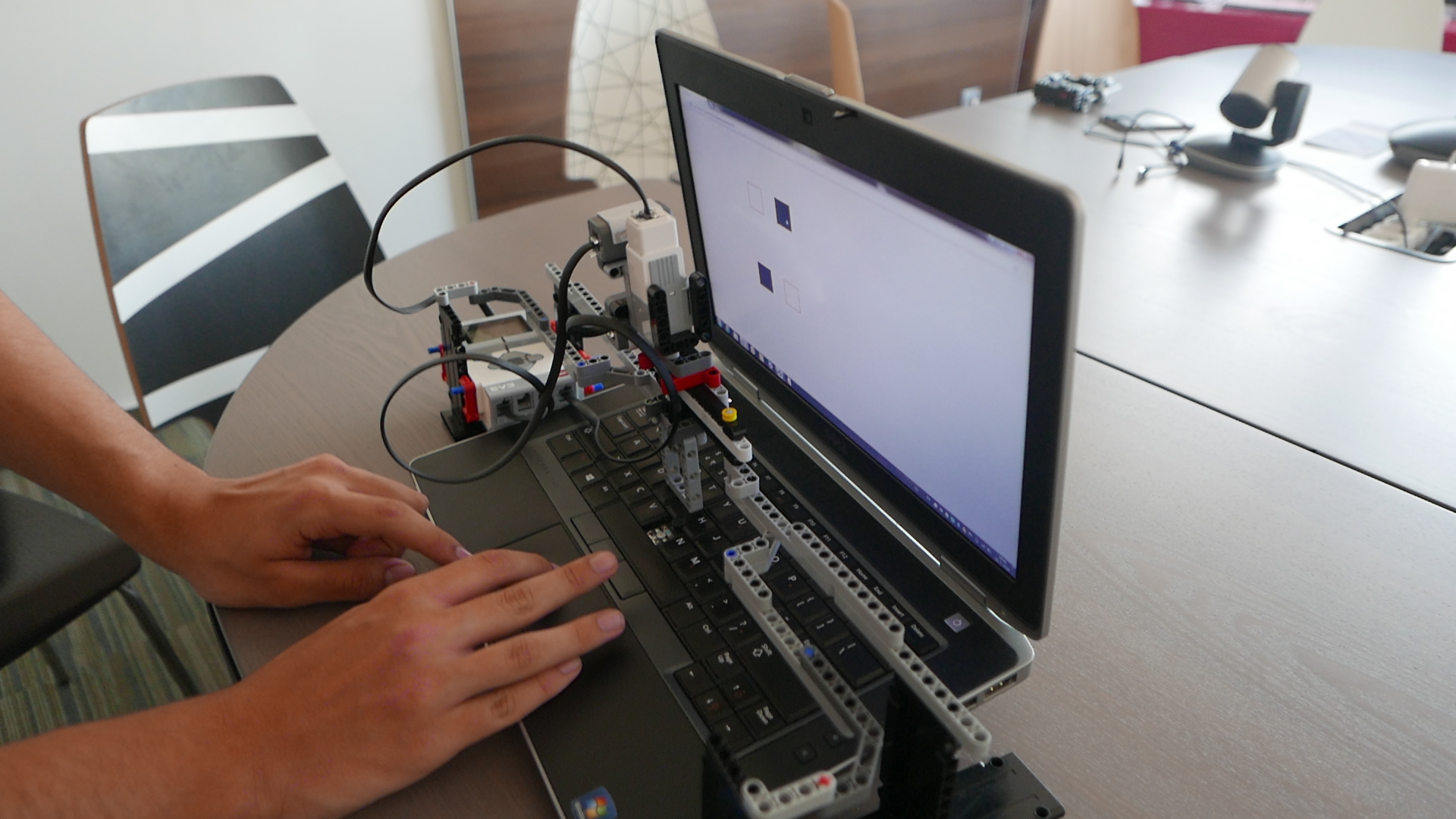 Vysielac je staticky robot s pevnou konstrukciou umiestnenou na klavesnici. Na konstrukcii su 2 svetelne senzory nad sebou. Najskor precita prvy stlpec a potom sa senzory presunu o kusok vedla a tak precitaju druhy stlpec. Po oskenovani kodu sa vozik so senzormi vrati do povodnej polohy.