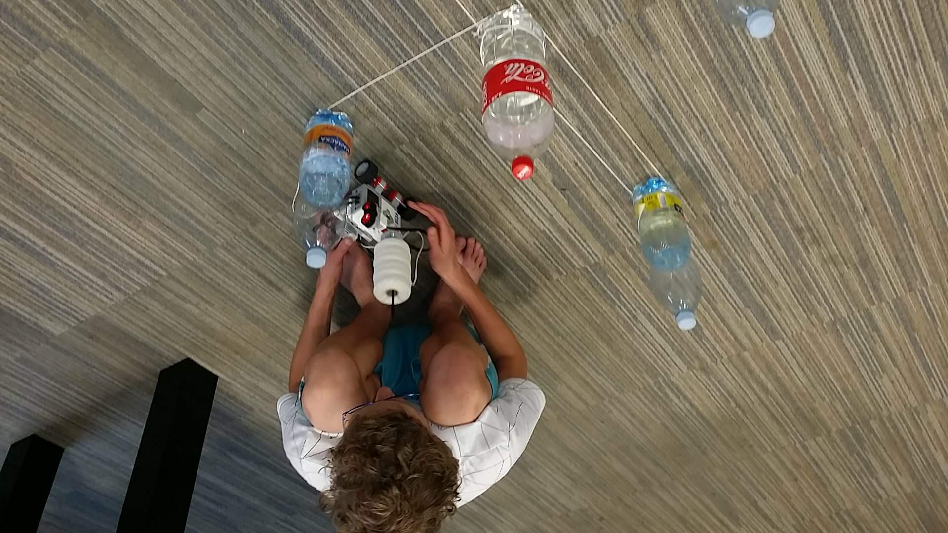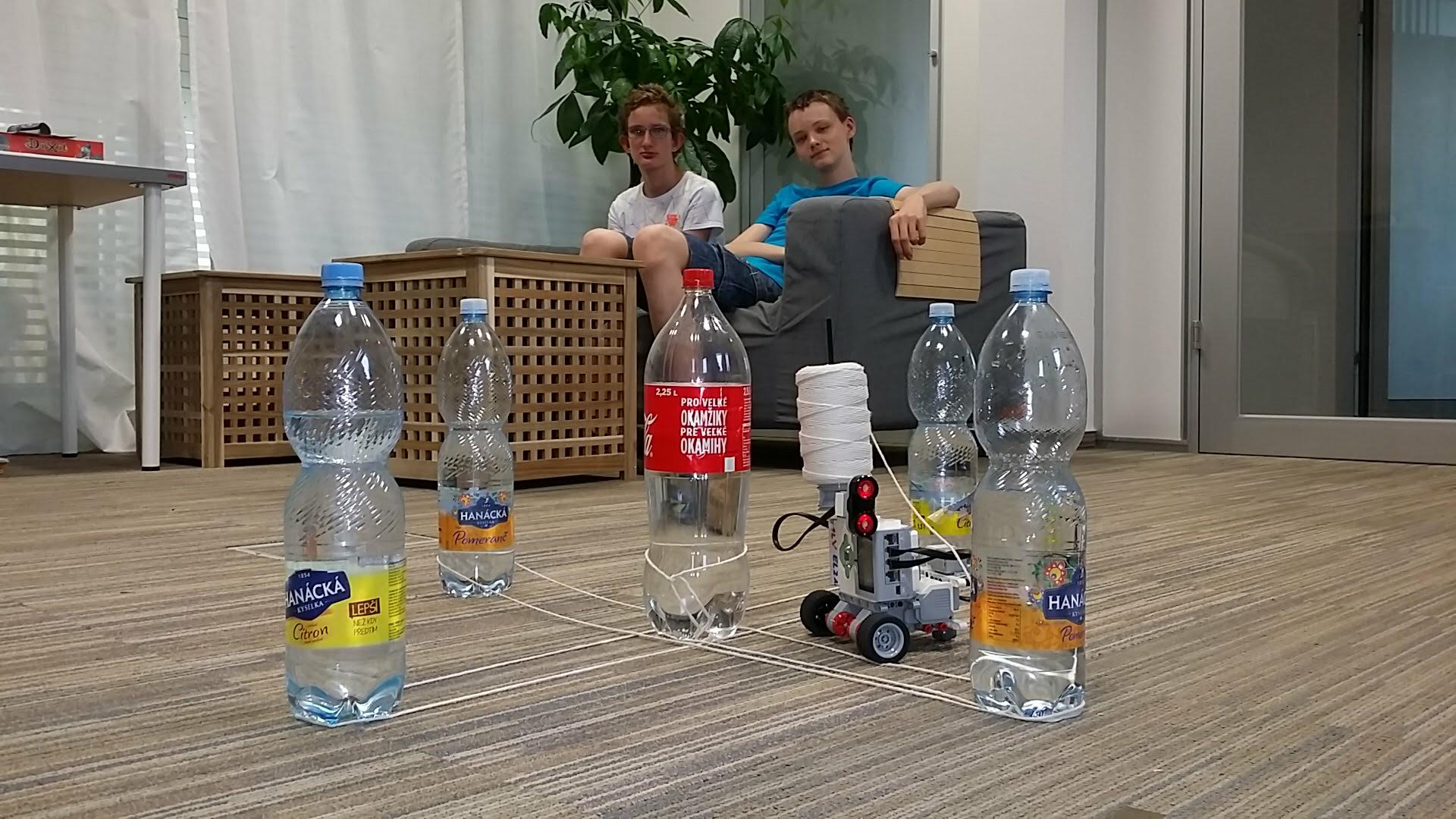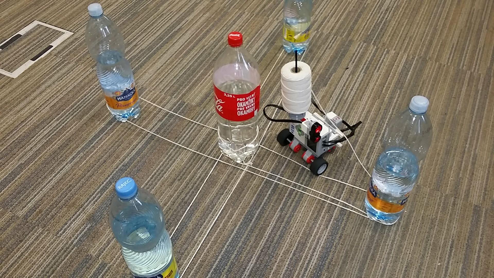 Plán bol zostaviť robota, ktorý obehne okolo pripravených fliaš a omotá okolo nich špagát. Fľaše mali byť rozostavané v tvare hviezdy. Pôvodne sme mali 11 fliaš v tvare hviezdy, ale po niekoľkých fľašiach už robot nevedel presne, kde sa nachádza, tak sme mu to zjednodušili. Bohužiaľ nedokázal presne obísť ani 5 fliaš. Posielame aspoň to riešenie, ku ktorému sme sa stihli dopracovať po 7 schôdzkach. Video je úmyselne zostrihané tak, aby bol jasný zámer, ako sme to chceli riešiť.