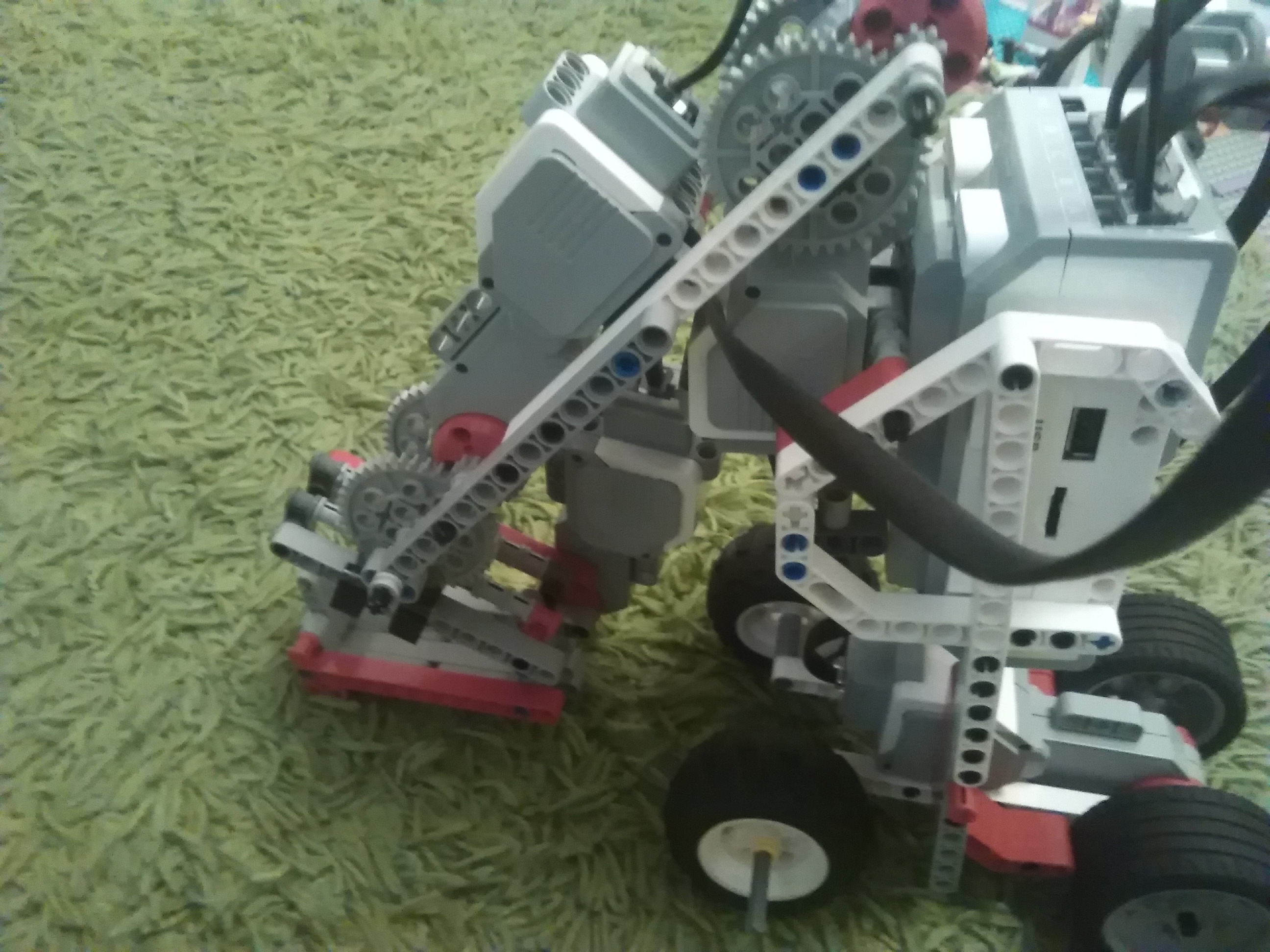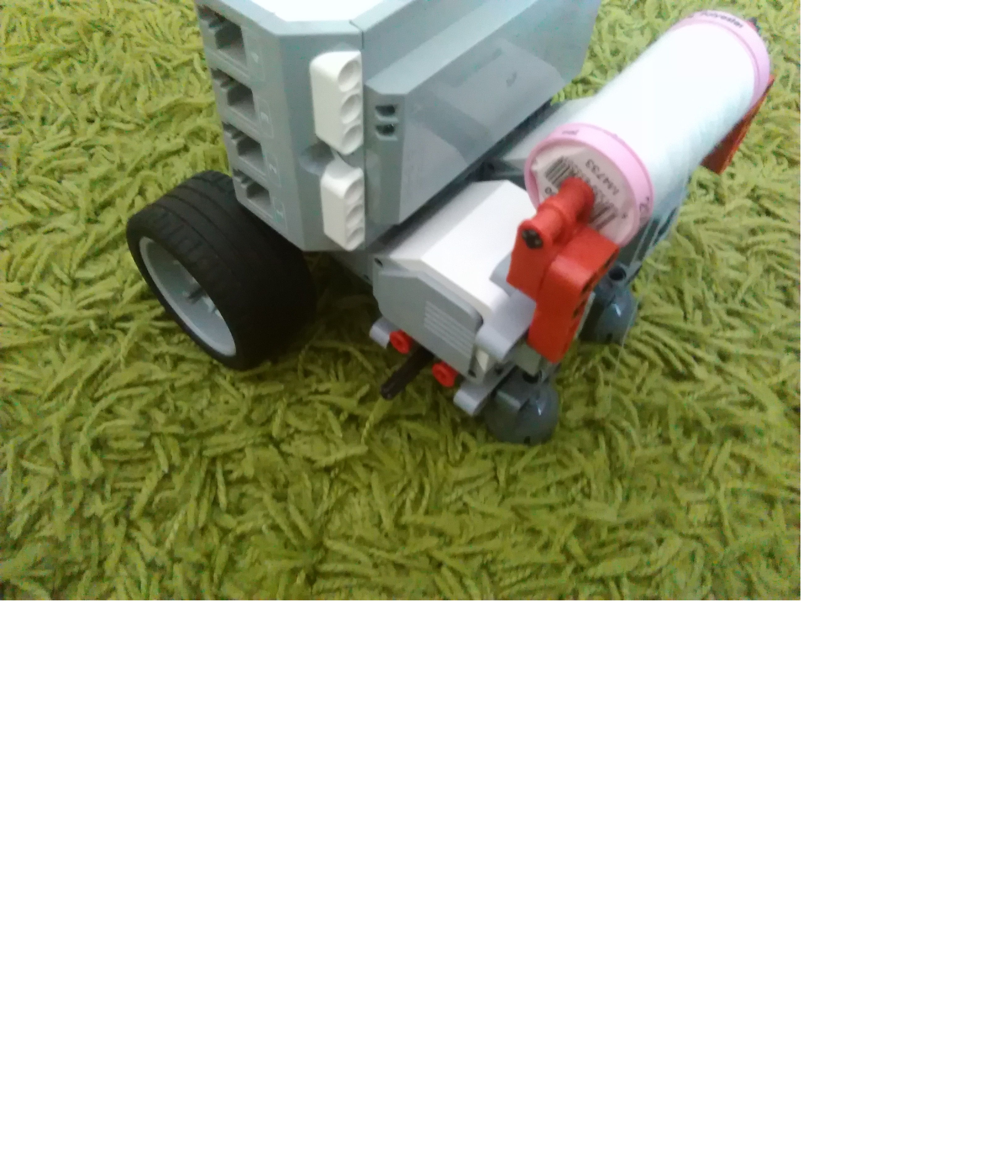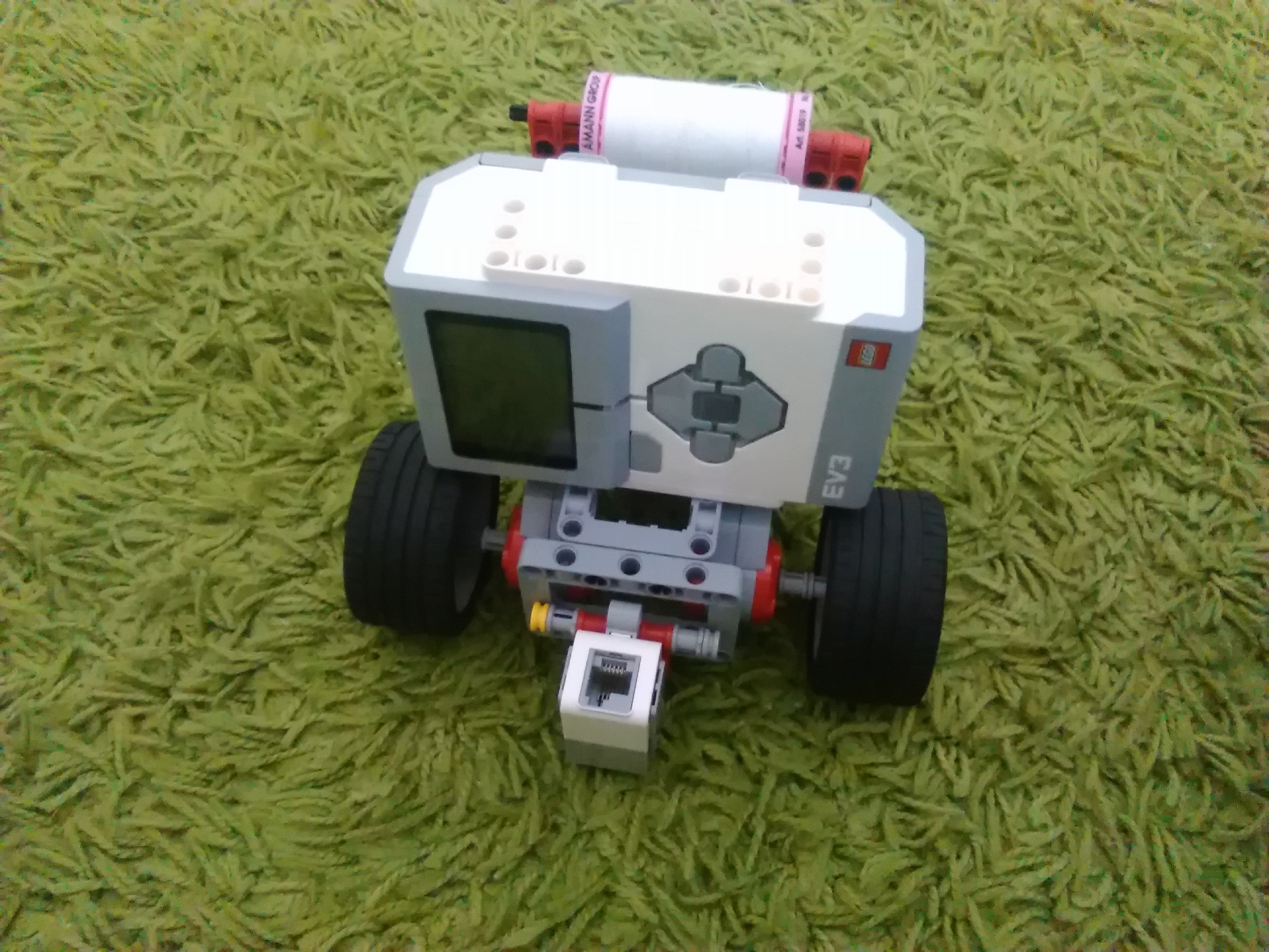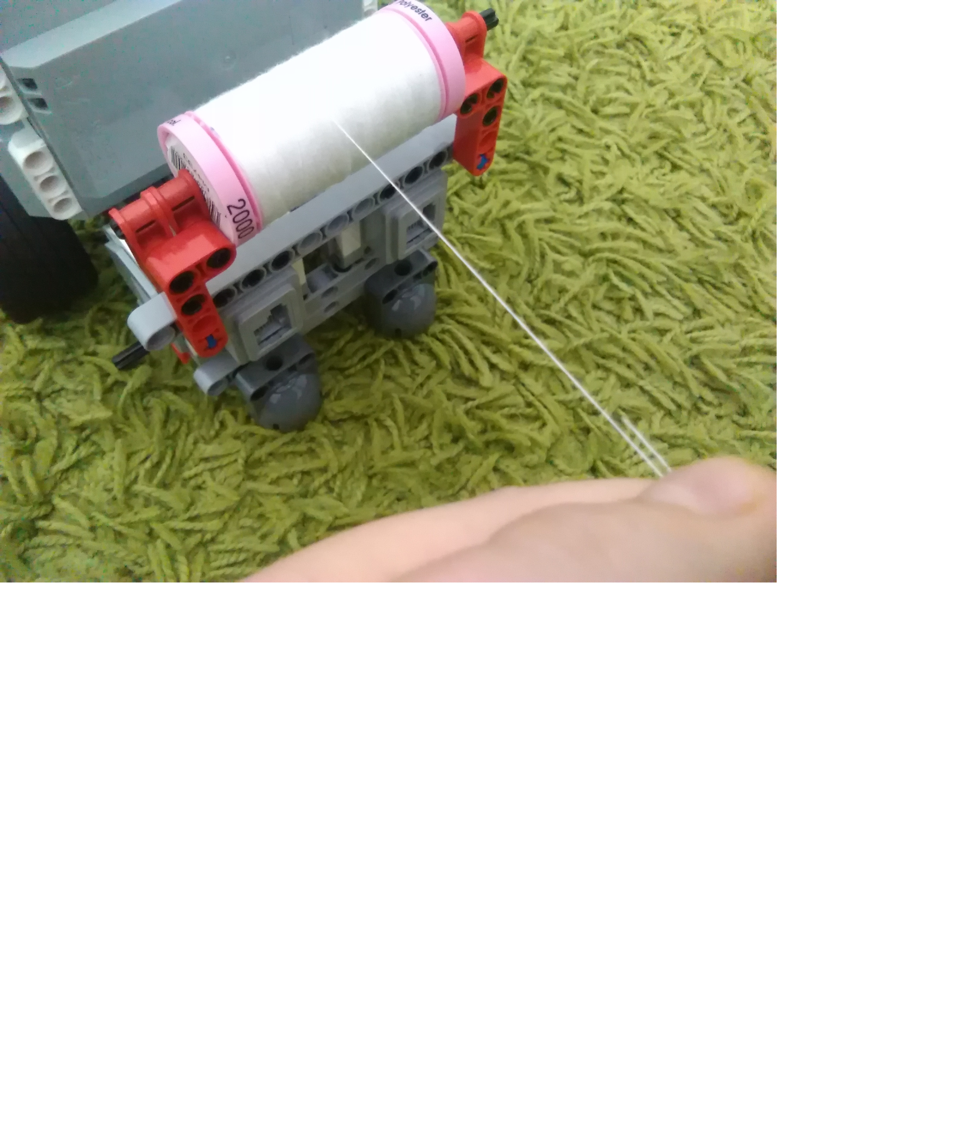 Postavili sme male roboticke auticko pozostavajuce z 2 large servo motorov na pohyb kolies a 2 kovovych guliciek ktore su jeho pomocne kolieska. Do prednej casti sme robotovi upevnili aj 1 color senzor aby mohol sledovat ciaru a podla nej upliest pavucinu. Dozadu sme umiestnili tenku nitku na navijaku.