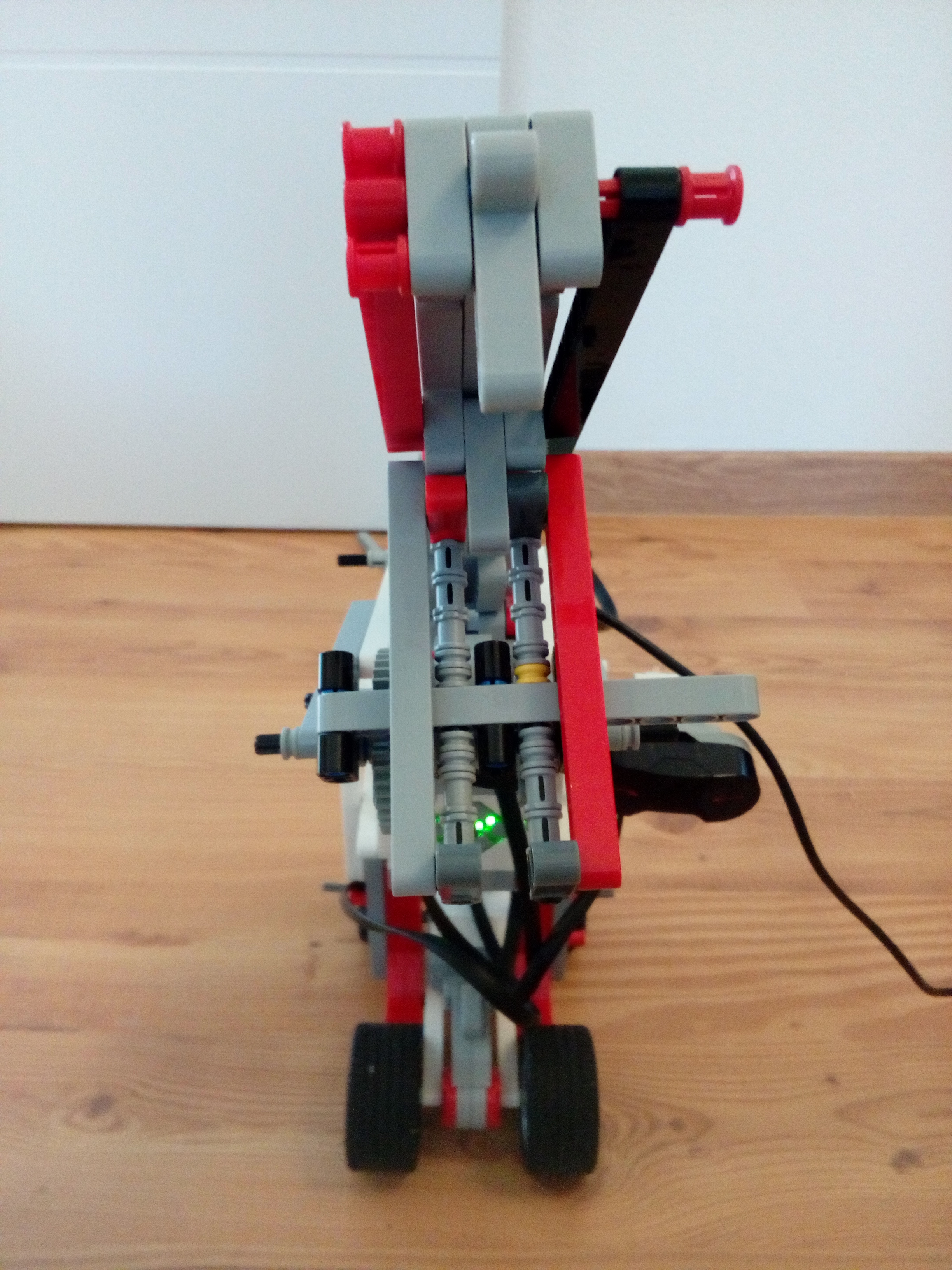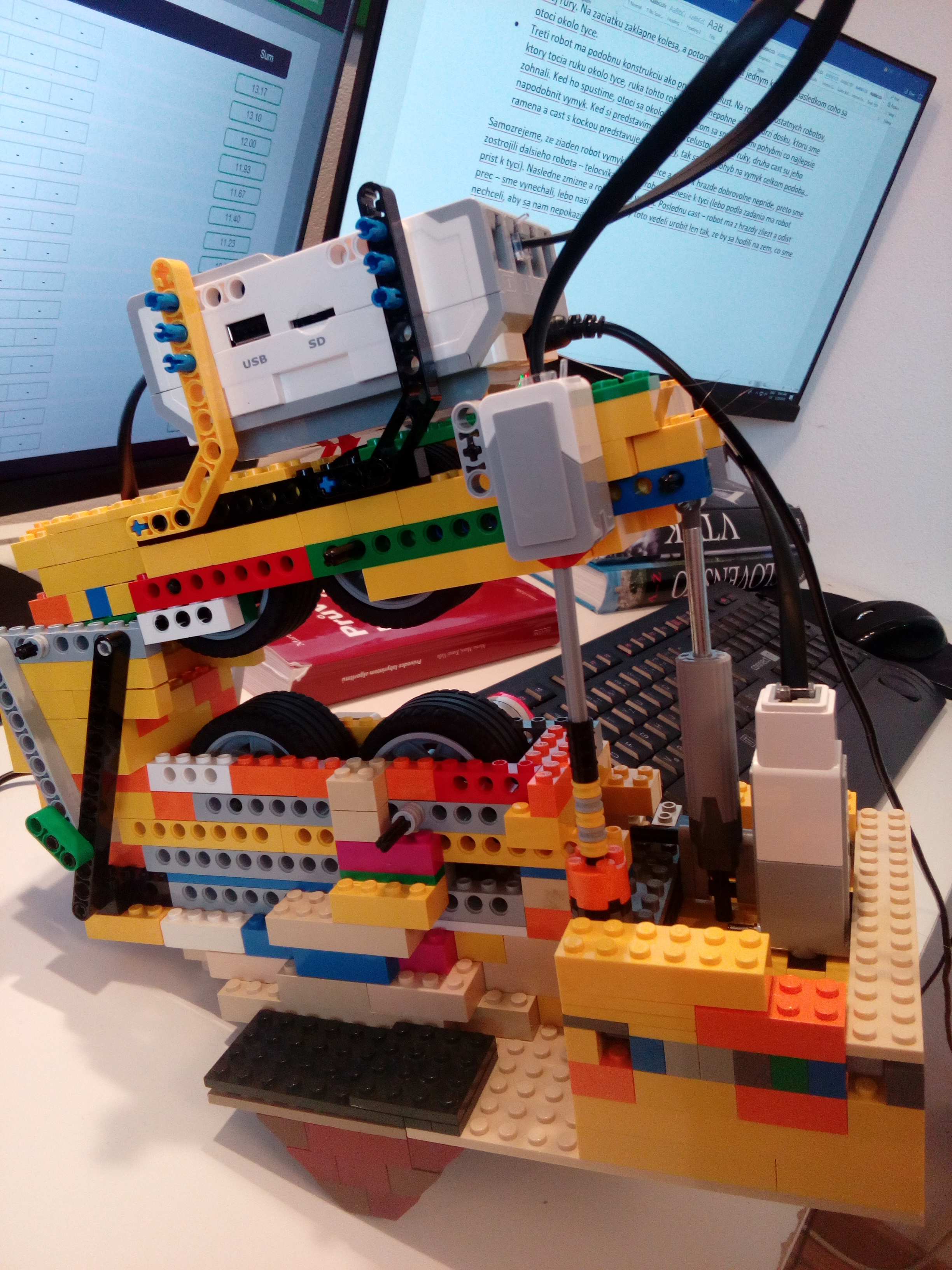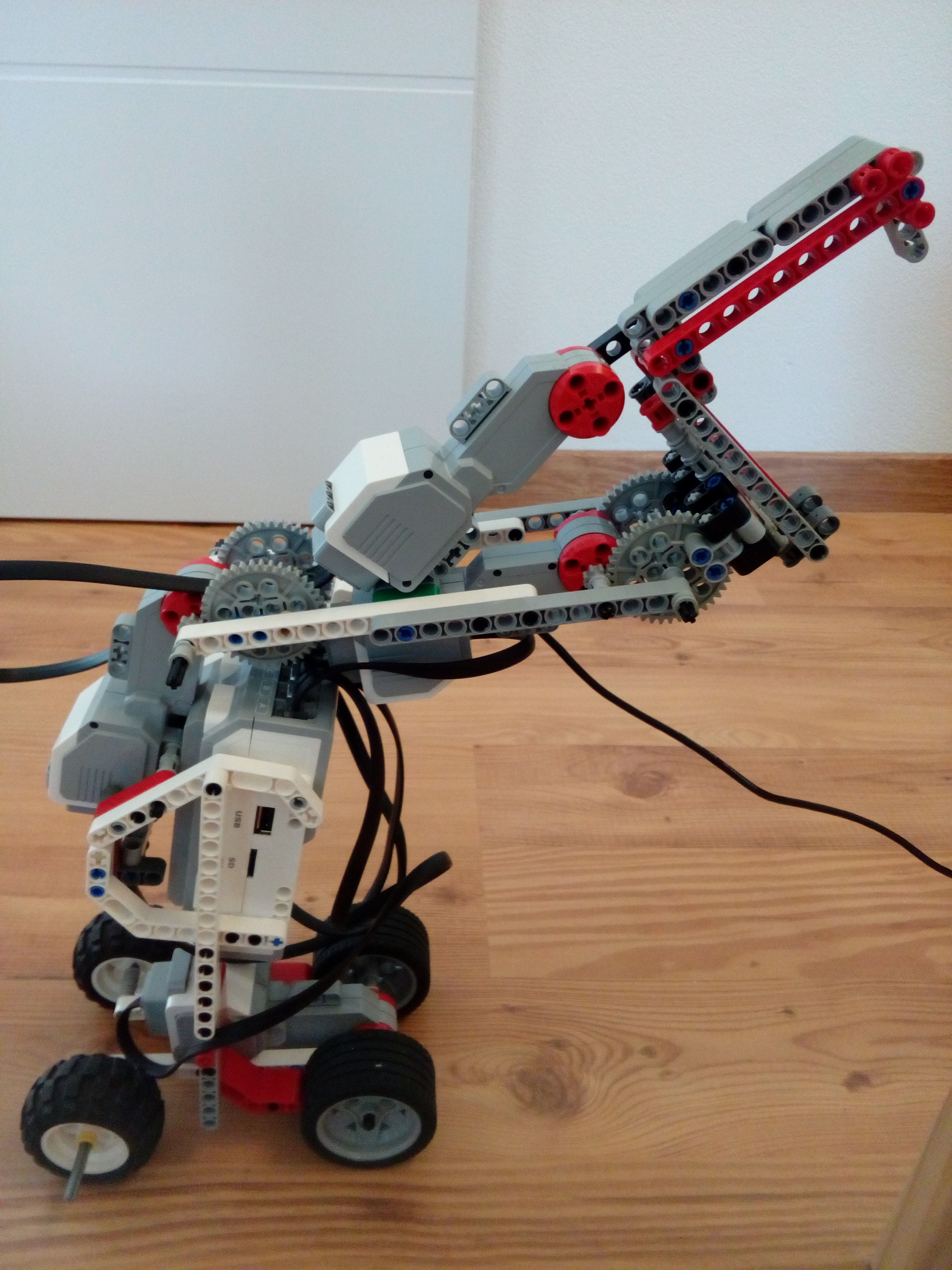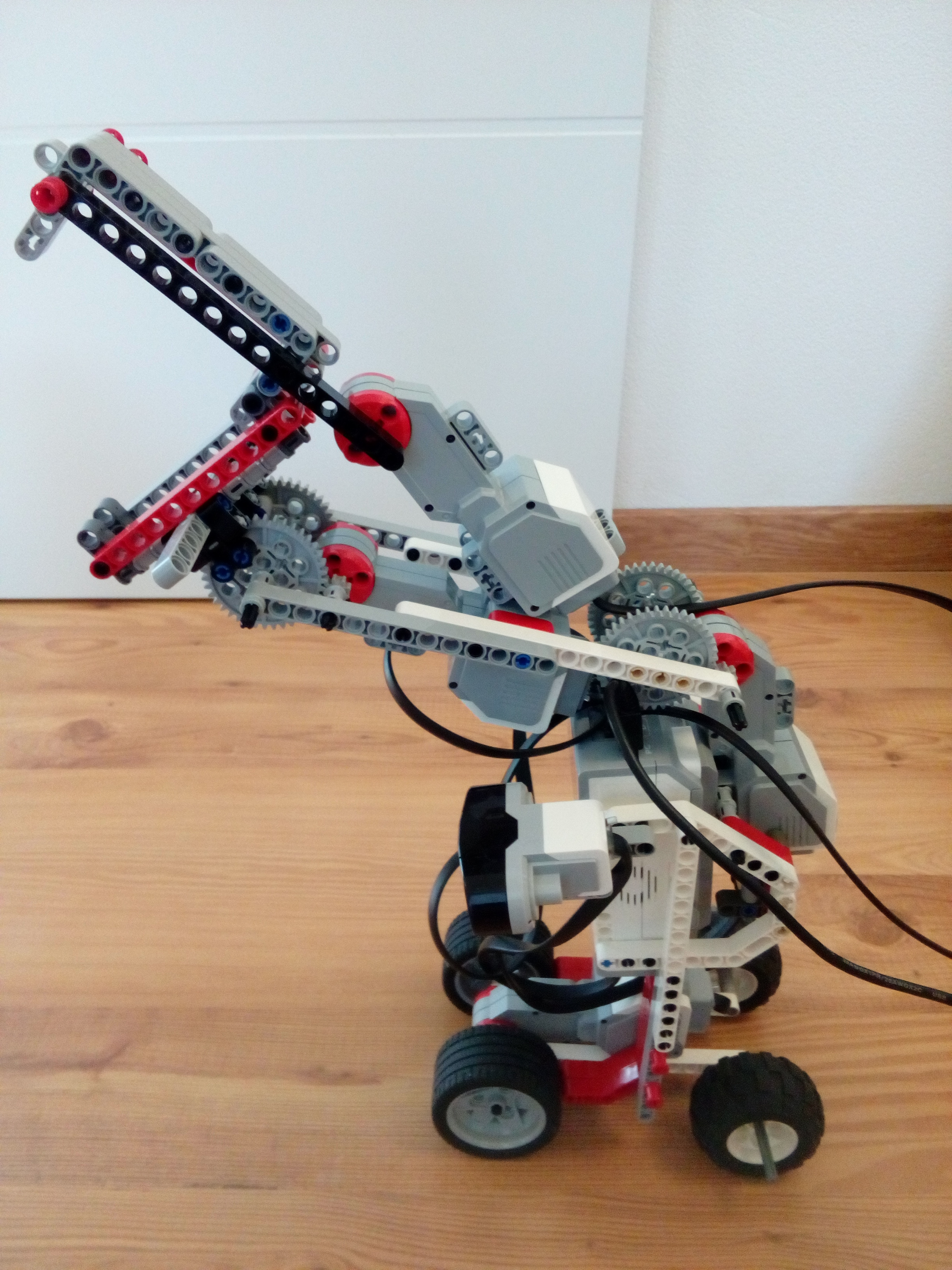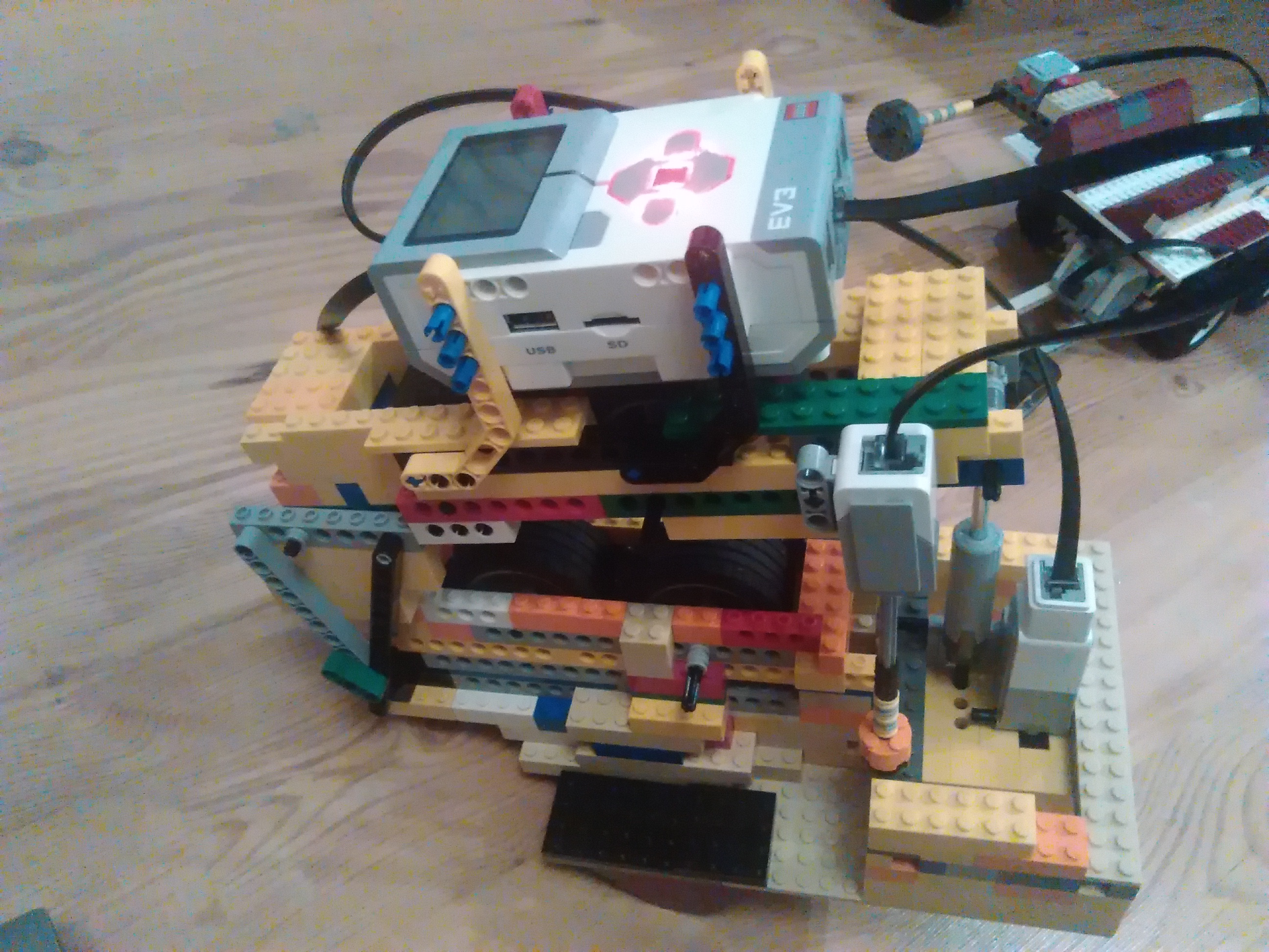 Postavili sme male roboticke auticko pozostavajuce z 2 large servo motorov na pohyb kolies a 2 kovovych guliciek ktore su jeho pomocne kolieska. Do prednej casti sme robotovi upevnili aj 1 color senzor aby mohol sledovat ciaru a podla nej upliest pavucinu. Dozadu sme umiestnili tenku nitku na navijaku.