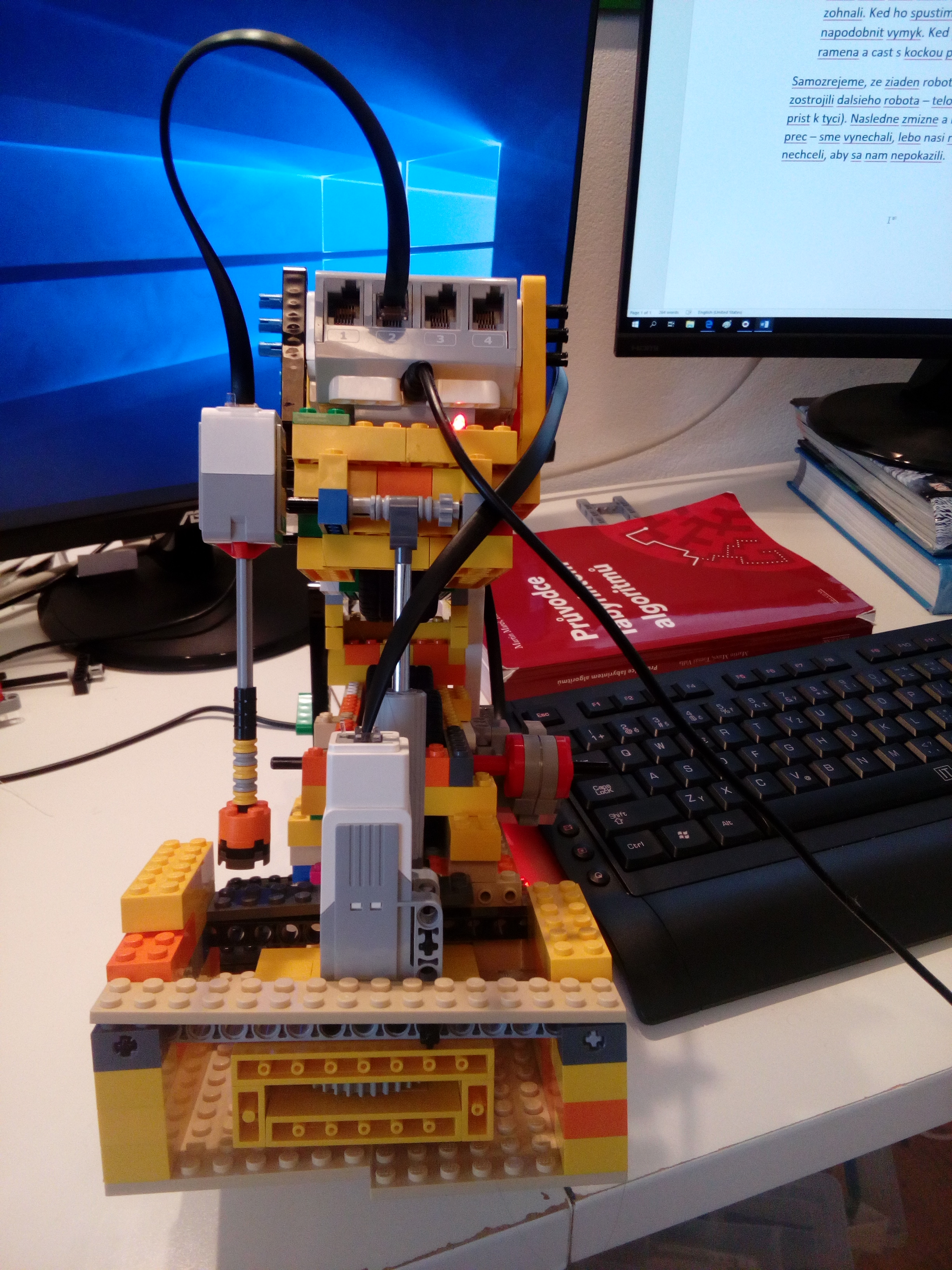 Spoločné: Toto kolo malo azda najnáročnejšie a najbizarnejšie úlohy, sme radi, že sa našiel jeden tím, ktorého robot túto obľúbenú gymnastickú figúru zvládol! Tu sa ukázala dobrá priestorová predstavivosť a šiesty fyzikálny zmysel. Dúfam, že ste si všetci pozreli, ako EV3 dokáže spraviť vymyk, stojí to za to. Pavučinky boli pracné, ale niektoré sa vcelku podobali na pavučinu. Čakal som, či niekoho nenapadne robiť skutočné zapletanie, alebo či sa tu náhodou neobjaví nejaký tkáčsky stroj, prípadne nejaké lepkavé vlákno, ktoré sa na seba bude lepiť ako žuvačka, ale aj takto dobre. Ide sa do finále, užime si spolu posledné kolá! 2sestry: ďakujeme za vytrvalosť. Cenu pre vás stále odkladáme, dúfame, že čoskoro ju budeme môcť udeliť! Základ pavučinky by tu bol, fajn. Rozhodcovia napísali: 1. Pekný začiatok, škoda že ste nemali čas to poriadne dokončiť. 2. Robot pohybuje okolo stola a prejde dráhu v tvare obdĺžnika. Neťahá však za sebou ani niť (alebo ju nevidieť). 3. Za úlohu Pavučina získavate 2b, nakoľko sa robot pohybuje len to so zásahom kvôli usmerneniu pohybu.