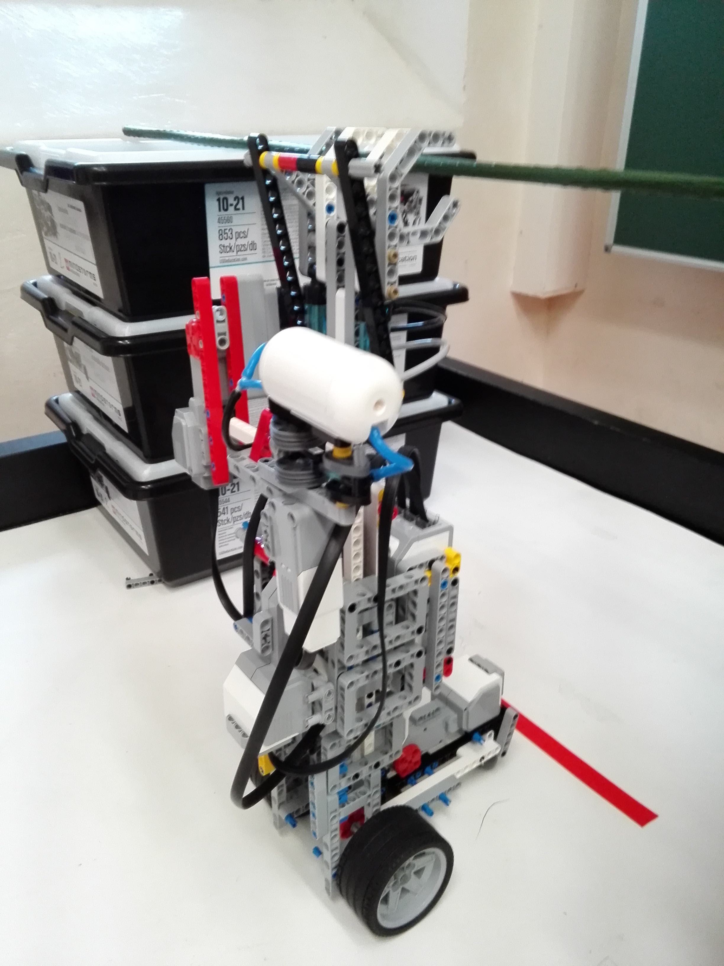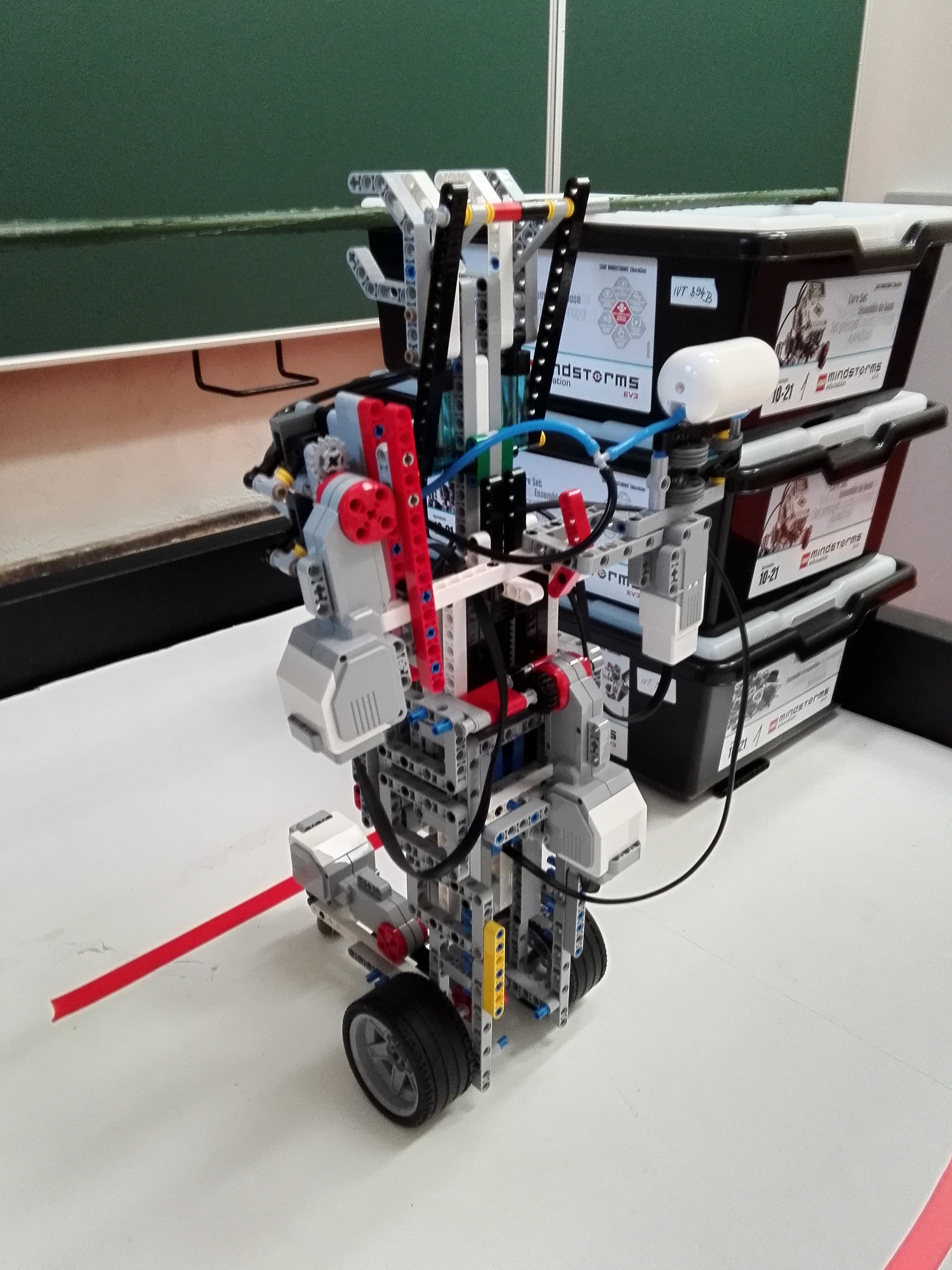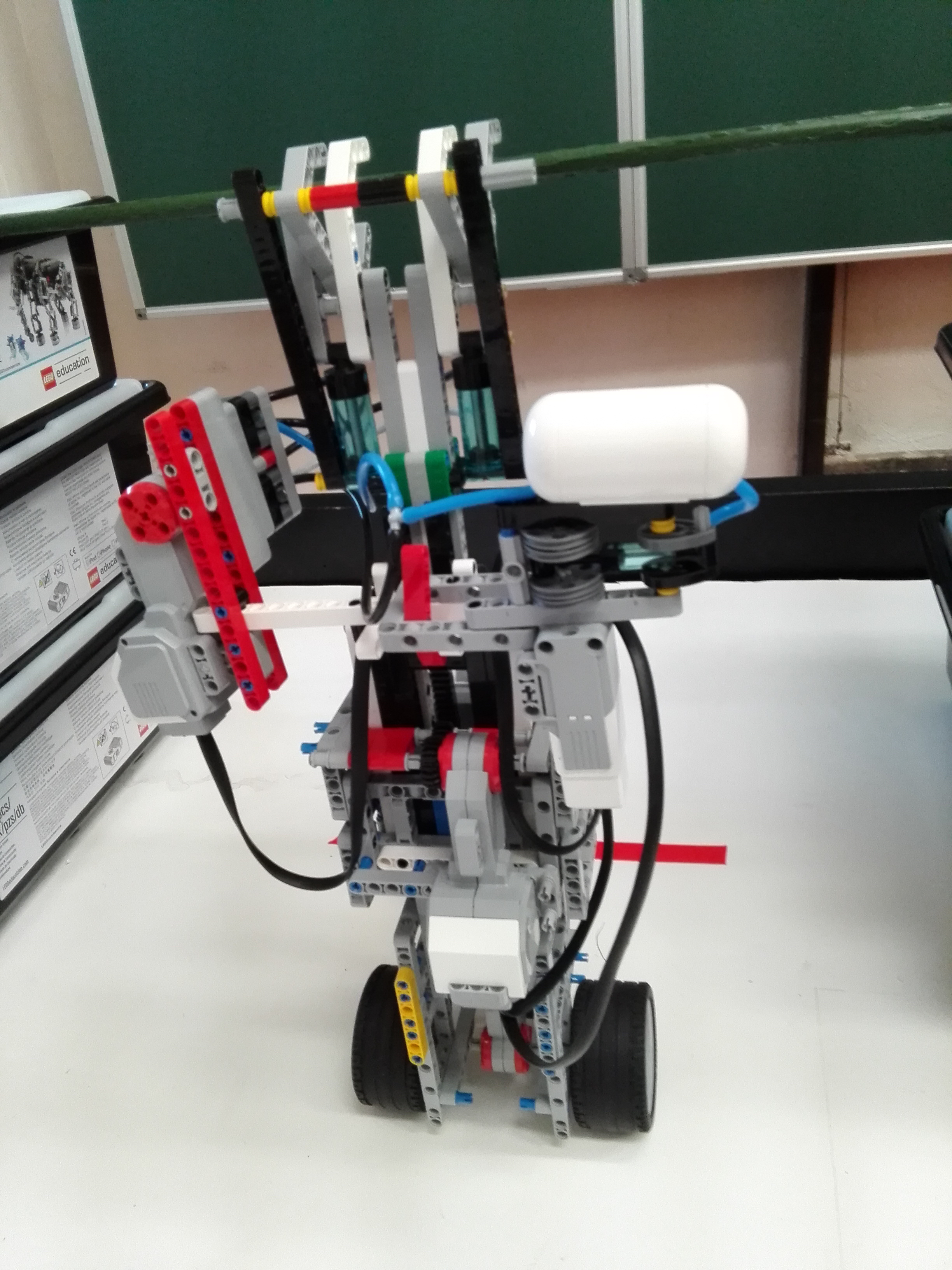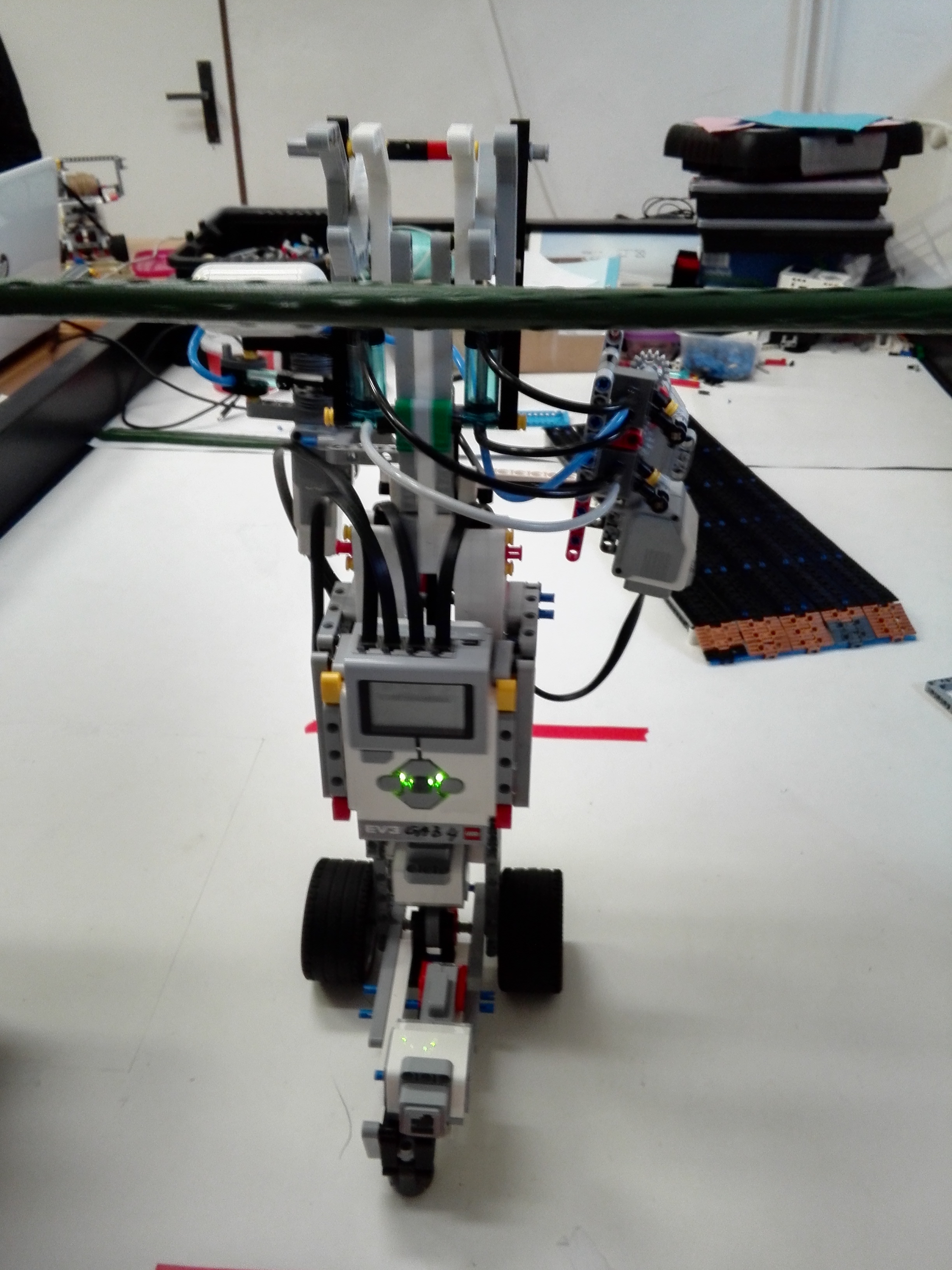 Konštrukcia ihriska3 krabice na každej strane a naše ruky držia hrazdu. Medzi nimi sú 2 pásky pre zarovnanie robota. Pred robotom je rampa, po ktorej sa rozbehne a urobí výmyk.Konštrukcia robotaNáš robot SWIPEMAK3R má 4 motory. Jeden veľký mu slúži na pohon 2 kolies, pričom ten dopĺňa ešte kovová gulička, ďalší (piaty) má len ako záťaž. Druhým posúva EV3 kocku hore a dole (mení ťažisko). Tretím posúva pneumatické páky, ktoré rozhodujú o tom, či sa klepetá zatvárajú alebo otvárajú a posledný je stredný motor - ten pumpuje vzduch do týchto pneumatických piestov, čím klepetá otvára a zatvára.
