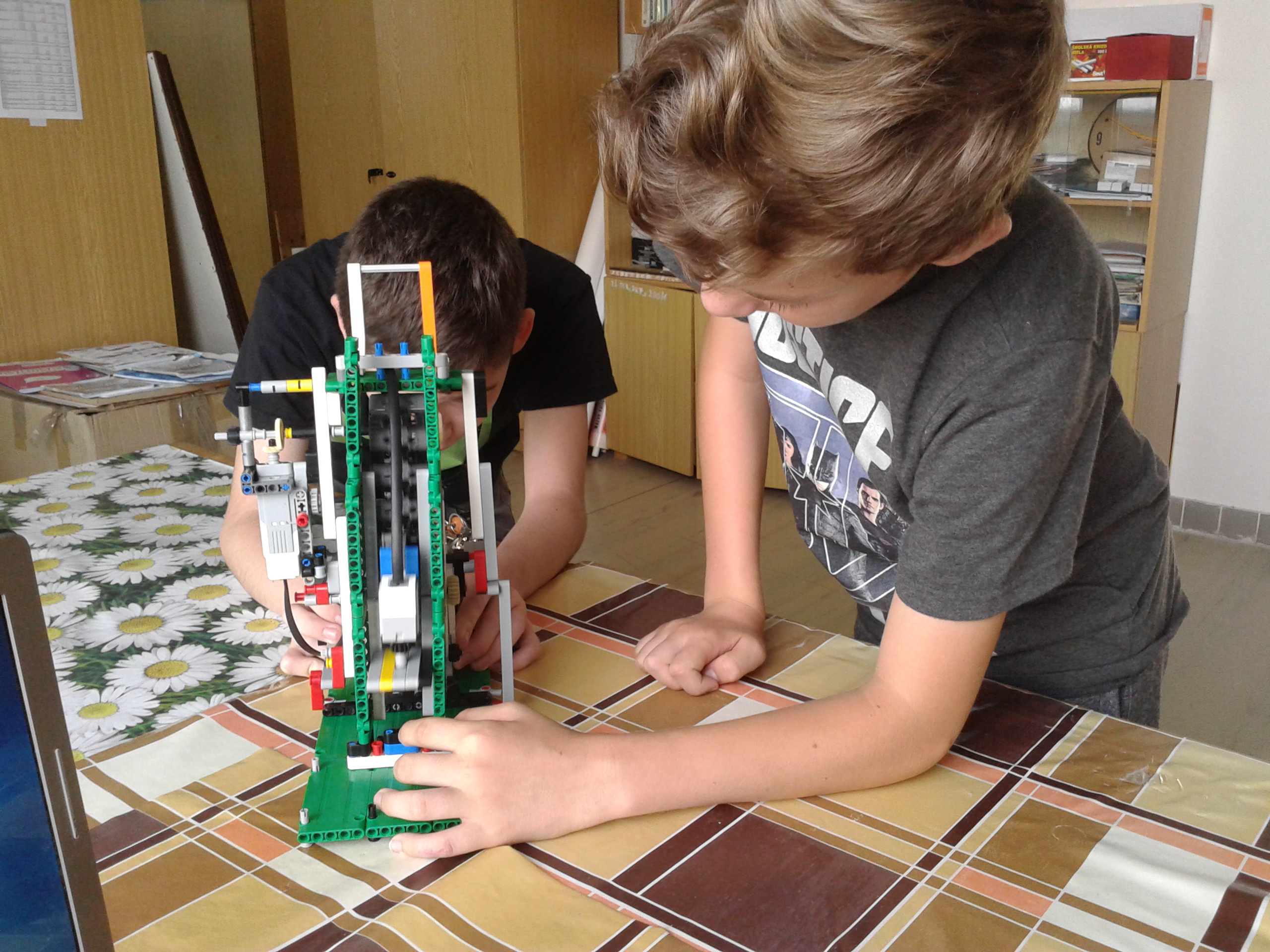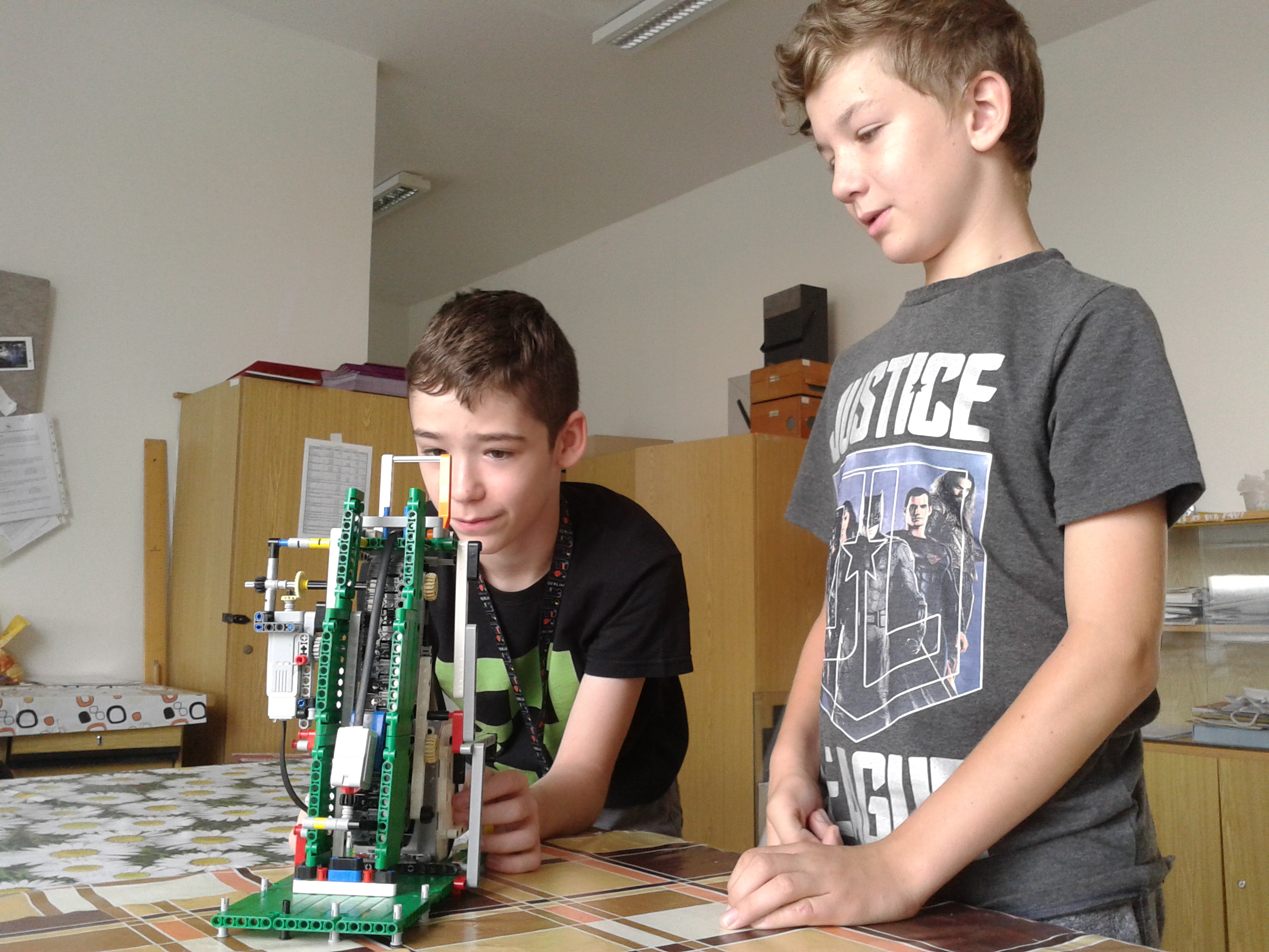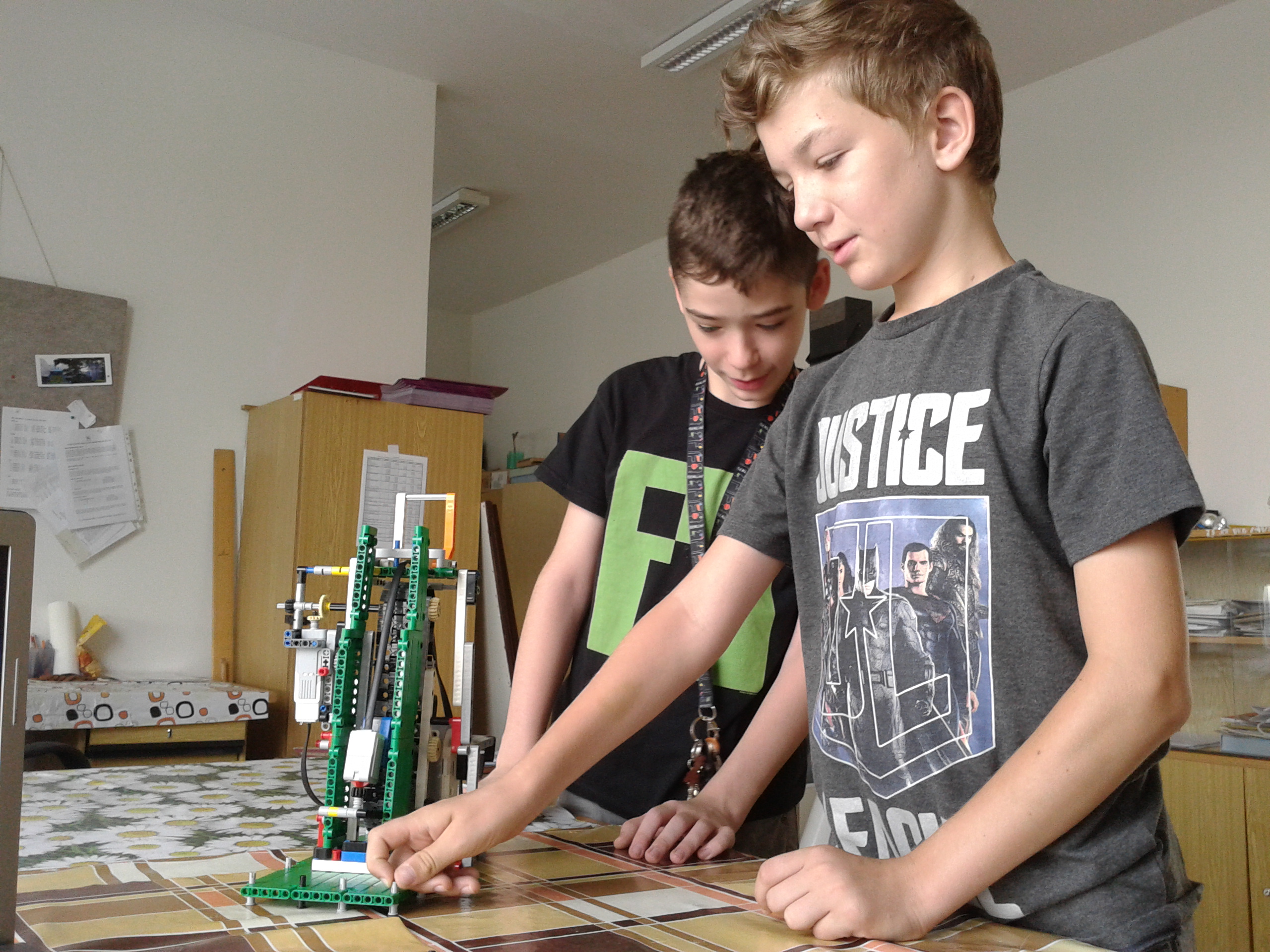 zostrojili sme robota, ktorý dokáže za pomoci malého motora a spomaľovacích prevodov spustiť nadol dotykový senzor. Dotykový senzor je upevnený na páse, ktorý je poháňaný malým motorom. Dotykový senzor zaznamená dotyk s vloženou súčiastkou a zastaví sa motor. Program je pre univerzálnu dĺžku osiek. Na videu je vidieť 3 rôzne dĺžky osiek. Pre krátkosť času sme žiaľ nedokončili program. Program je stavaný tak, že sa motor zastaví vtedy, keď dotykový senzor zaznamená kontakt s oskou. Druhá vetva programu, ktorá má zaznamenať, koľko o koľko stupňov sa za ten čas otočí malý motor a má vypísať na displej hodnotu, nám nevyšla. Rozhodli sme sa však nevzdať, odovzdať dnes iba čiastkové riešenie a neskôr tento problém ešte neskôr rozlúsknuť.