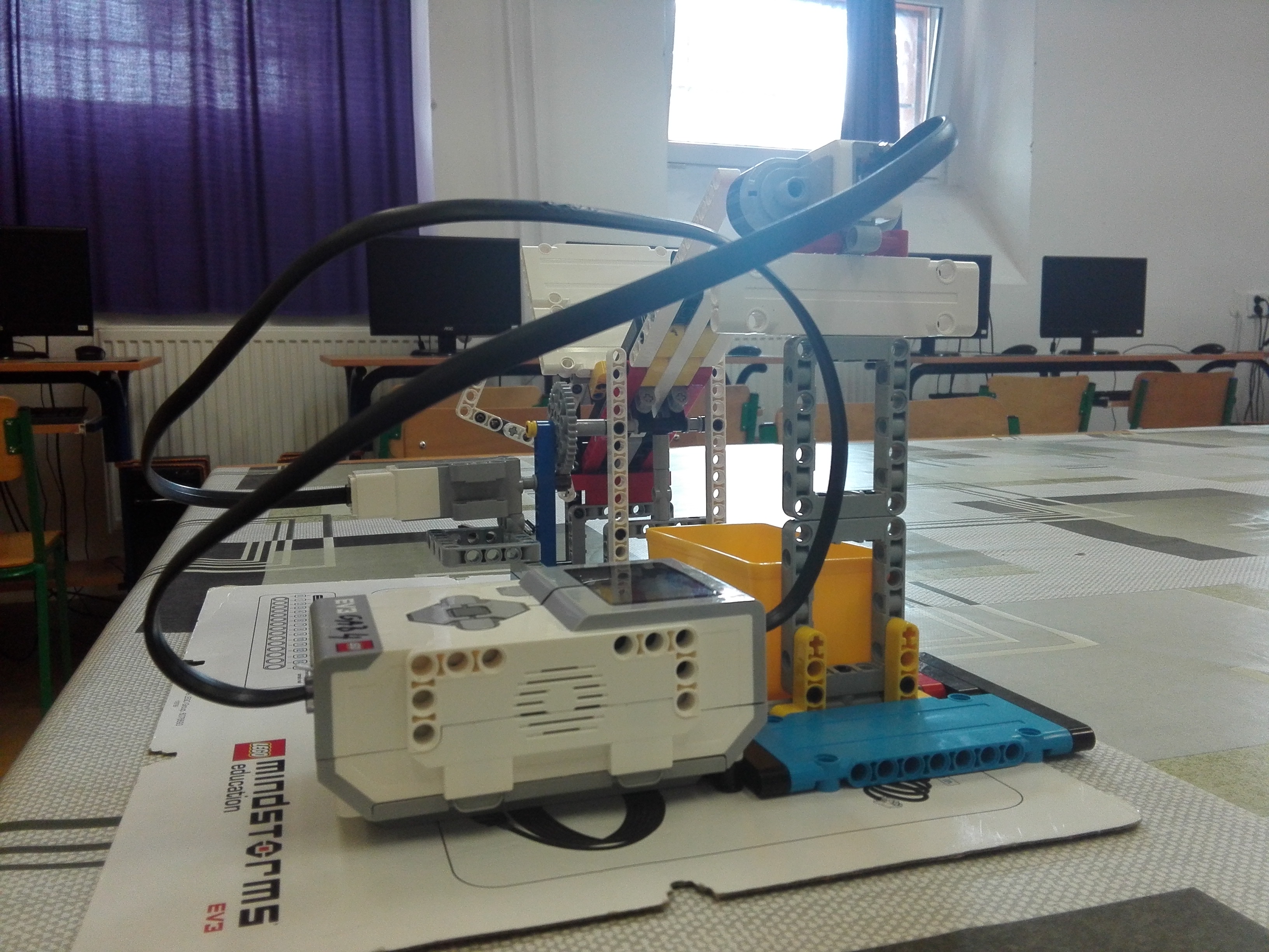 Konštrukcia robota Náš robot STICKMEASUR3R má 1 motor a 1 senzor. Malý motor slúži na sprevodované otáčanie platne do ktorej sa vkladajú osky. Ultrazvukový senzor slúži na meranie vzdialenosti steny, podľa ktorej sa určuje dĺžka osky. Robot má aj 2 manuálne časti - otvor na osky a blokáda platne, aby sa neprevážila (vo videu sme ju nepoužili, lebo to už nebolo nutné, ale namontovaná tam stále je). Niektoré merania neboli presné, lebo sa nám stále nepodarilo dostatočne stabilizovať platňu na rovnovážny stav.