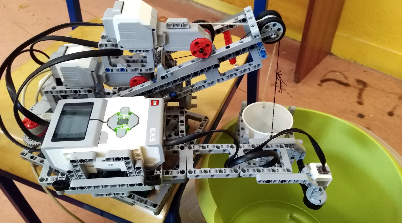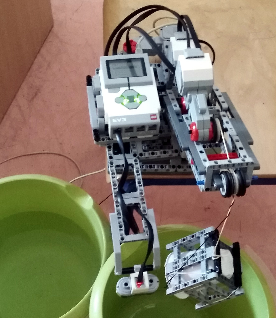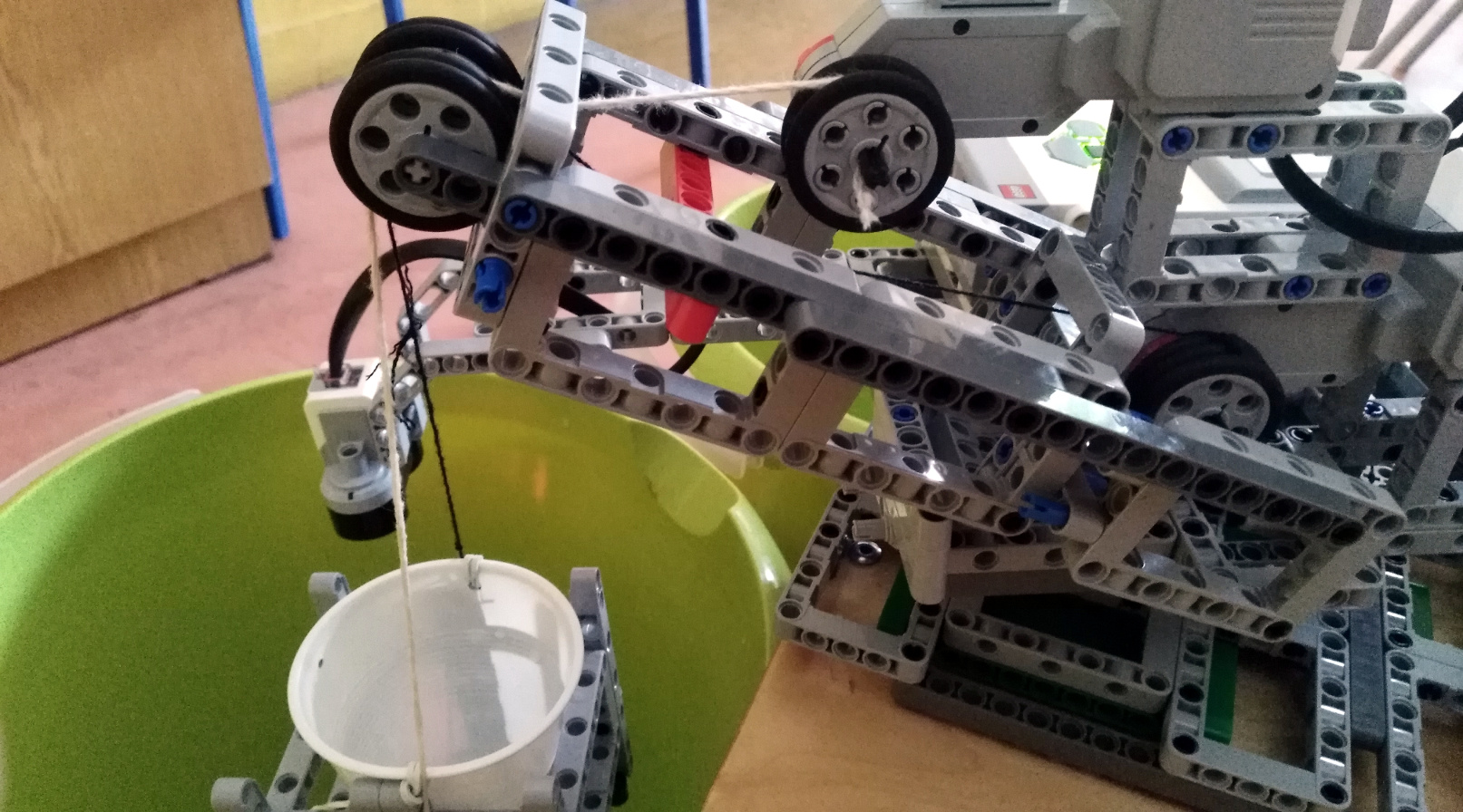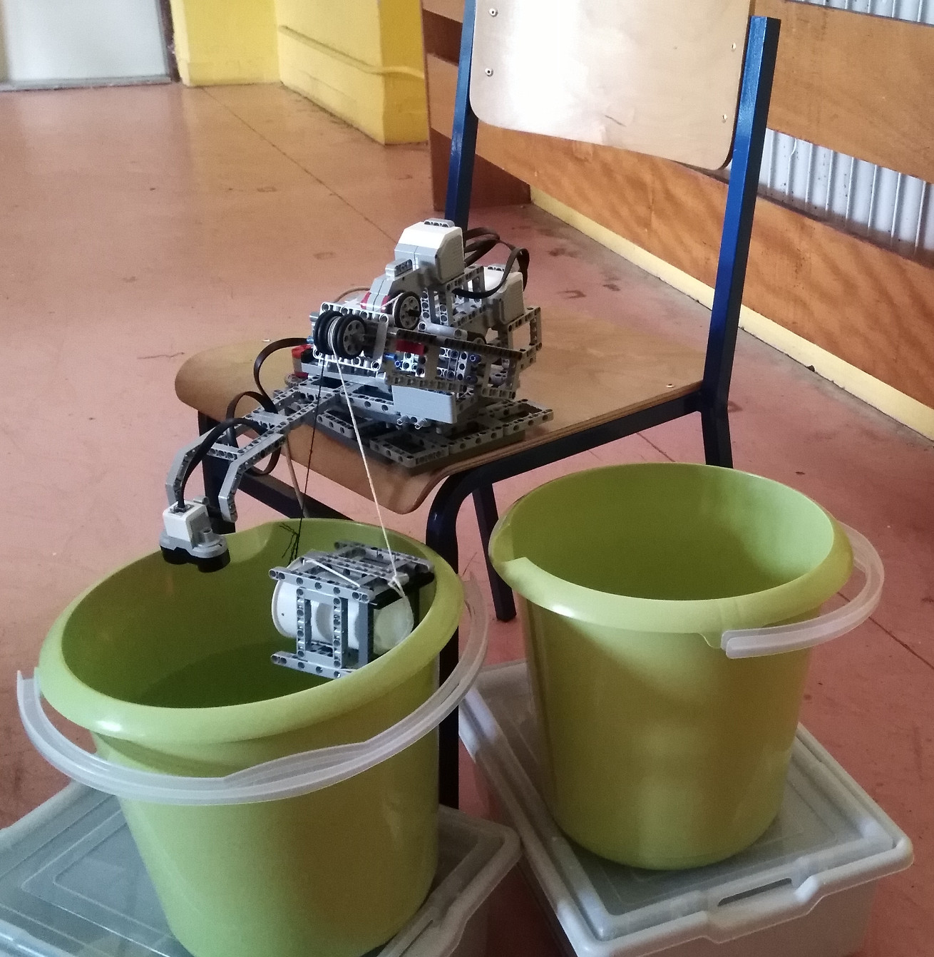 Zostrojili sme žeriav, ktorý je pomocou dual-lockov pripevnený na stoličku. Vedľa stoličky sú dve vedrá s vodou, v jednom je viac vody ako v druhom. Žeriav má dva nezávislé navijáky.