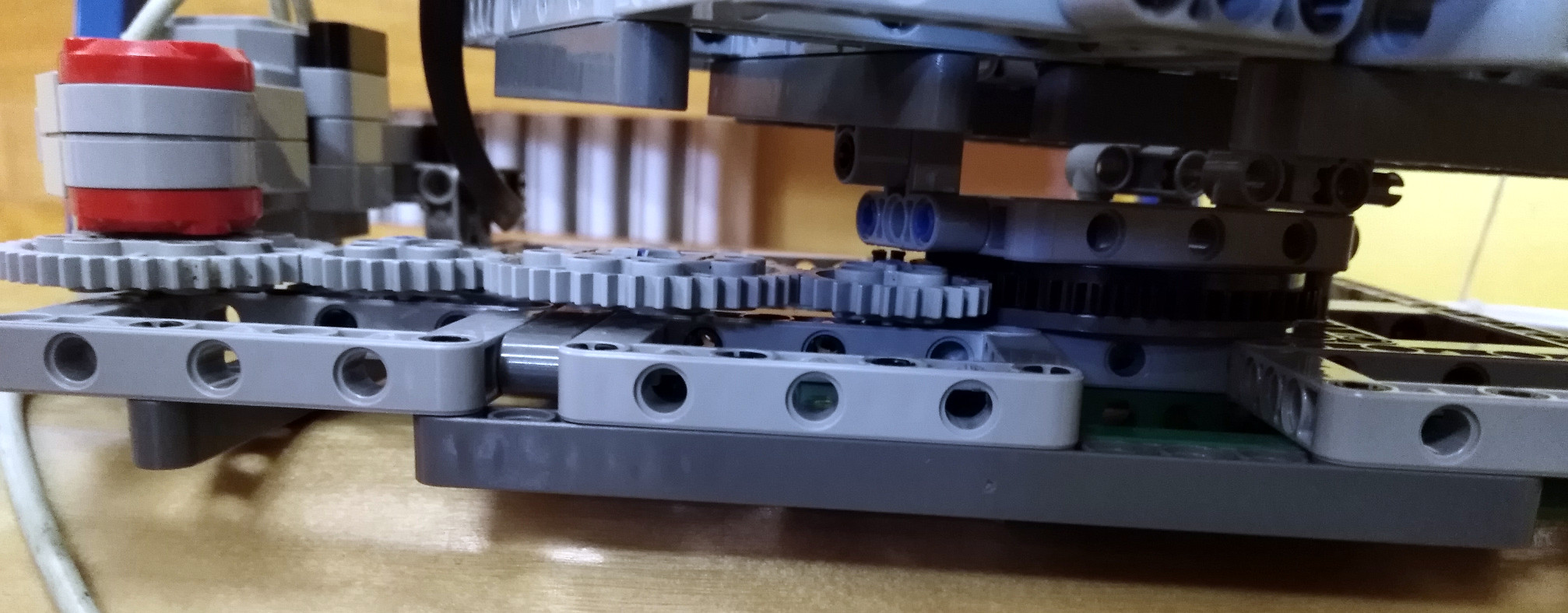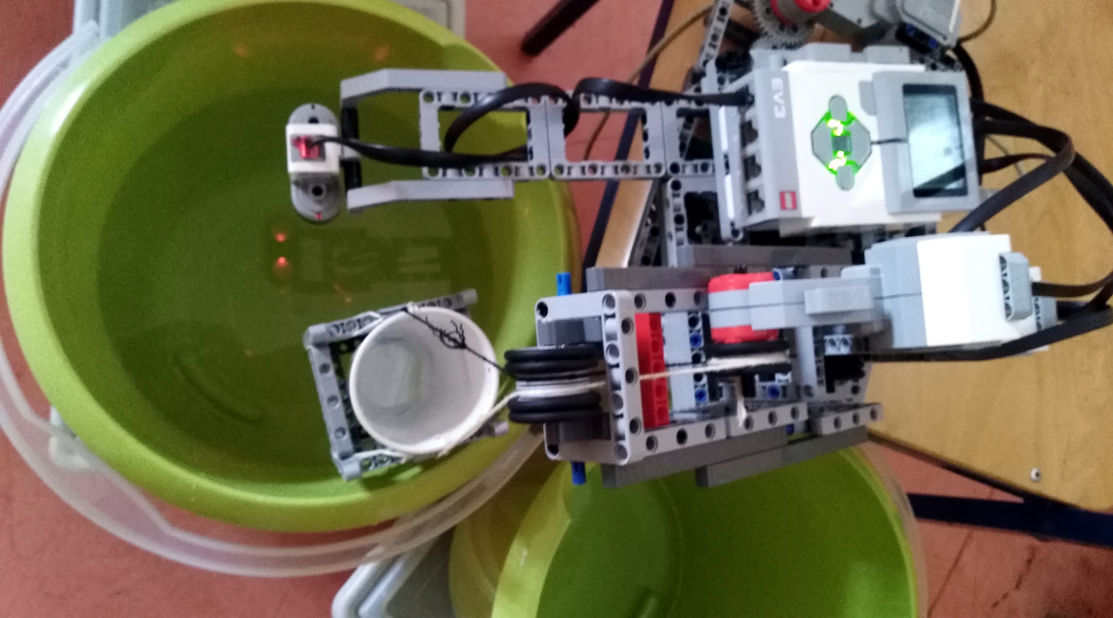 Pohárik je umiestnený v LEGOvom držiaku pomocou gumičiek. Držiak je pripevnený na vrchu na lano jedného navijáka a druhá strana dolu na druhom navijáku. Takto dokážu navijáky vyzdvihnúť pohárik rovnomerne, alebo ho nakloniť, aby sa dnu voda nabrala, alebo vyliala von.