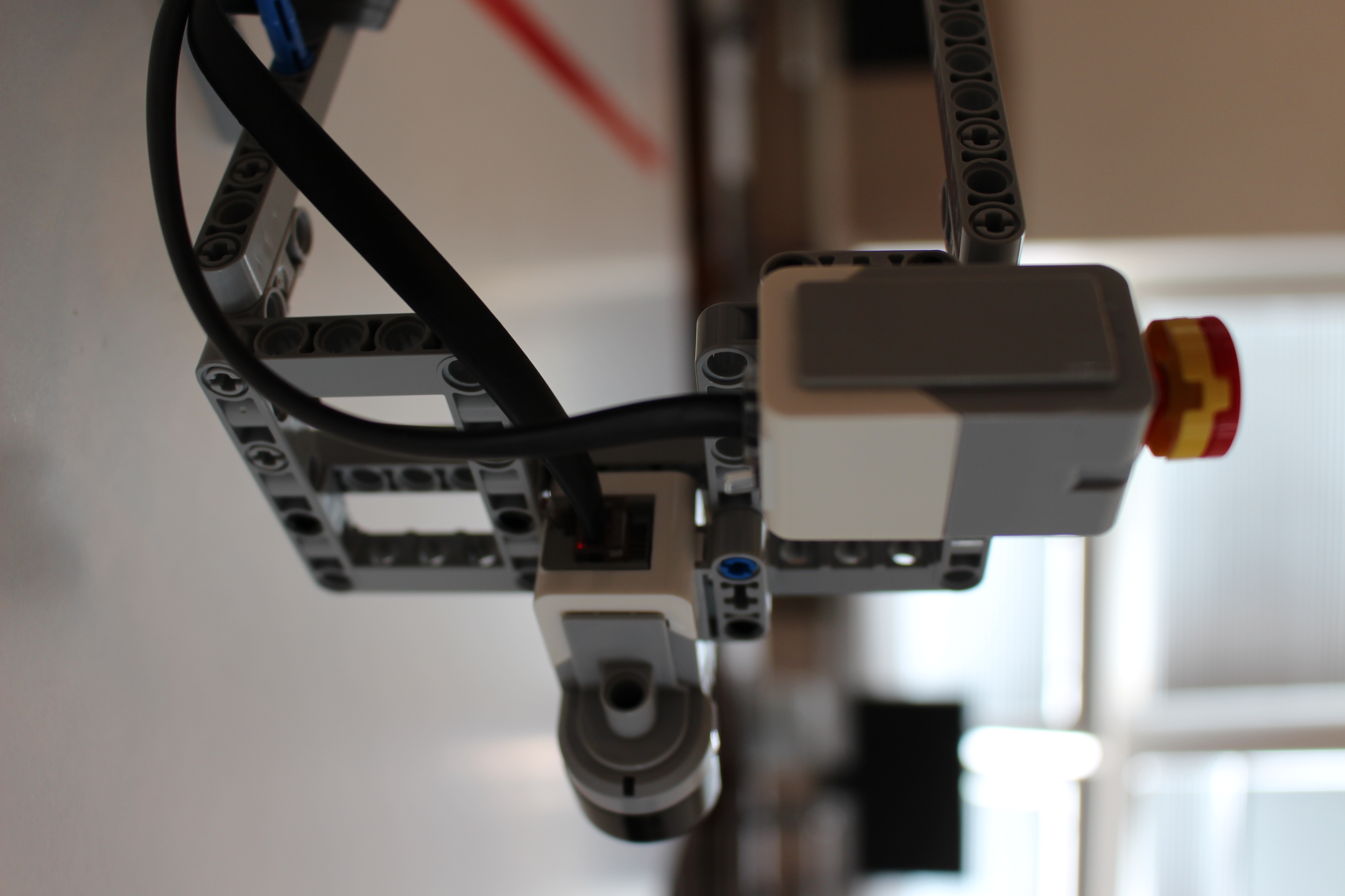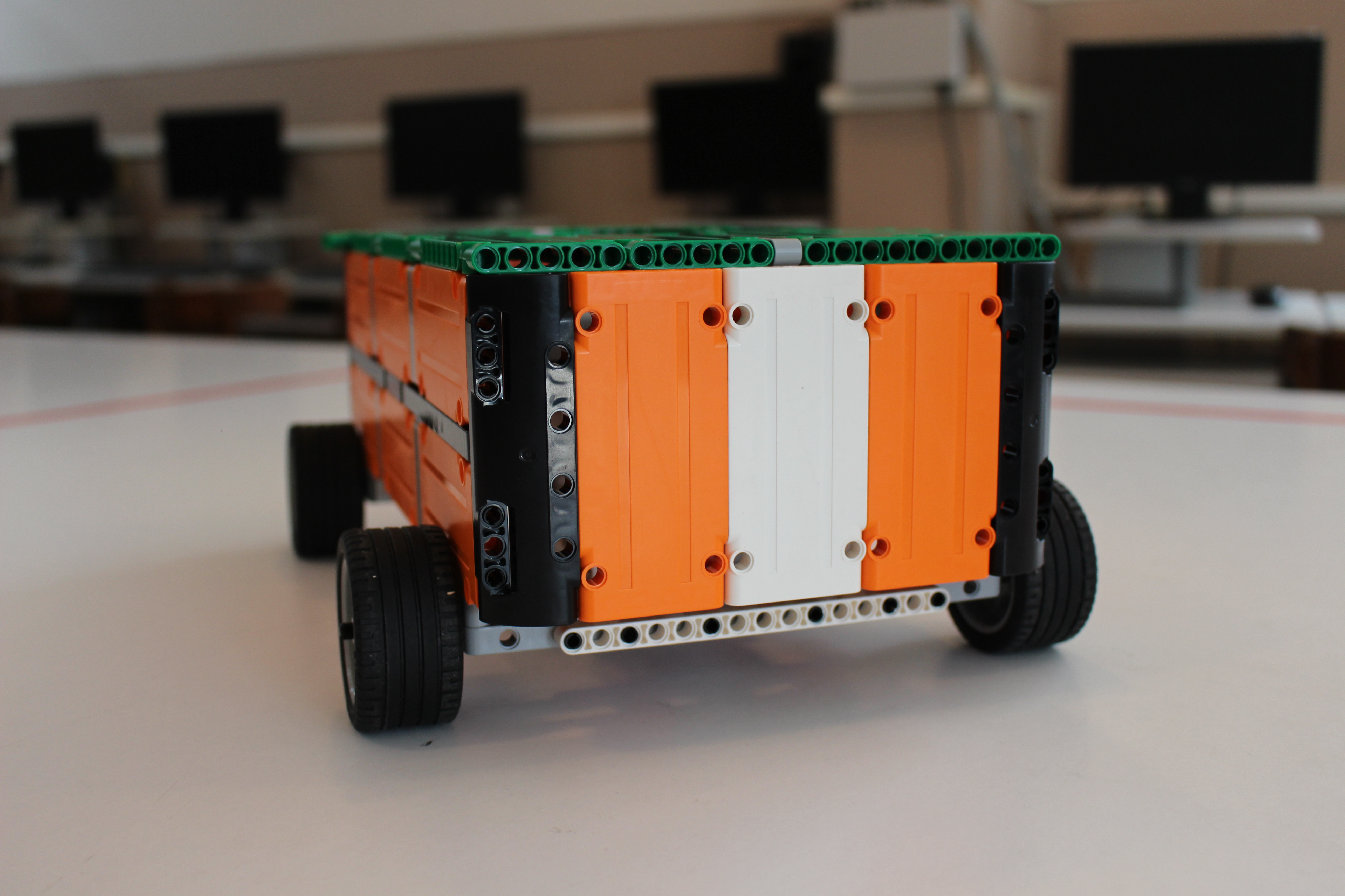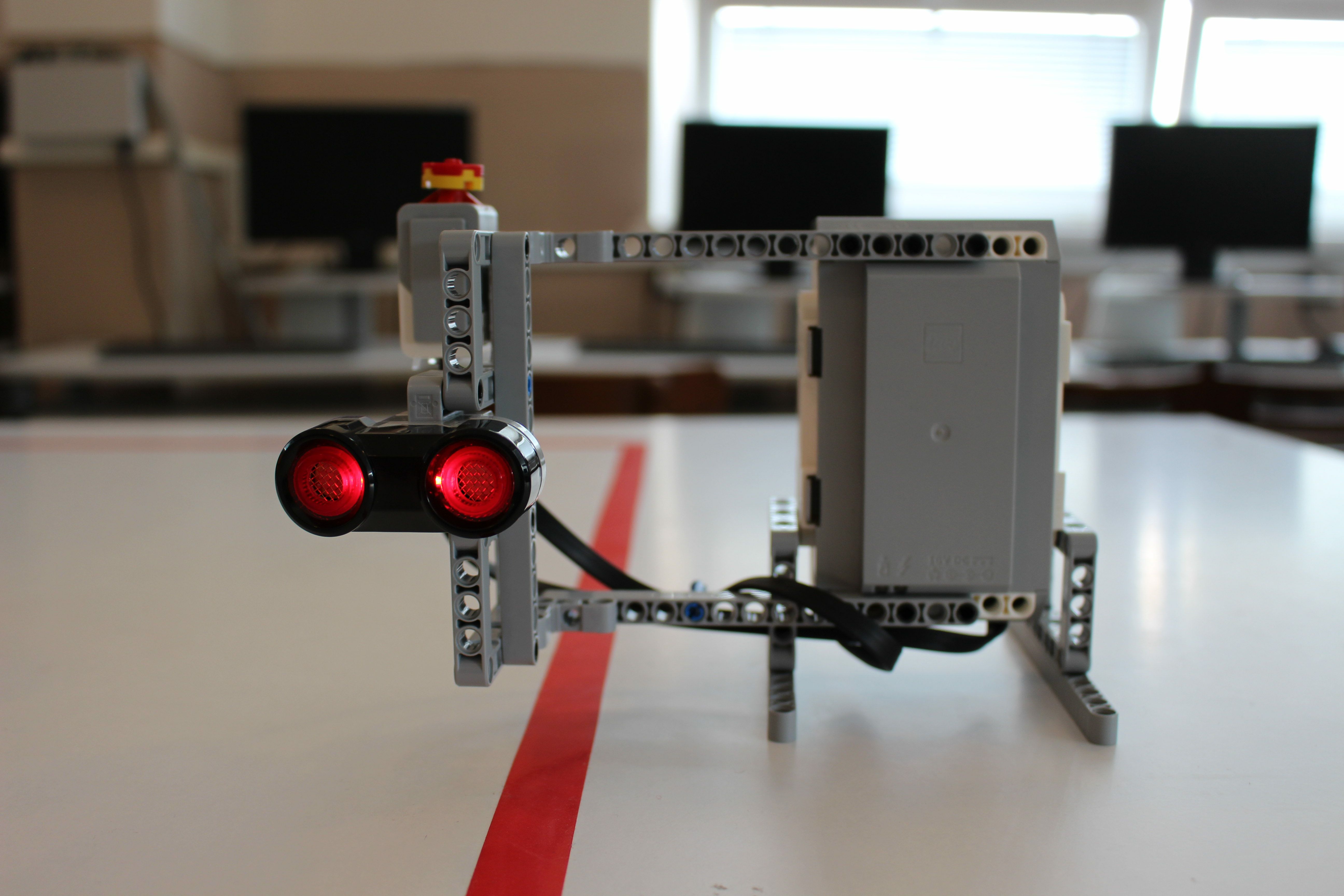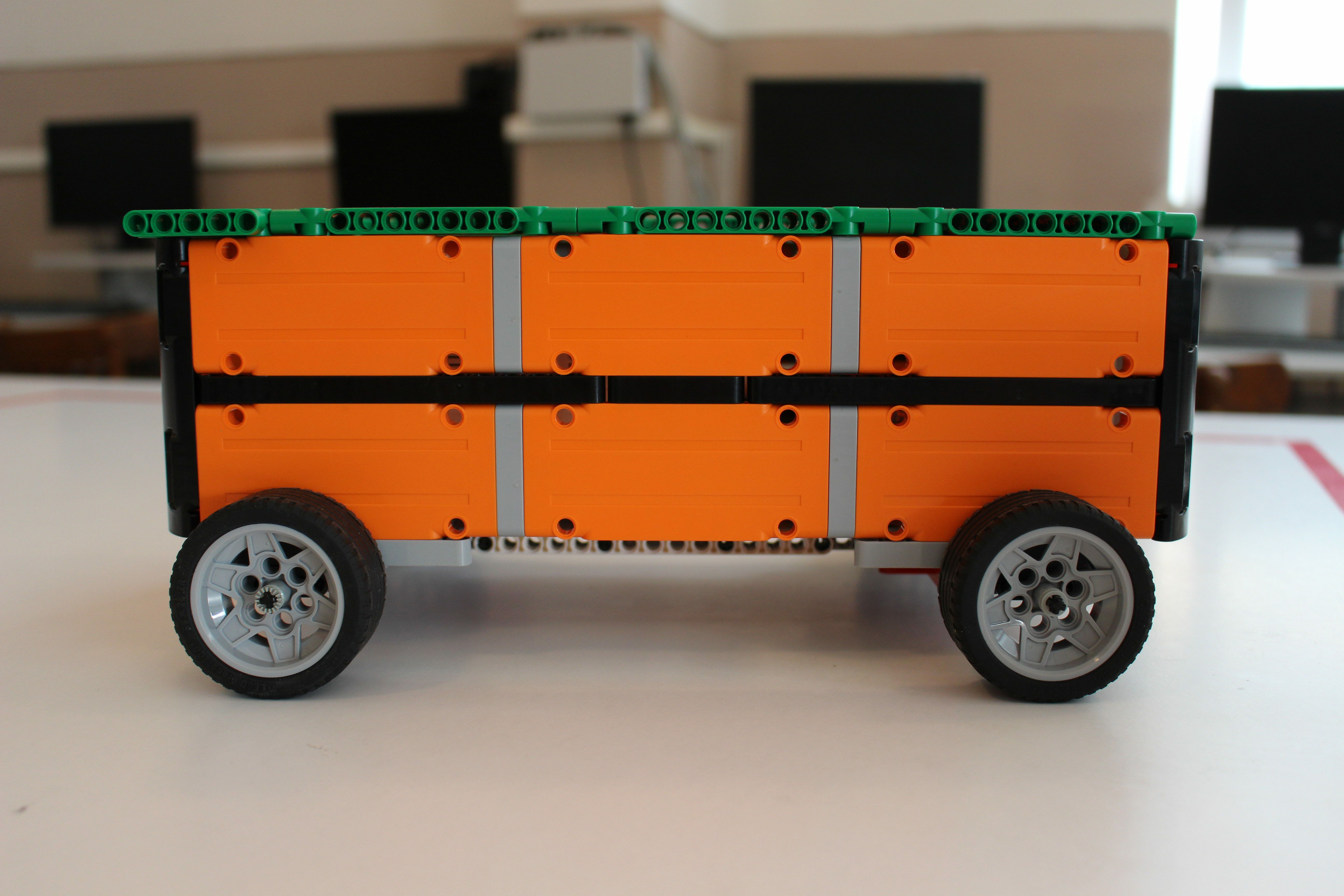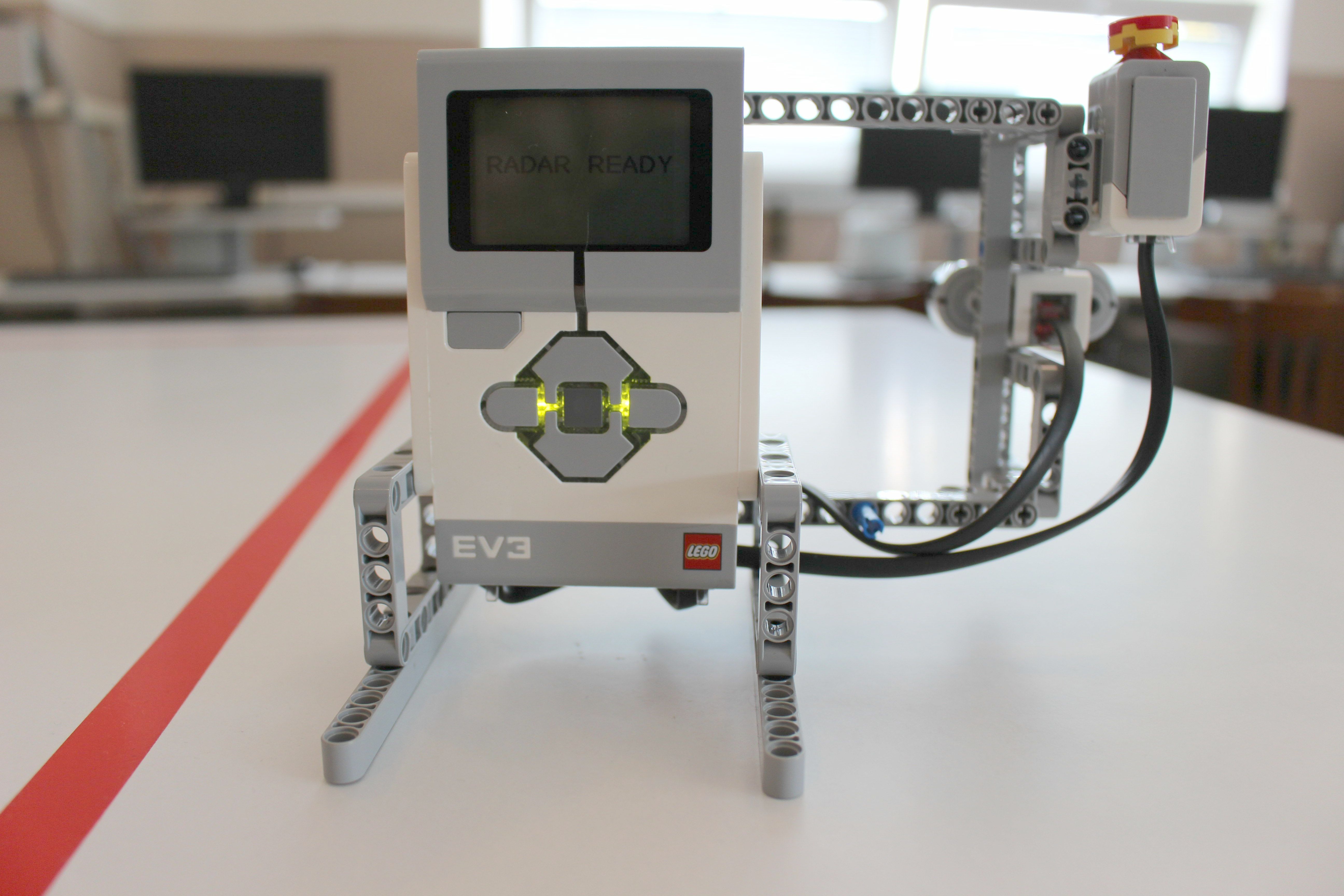 Použili sme 2 EV3 kocky - jeden kocka je v robotickom aute, druká kocka je vlastne radar - meria rýchlosť auta. Obidve stavby sú veľmi jednoduché - radar je len kocka s ultrazvukovým senzorom, auto je poháňané jedným veľkým motorom.