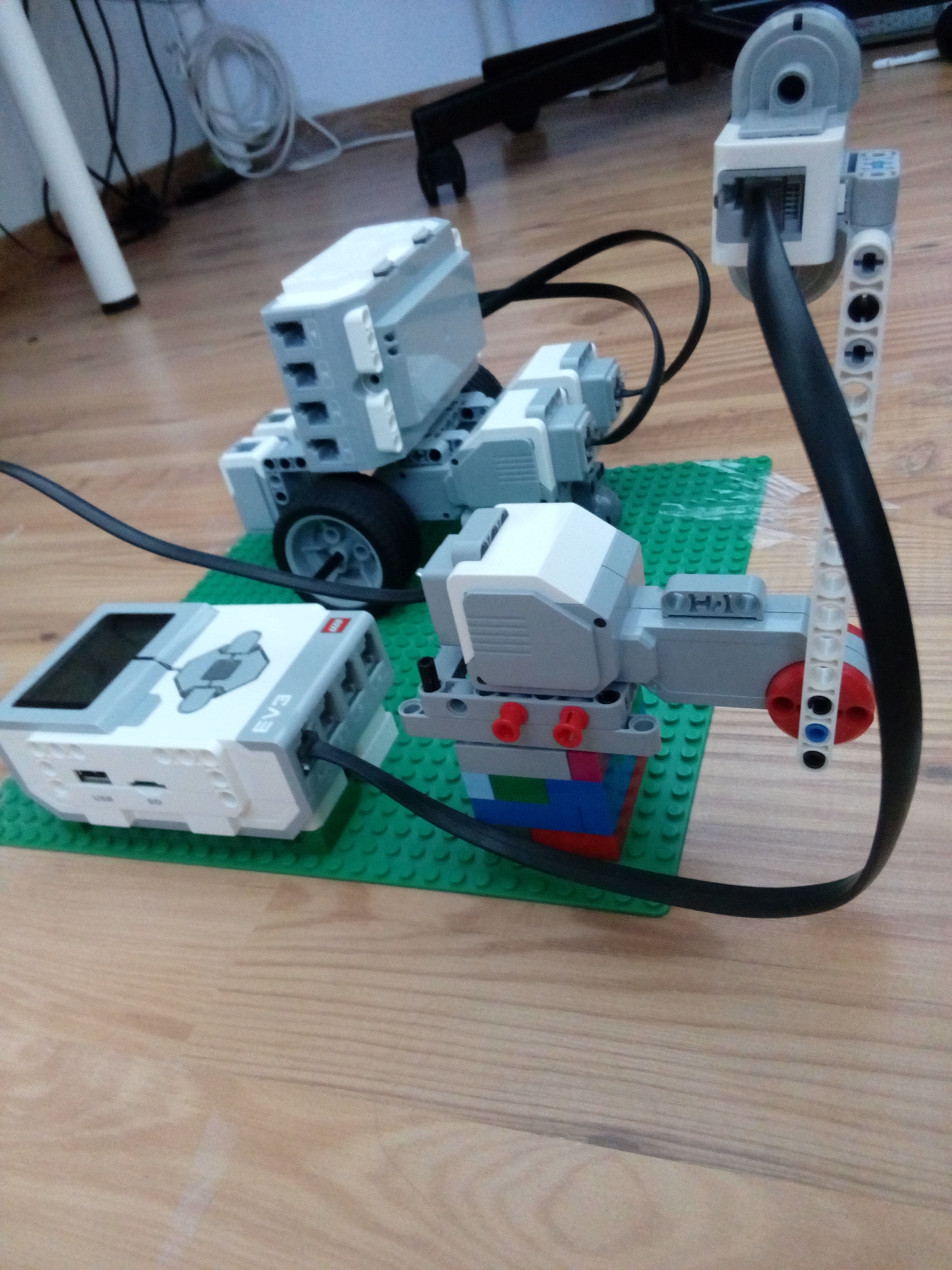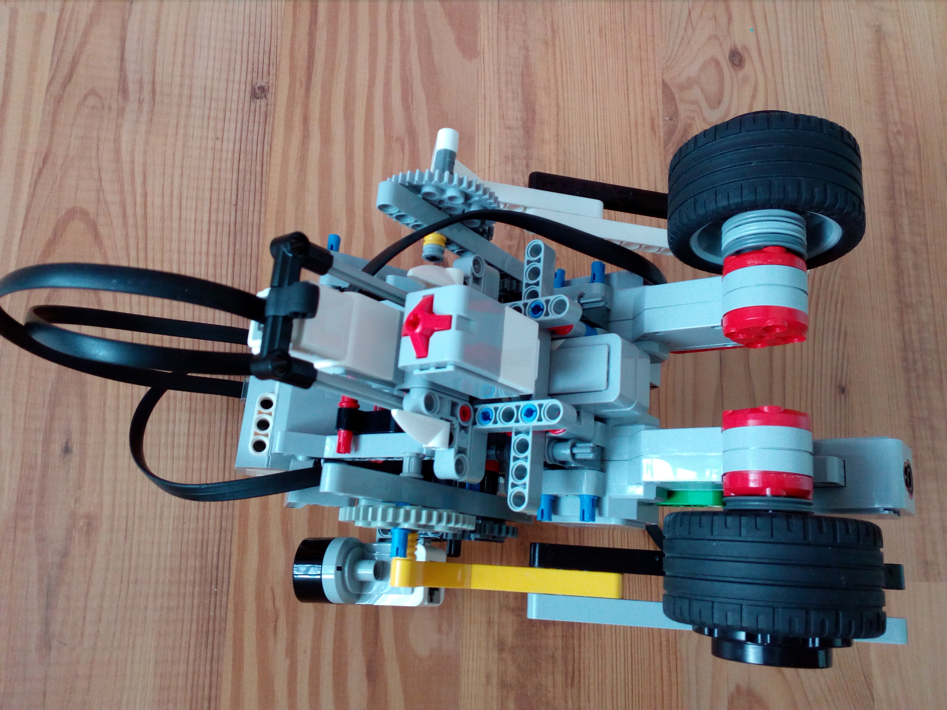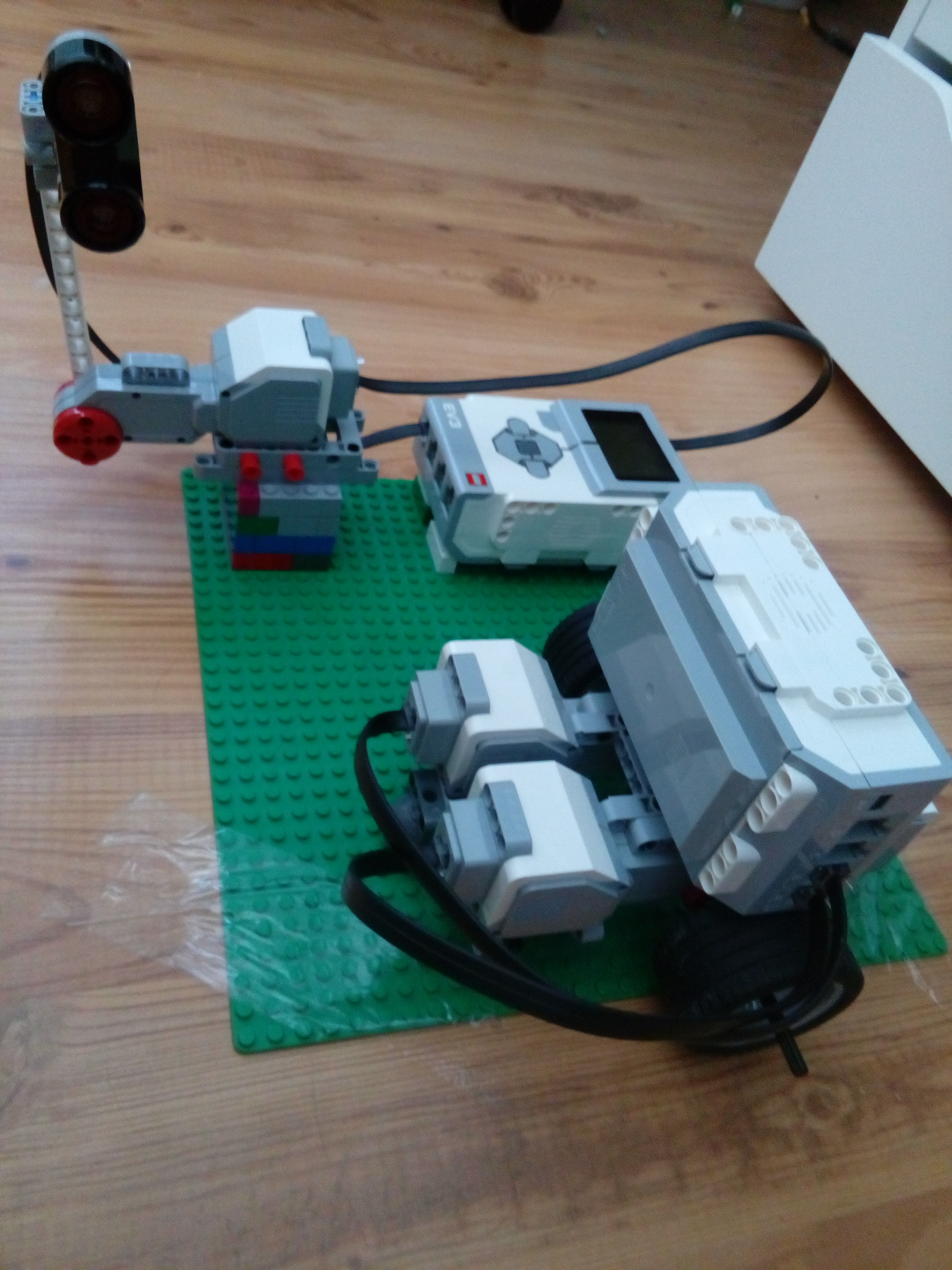 Nase auticko je velmi jednoduche, pozostava z dvoch large servo motorov + dvoch color senzorov, lebo sme rozmyslali, ci ho neurobime ako linefollowera kvoli vacsej presnosti, co ale nakoniec nebolo potrebne. Auticko ma jednoduchy program, kde si sofer tlacitkami nastavi rychlost a po stlaceni stredneho tlacitka auticko prejde 3 otacky touto rychlostou. Ked stlacime prave tlacitko, tak auticko ide povodnou rychlostou, pokial vsak dostane upozornenie, ze ma spomalit, tak si znizi rychlost.