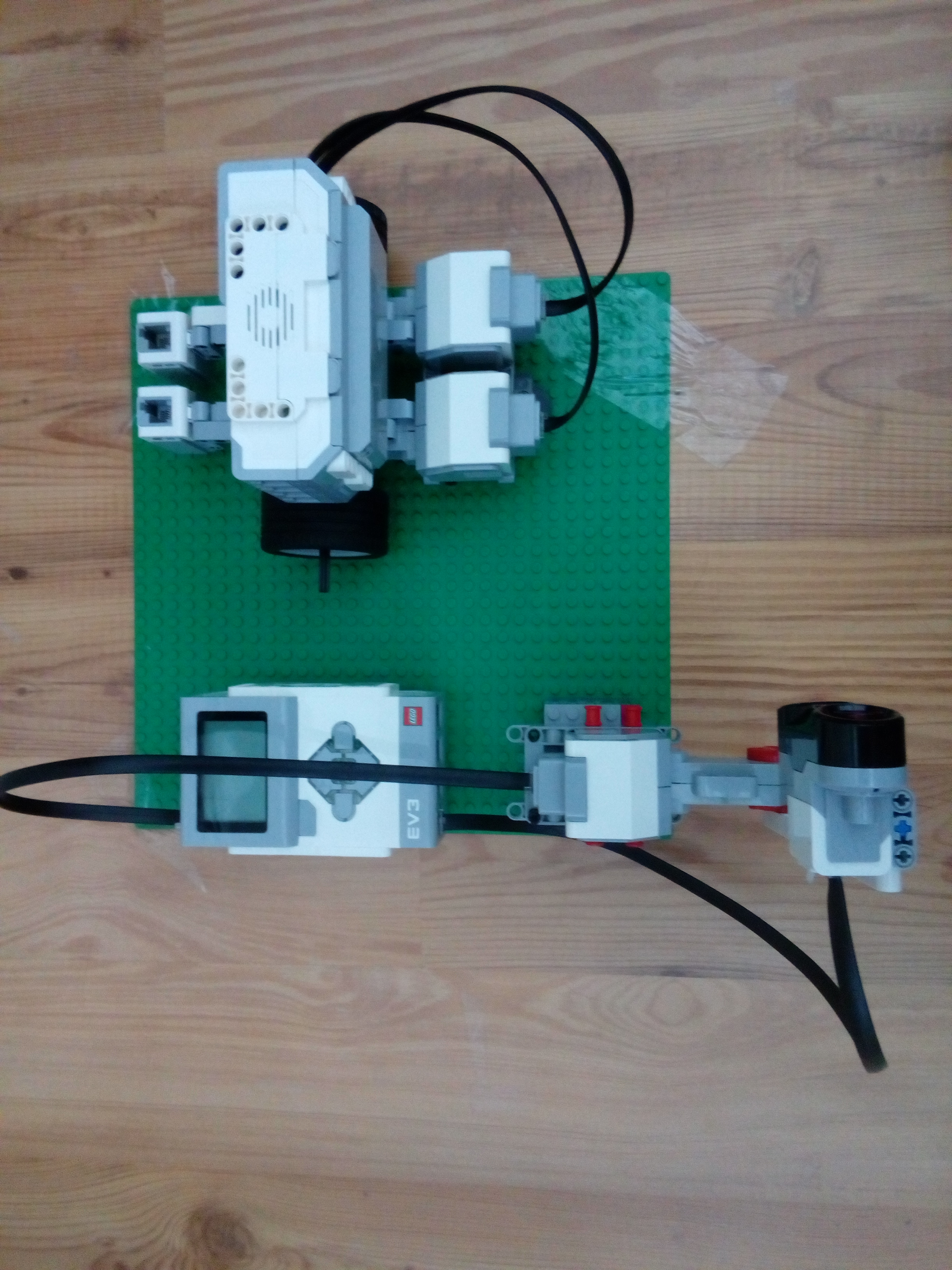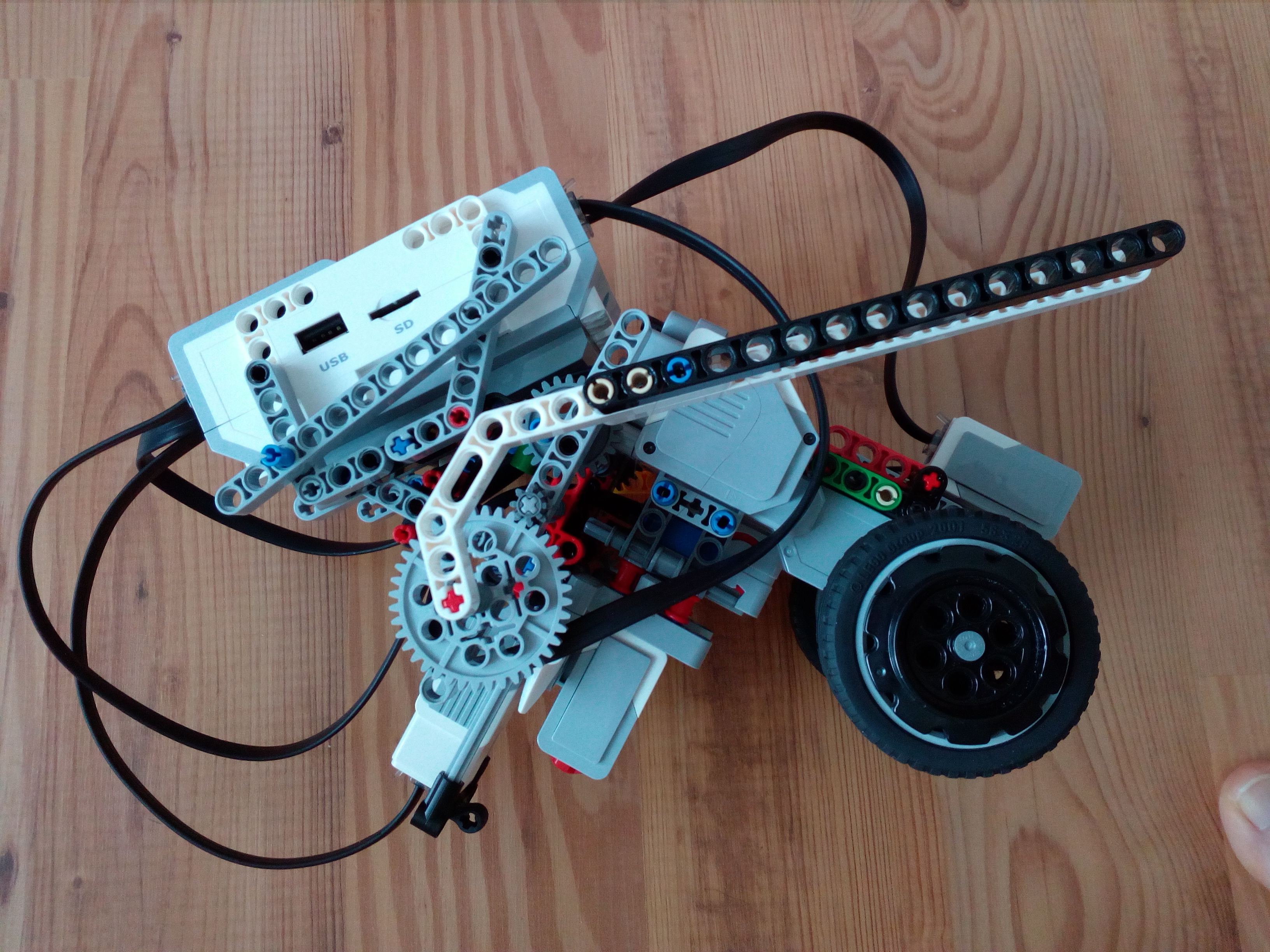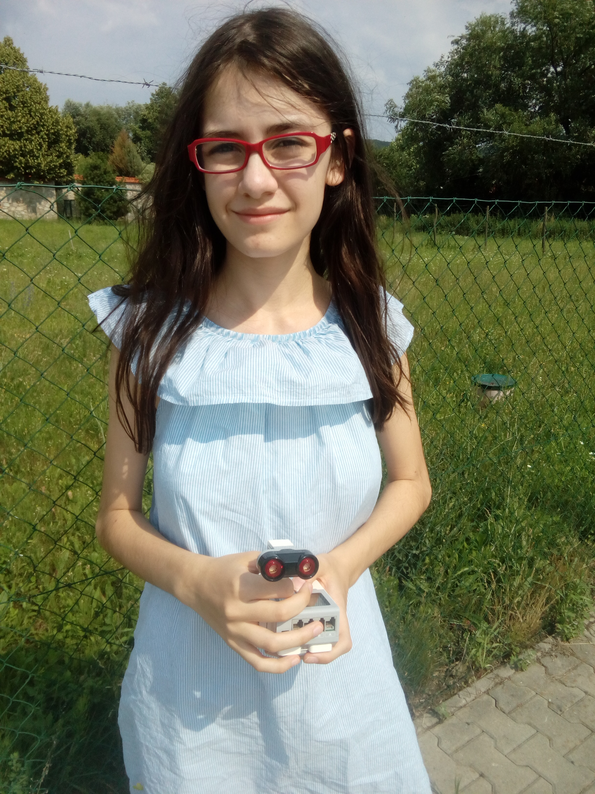Nase auticko je velmi jednoduche, pozostava z dvoch large servo motorov + dvoch color senzorov, lebo sme rozmyslali, ci ho neurobime ako linefollowera kvoli vacsej presnosti, co ale nakoniec nebolo potrebne. Auticko ma jednoduchy program, kde si sofer tlacitkami nastavi rychlost a po stlaceni stredneho tlacitka auticko prejde 3 otacky touto rychlostou. Ked stlacime prave tlacitko, tak auticko ide povodnou rychlostou, pokial vsak dostane upozornenie, ze ma spomalit, tak si znizi rychlost.