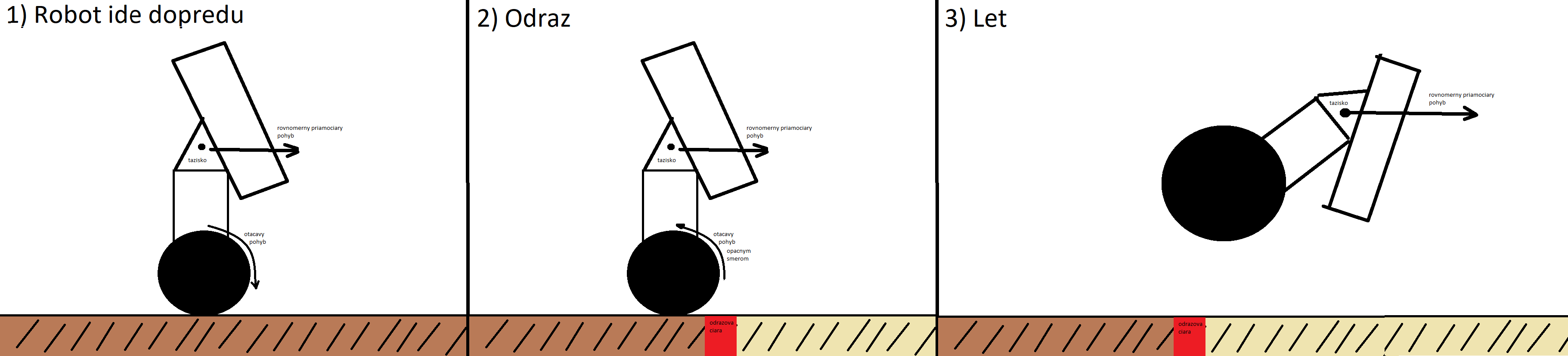 Robot sa rozbehne po rovnej rozbehovej drahe (knihe), ked dojde na koniec knihy, tak "vyleti" a urobi skok do dialky.