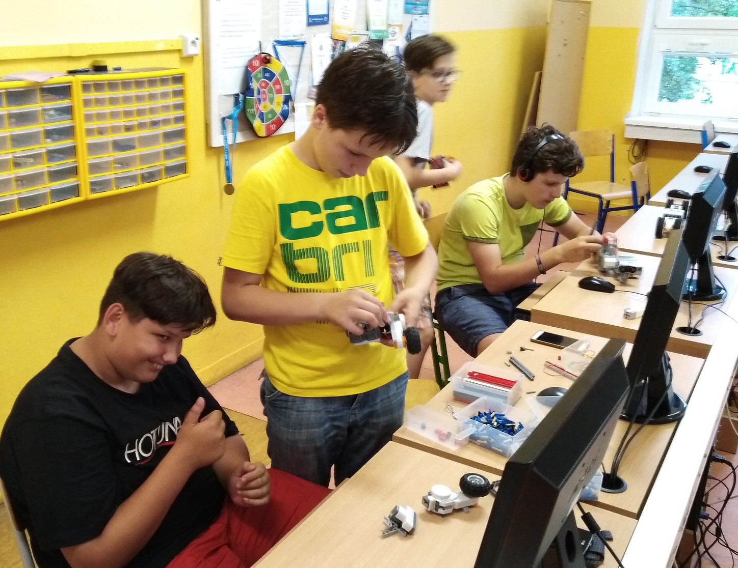 Všetci: Hoci už panuje predprázdninová výletná doba, niektorí boli v čase riešenia tohto kola dokonca v Kanade na majstrovstvách RoboCupu a aj u ostatných bolo vidieť, že aj keď riešili, často to bolo poznačené únavou z konca školského roka, ách. Ale prázdniny sú za dverami a potom začne sezóna FLL, ak ste sa náhodou ešte neprihlásili, teraz je na to najlepší čas. Úlohu o skákaní sa nikomu nepodarilo pekne vyriešiť a iba v jednom prípade došlo k odlepeniu sa od podložky (bez pomôcky v podobe schodu). A pritom stačilo použiť jeden sáčok gumičiek, skrčiť veľké žabacie nohy a uvoľniť ich klapkou motora... to ma teda sklamalo, že sa to nikomu nepodarilo. Naši robotici boli na dobrej ceste, jednu nohu aj spravili, ale potom išiel jeden do Nemecka, druhý kamsi na exkurziu a tretí nasadil koncoročnú apatiu. Nuž, veď snáď sa k tomu niekto eŠte cez prázdniny dostane - ak hej, pošlite nám video! Počul som, že niektorý tím to chcel riešiť odrazovou rampou, ale robot z rampy len padol ako hnilá hruška. :-) Tak sa aspoň inšpirujme touto veselou súťažou: Robot Long Jump. Koncoročné horúčavy sme predpokladali a tak sme druhú úlohu pre istotu zadali takú, čo by sme aj my zvládli spraviť :-), aby ste sa veľmi nenatrápili. A veru, tu sa to skoro všetkým podrilo pekne spracovať - niektorí pomocou dvoch alebo viacerých senzorov v kolmom smere a niektorí jedným senzorom, ktorý robil viacero meraní - to sa mi zdá byť predsa len úspornejšie, aj keď možno o niečo menej presné a trochu to naráža na problem nasmerovania - ak pravda nemá vozdilo do radaru nabúrať. NuŽ ale to už mi je len bezpečnosť - umiestniť radar do stredu vozovky :-). Ďakujeme vám za skvelý ročník plný výborných riešení (spolu ich bolo až 151) a dúfame, že sa pridáte i na budúci rok. Pripravujeme novinky, ale zatiaľ si ich necháme ako prekvapenie. :-) Veselé prázdniny!!! Šachisti: Na vašom aute nevidím šoféra, zdá sa, že je autonómne. Autonómnemu autu by sme mohli ušetriť prácu - namiesto toho, aby sa muselo dívať na vlajočky by mohlo dostať informáciu priamo v elektronickej forme cez nejaké bezdrôtové spojenie... 1. Za úlohu Bezpečnosť na cestách získavate 3b. Na videu je vidieť, že ste zakomponovali aj pokutu pri nespomaleni. Páči sa mi, že ste vyskúšali rôzne alternatívy jazdy. 2. Pekné riešenie, robí všetko čo treba. Páči sa mi signalizácia vlajočkami. 3. Pekne spracované riešenie úlohy s jednoznačne viditeľným zobrazením pokuty (i keď to nebol zvukový signál pokuta).