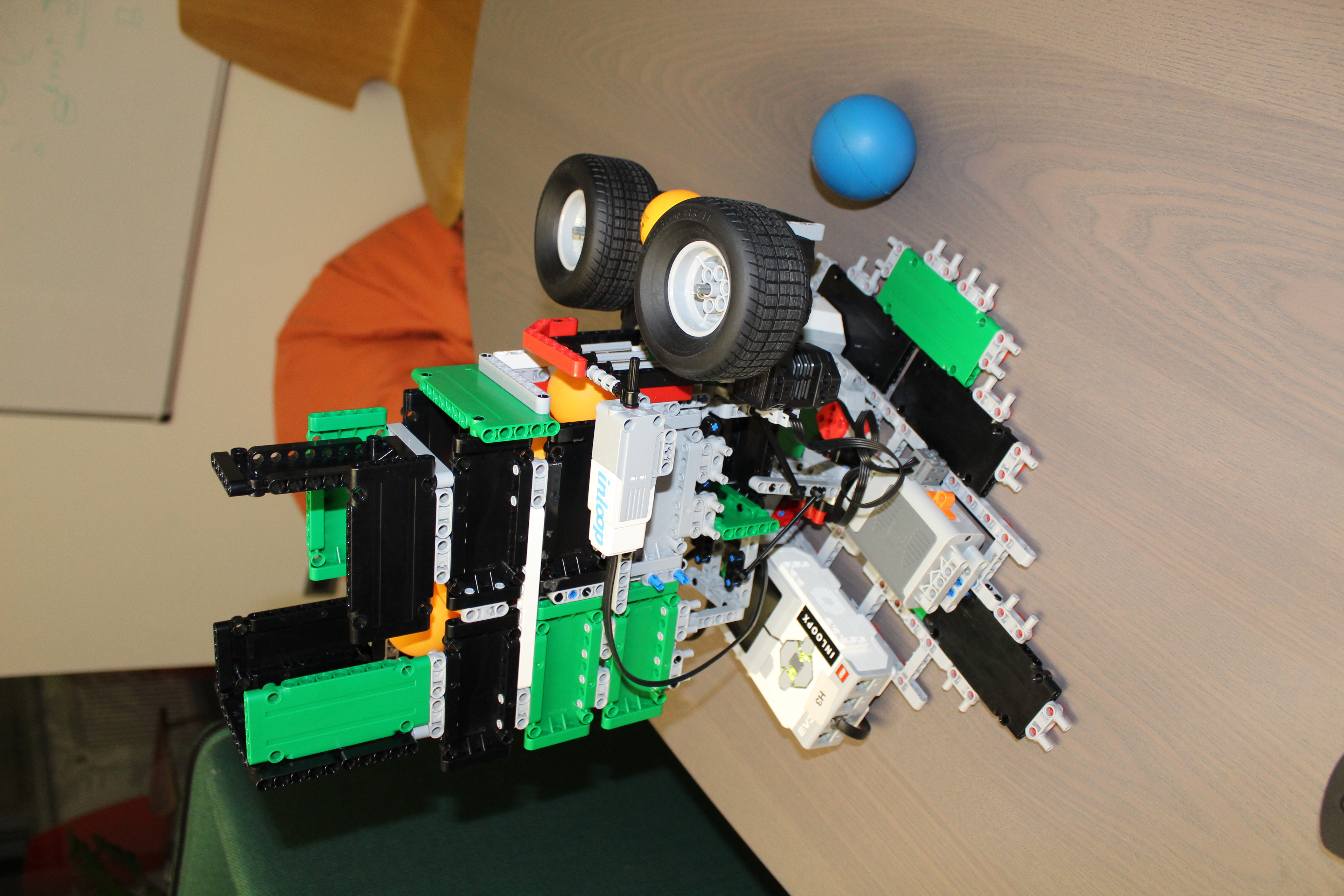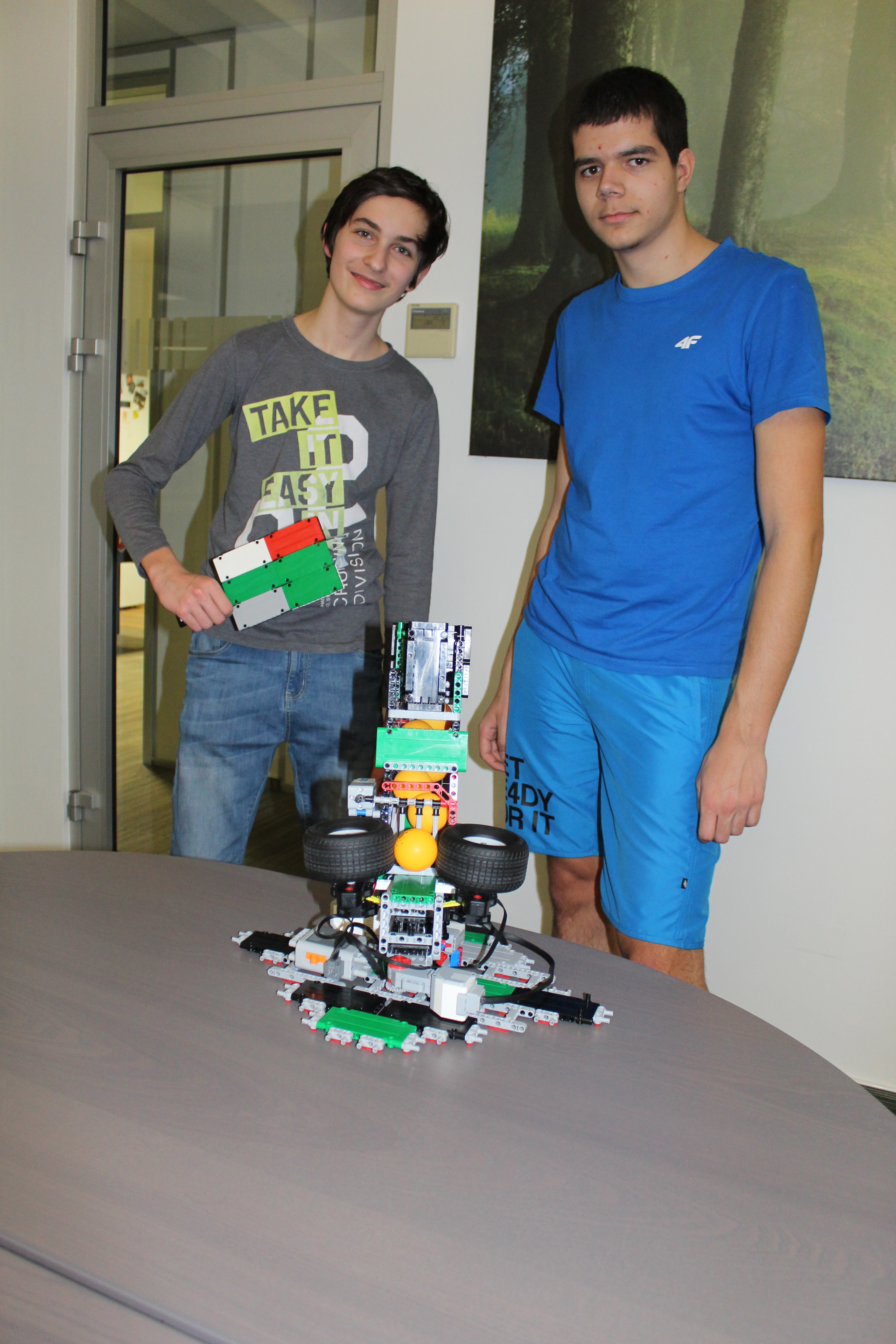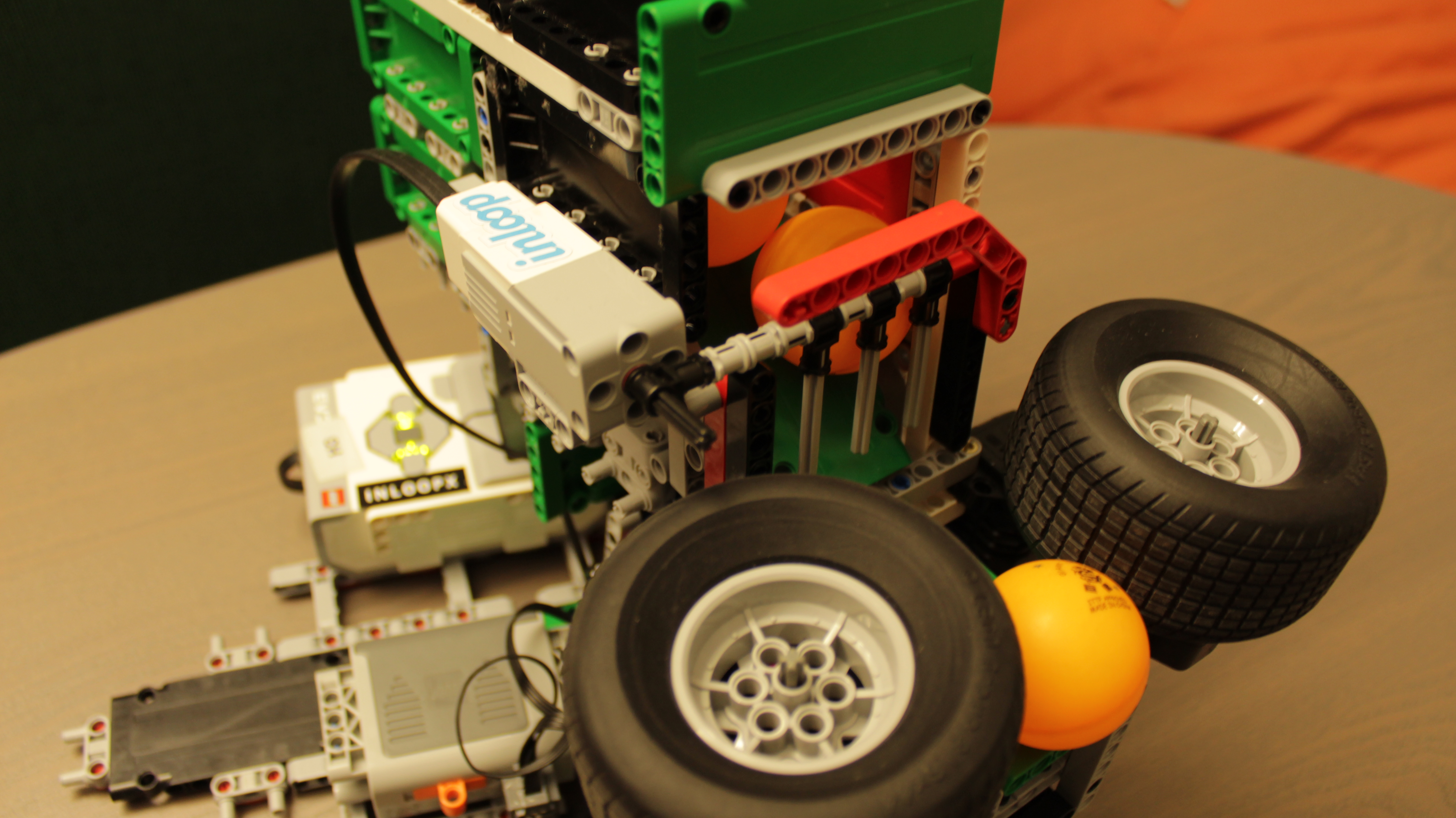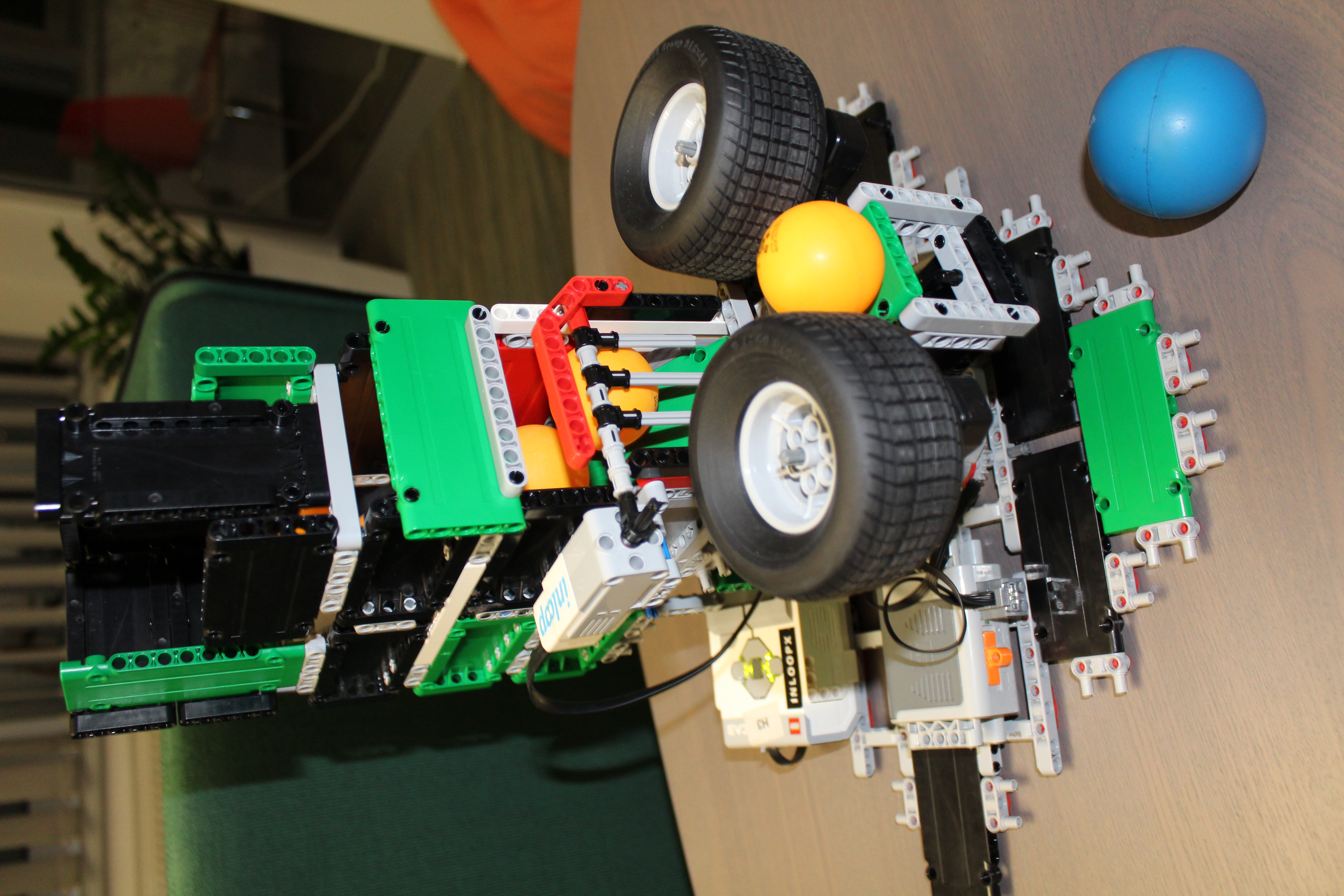 V prvom kole sme skúsili vyrobiť tréningového robota na stolný tenis a aj sme si s ním celkom zatrénovali. :) Robot funguje na pingpongové loptičky aj na tie väčšie zo stavebnice Lego Mindstorms.