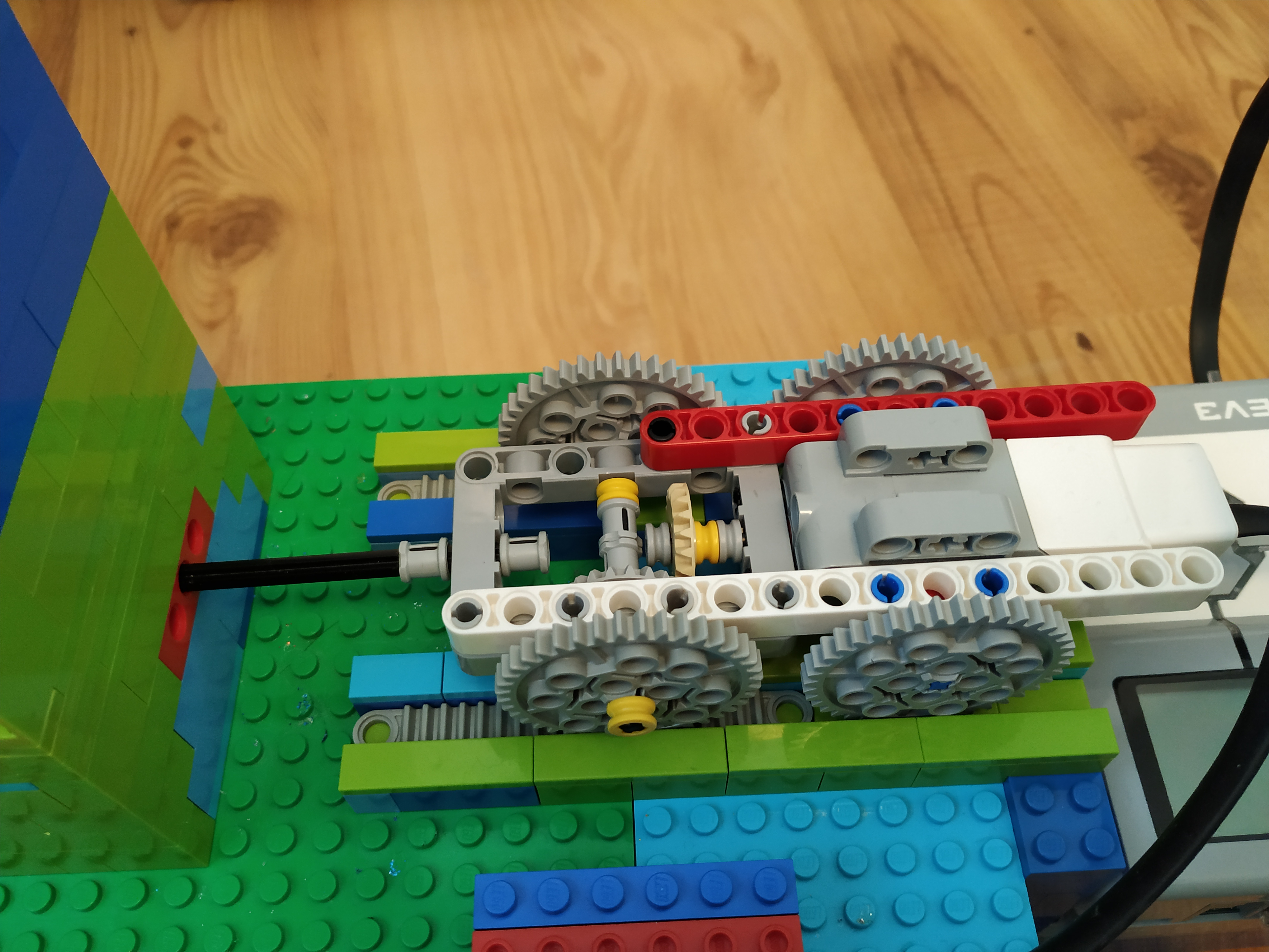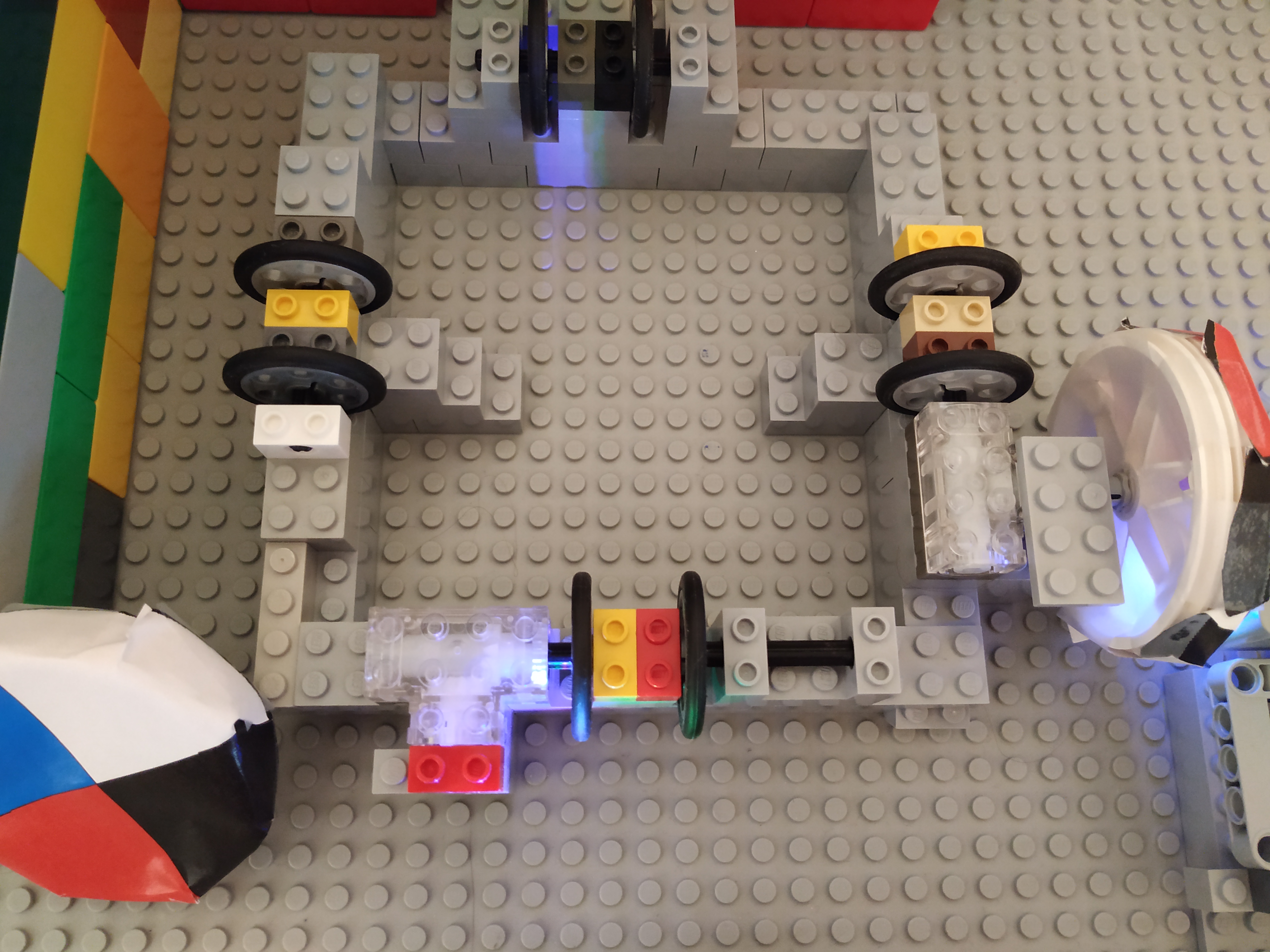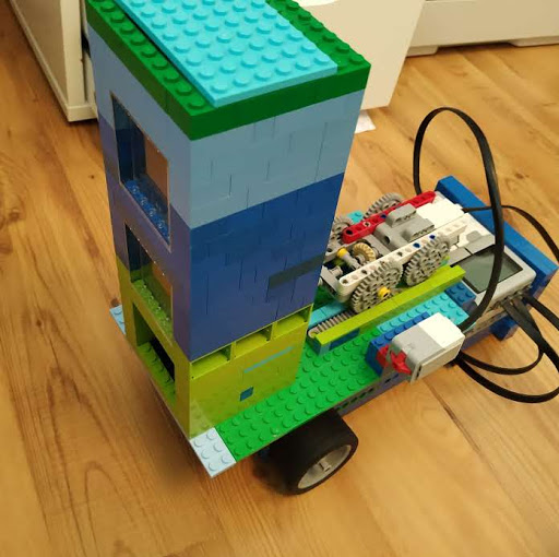 Pekné riešenie, aj farebne zladené :-). Trochu mi to pripomína štýl robotizácie, keď namiesto jedného pracovníka nasadia do výroby robot, ktorý obsluhujú traja ľudia. :-) Čože nemôže byť autonómny? Dalo by sa to celé posunúť vyššie? To by potom loptičky celkom pekne odskakovali :-), aj keď viem si predstaviť, že by sa robot položil na nejaký malý stolík, aby bol nad ping-pongovým stolom. Rozhodcovia: 1. Za riešenie úlohy stolný tenis získavate 2,8b. Zostrojený robot spĺňa podmienku, že dokáže vystrelovať loptičky do rôznych smerov, ale nestriela ich do stastatočne ďaleko. Tento robot by nebol vhodný na tréning stolného tenisu. 2. Robot vystreľuje loptičky v rôznom smere, avšak nie moc ďaleko. Vystreľovanie do dostatočnej vzdialenosti mal byť však ideálny prípad. Robot by ešte mohol vystreľovať loptičky z väčšej výšky (alebo viac do výšky), aby loptičky preleteli ping-pongovu sieť. Možno by mohol loptičky vystreľovať i väčšou rýchlosťou. Inak ok. 3. Úlohu ste v princípe splnili, ale na trénovanie pingpongu sa to asi nedá veľmi využiť. Loptičky skôr vypadávajú ako by boli vystrelované... 4. Robot síce vystrelí loptičku, no nebol by použiteľný ako trenažér pre hráčov ping-pongu. Potrebovali by sme, aby trenažér bol schopný vystreliť loptičku dostatočne ďaleko na to, aby ju hráč na druhom konci stola bol schopný odpáliť. Efektívny trenažér by mal riešiť aj otázku dostatočne veľkej kapacity zásobníka loptičiek a vystreľovania loptičiek do náhodne sa meniacich smerov v rámci definovanej hracej plochy. Niekedy je možno lepšie venovať sa iba jednej z dvoch zadaných úloh, no zato ísť do hĺbky. Navrhnúť riešenie, postupne ho zlepšovať a kvalitne ho odprezentovať, to zaberie naozaj veľa času. Ale prvotný pokus je to pekný, budem Vám držať palce do ďalších kôl!