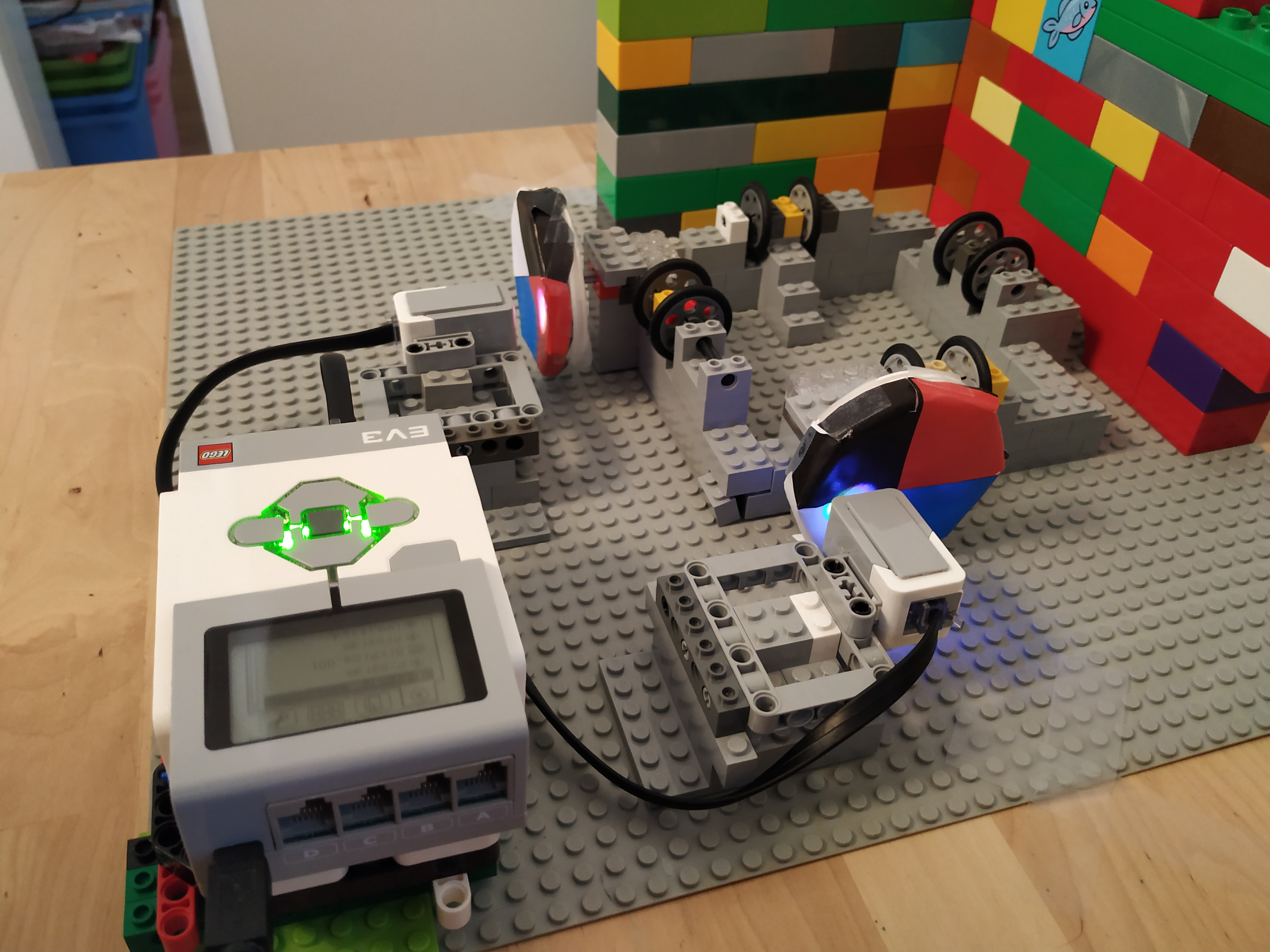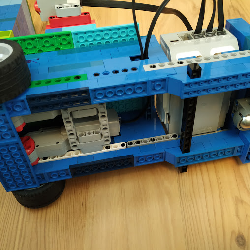Zakladna konstrukcia robota je zlozena z dvoch large servo motorov, ktore pohybuju dve kolesa a pri nich je upevnena EV3 kocka.