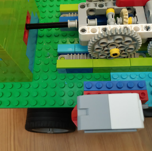 Medium servo motor sa na kolajniciach pohybuje dopredu alebo dozadu a na nom je pripojena lego oska ktora sa vie vysuvat.