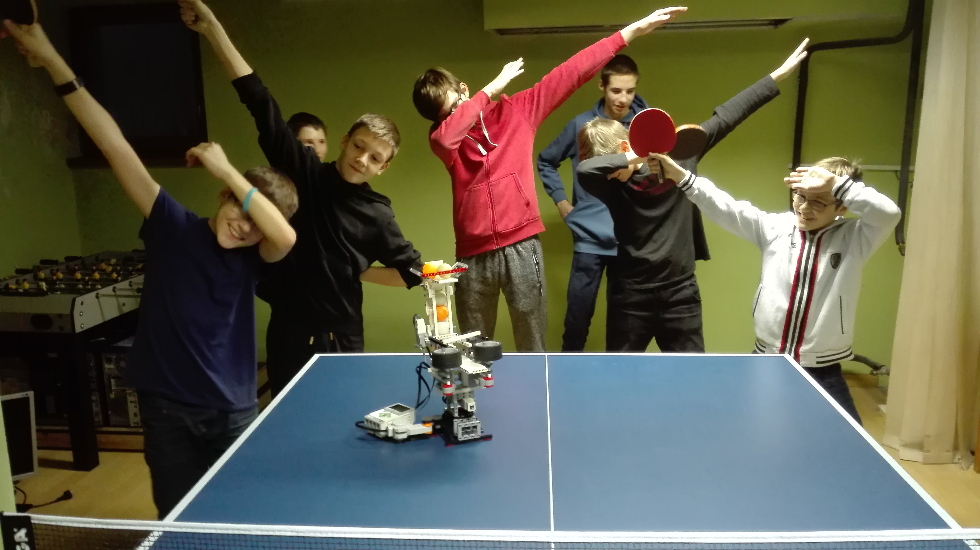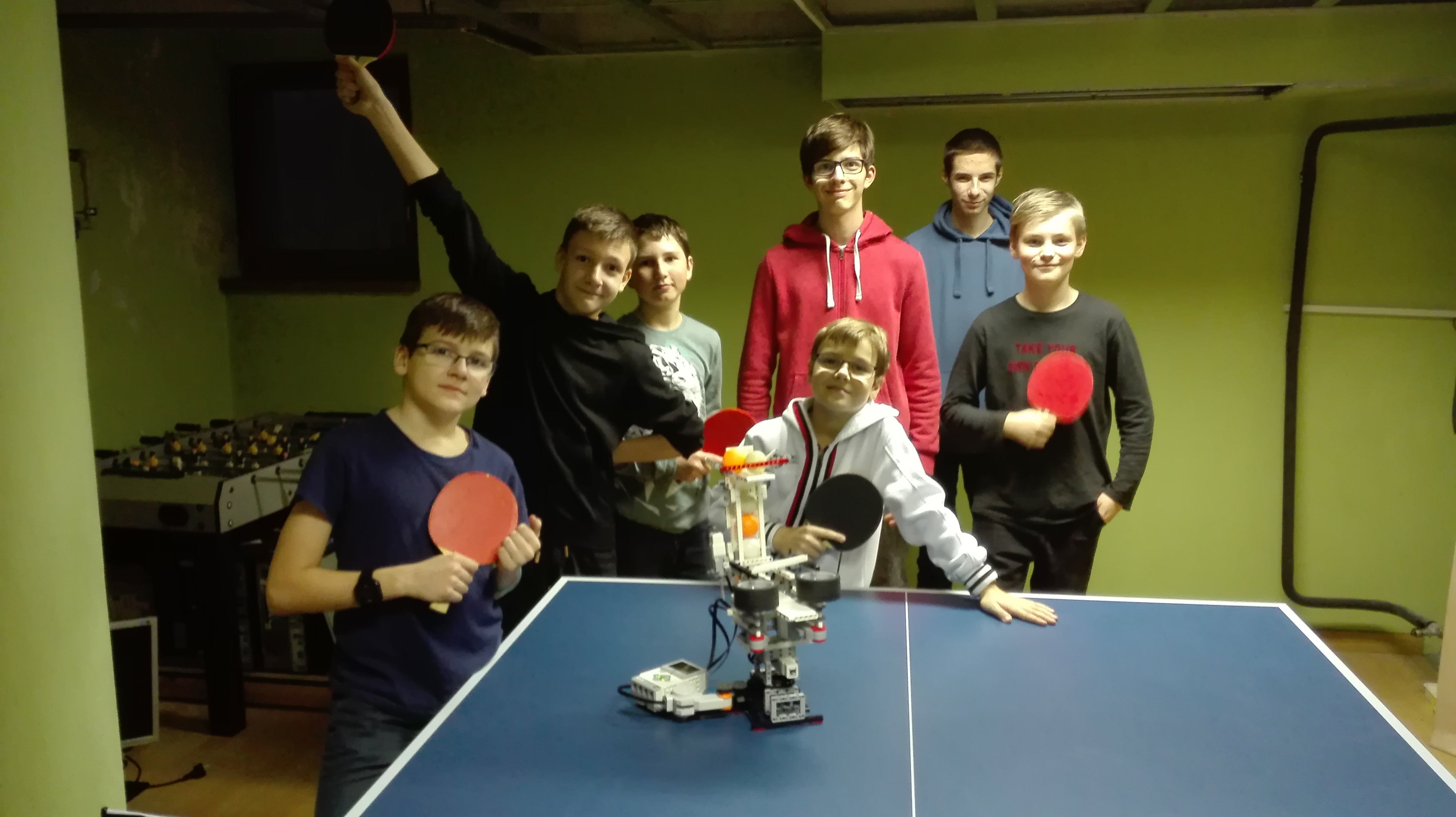 Tak po tomto videu by chcel byť členom Vášho klubu každý! :-) Rozhodcovia: 1. Za úlohu stolný tenis získavate 3b. Zostrojili ste autonómneho robota, ktorý dokáže bez problémov vystrelovať loptičky za sieť stola a vystrelovať ich do rôznych strán. Robot má zabudovaný zásobník na loptičky, ktoré miestami vystrelovali 2 bezprostredne po sebe - toto by trebalo ešte doladiť :) 2. Veľmi dobre spracované riešenie úlohy. Chválim, že robot sa dal reálne použiť na trénovanie hry, čo je zobrazené aj na videu. 3. Nemám čo dodať. Super riešenie, vidno, že ste ho naozaj aj využili. Paráda, veľmi sa mi to páči! Aj fotka tímu je super. Dab musí byť... 4. Veľmi pekné riešenie. Vystreľovacie zariadenie spĺňa všetko, čo by som od neho očakávala (zásobník, vystreľovanie umožňujúce hru, (náhodné) vystreľovanie do rôznych smerov). Potenciál na zlepšenie by som videla v zásobníku, ktorý by mohol mať väčšiu kapacitu.