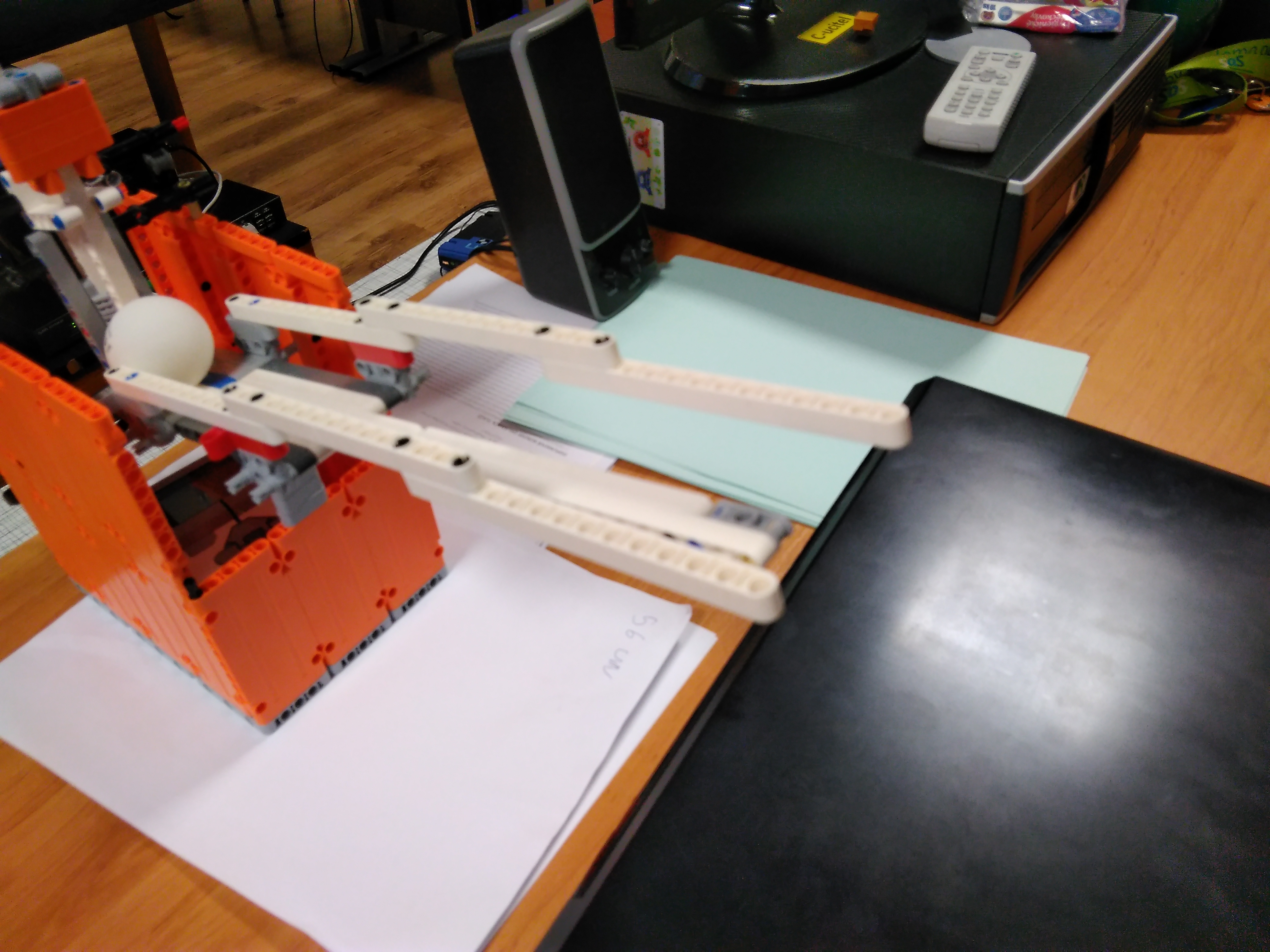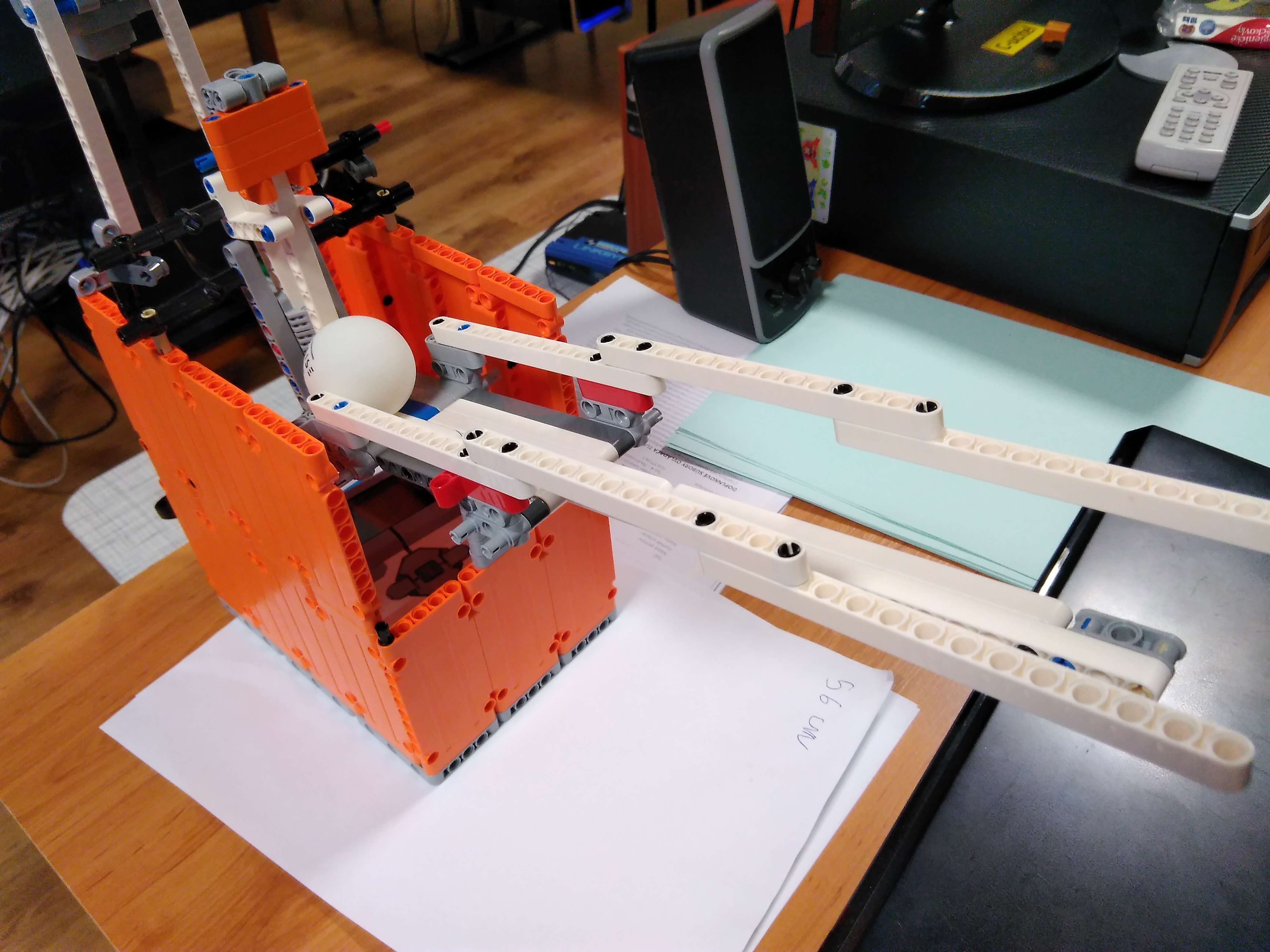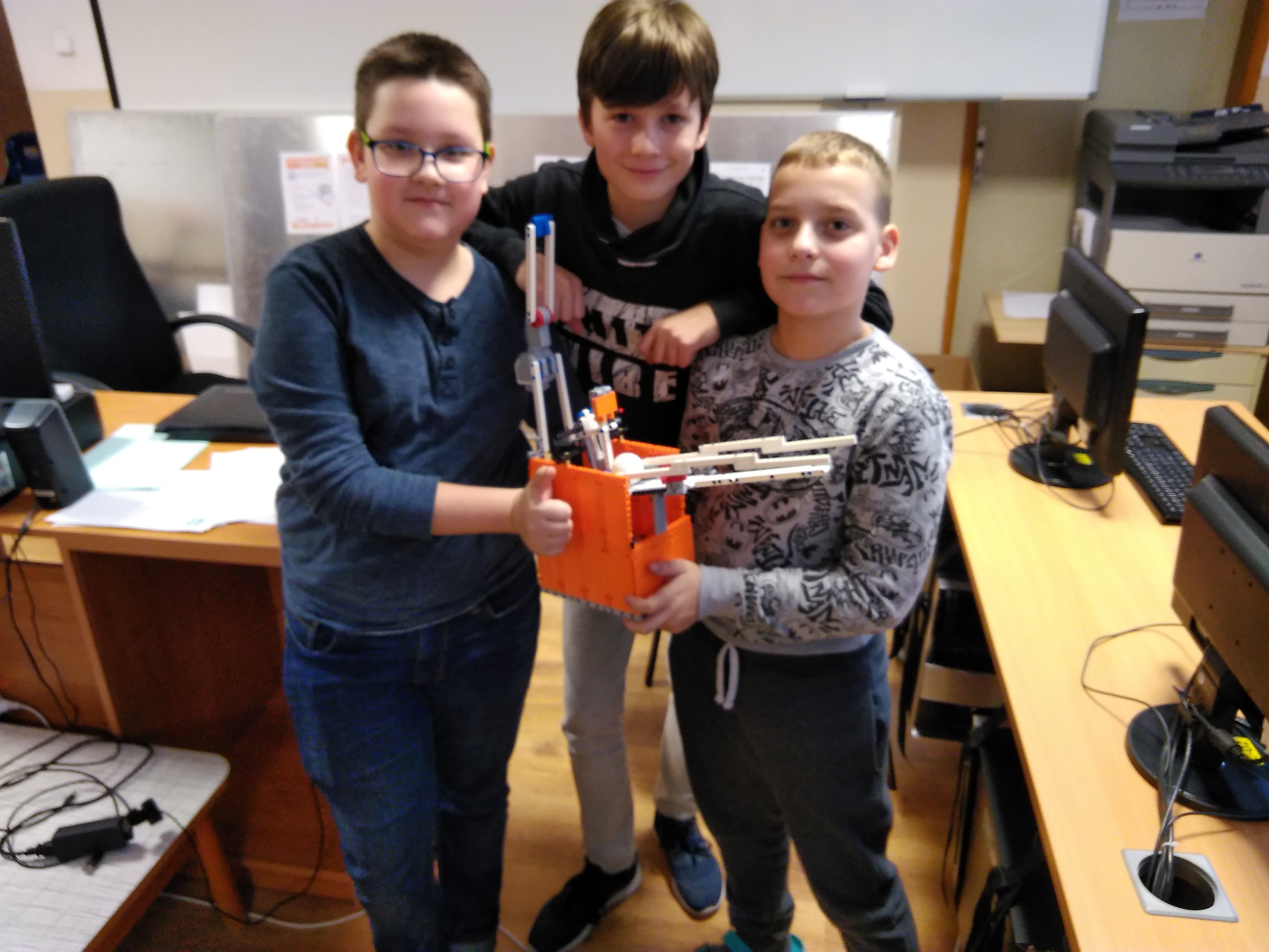 Ďakujeme, máme veľkú radosť. V tomto prípade už naozaj nikto nemôže tvrdiť, že by roboty brali ľuďom prácu. Tu naozaj jedného robota obsluhujú traja pracovníci :-) Jaj, škoda, že ste nenašli ping-pongovú raketu. My sme za mladých čias hrávali ping-pong aj s učebnicou zemepisu (tak sa vtedy volala geografia), aj keď dnes si už uvedomujeme, že ku knihám sa treba správať slušne :-). Tešíme sa na ďalšie riešenia! 1. Za úlohu Stolný tenis získavate 2.8b. Zostrojený robot bez problémov prestrelí loptočky za sieť stola stolného tenisu. Pridávanie loptičky do zásobníka ako aj otáčanie robota je manuálne. Odporúčam popis k riešeniu písať podrobnejšie. 2. Robot vystreľuje loptičky do dostatočnej vzdialenosti. V rôznych smeroch ich vystreľuje len pri pootočení robota. 3. Výborná konštrukcia aj prevedenie, škoda len, že sa robot nenatáča samostatne do rozličných strán. To by už bol skvelý tréner. Pri popise konštrukcie múžete napísať aj viac ako jednu vetu. 4. Veľmi pekný pokus. Ak by sme ale chceli "profi" trenažér na vystreľovanie loptičiek pre hráčov, potrebovali by sme trošku silnejší dostrel, zásobník na loptičky dostatočnej kapacity, ako aj schopnosť autonómne sa otáčať do náhodných smerov. Netreba zabúdať na kvalitný opis riešenia. Veľa zdaru pri riešení ďalších úloh!